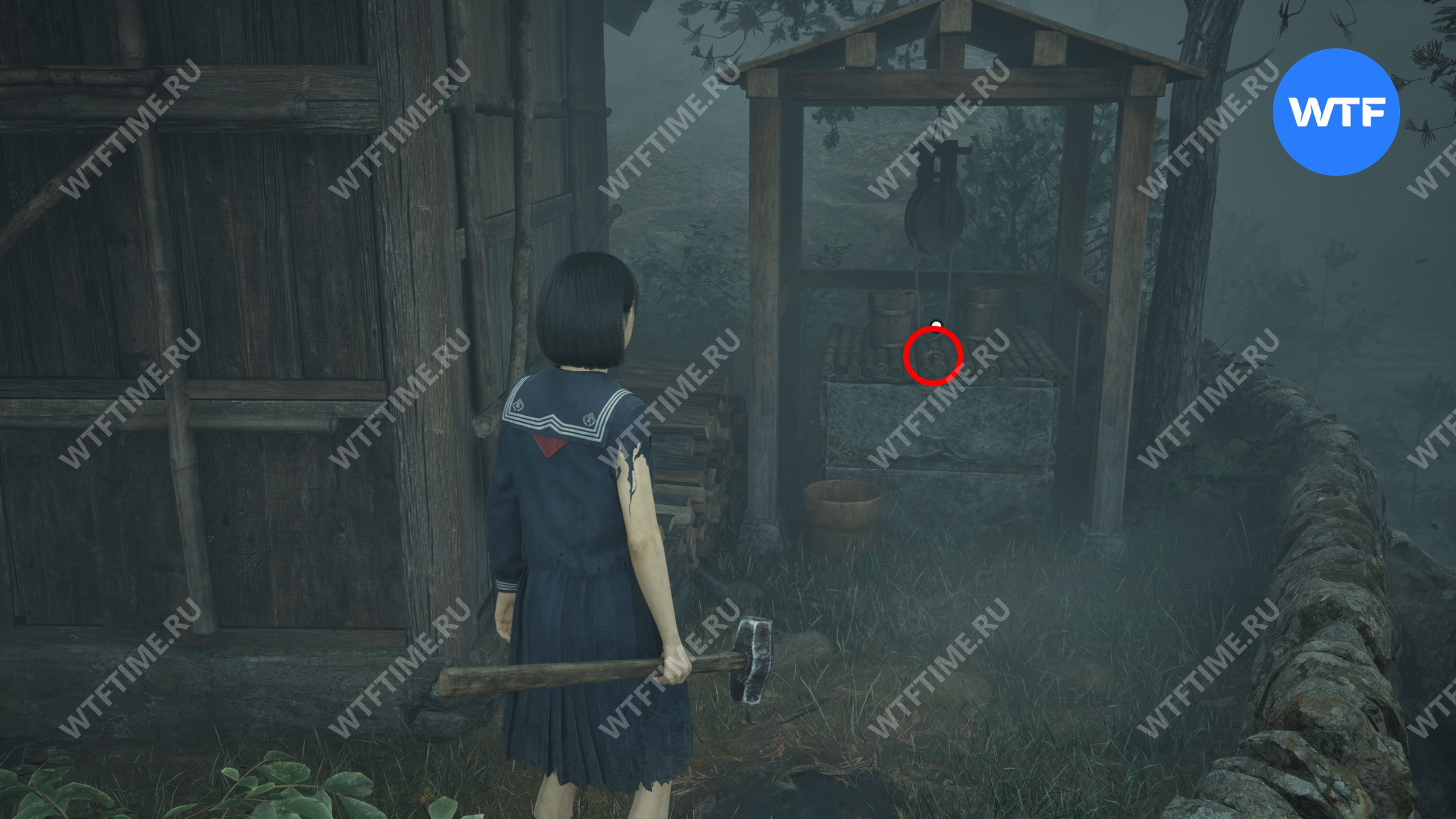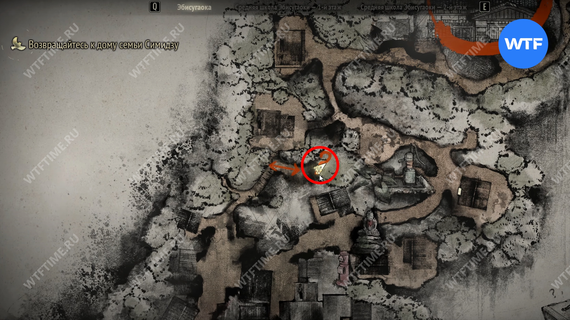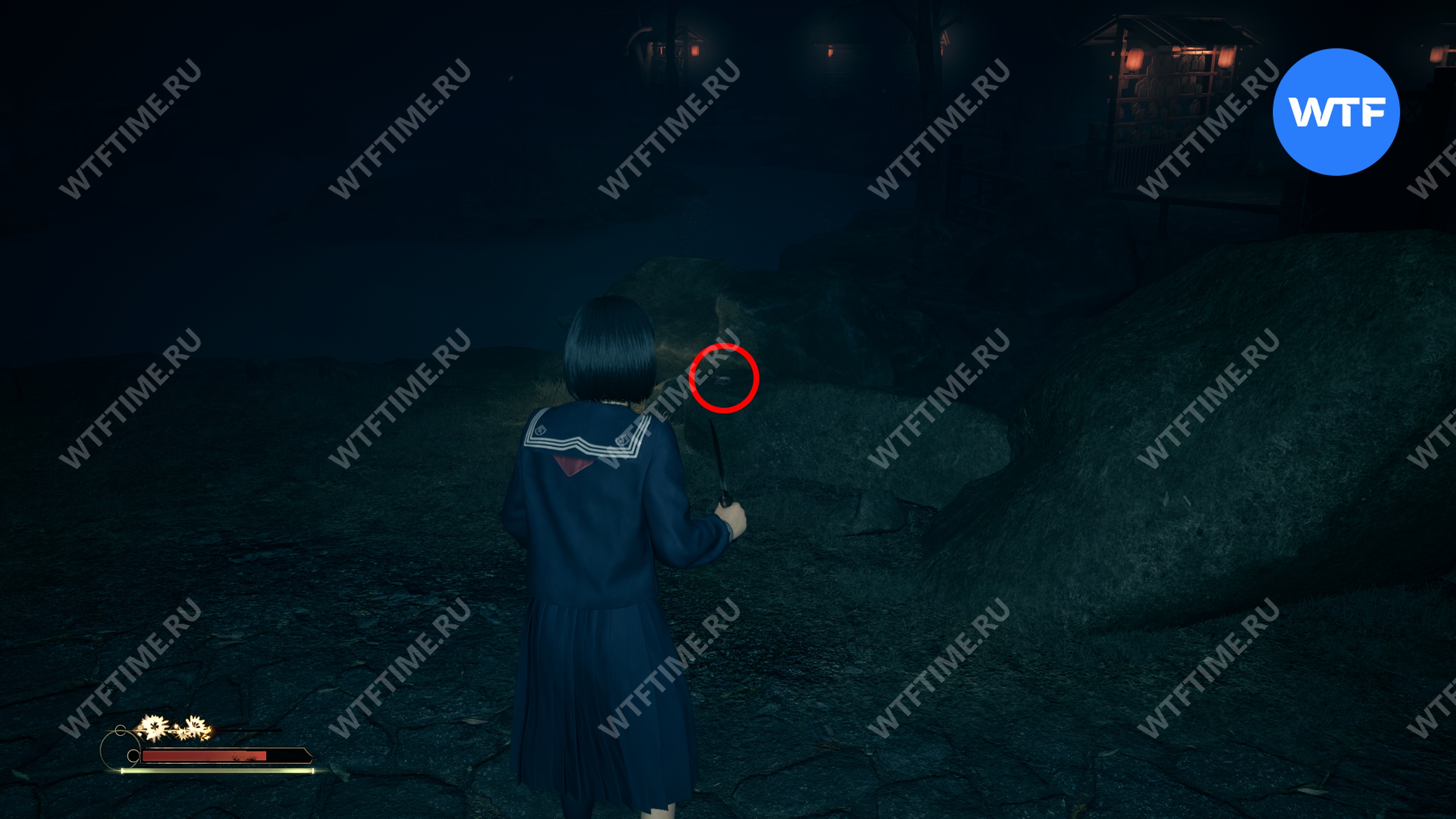Не входите пока в дом Сю и вместо этого вернитесь по дороге к святилищу хокора. Примерно на середине пути слева от вас вы увидите статую Дзидзо. Положите к неё треснувшую жаровню хибати, чтобы продвинуть головоломку со Священным мечом.