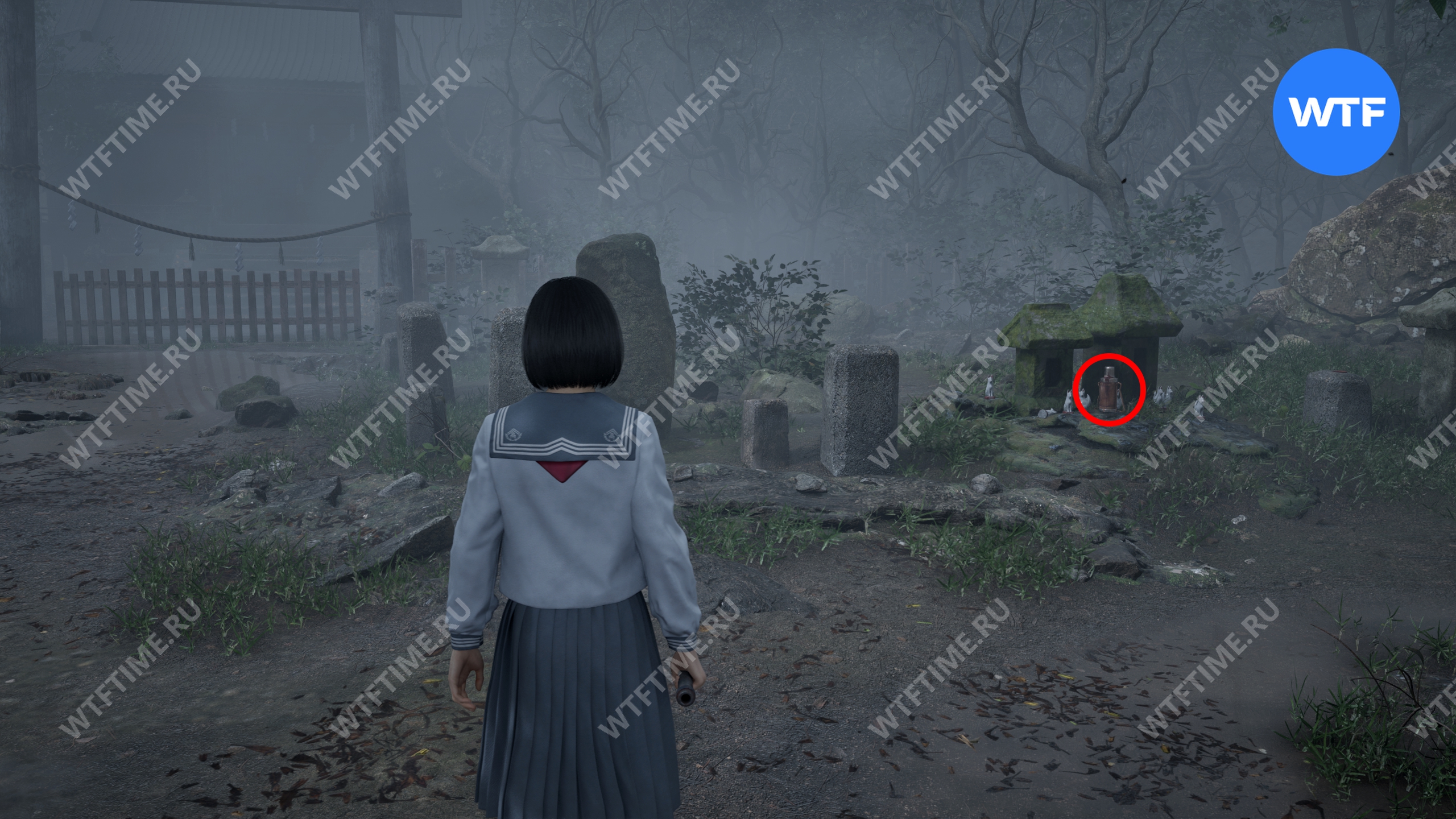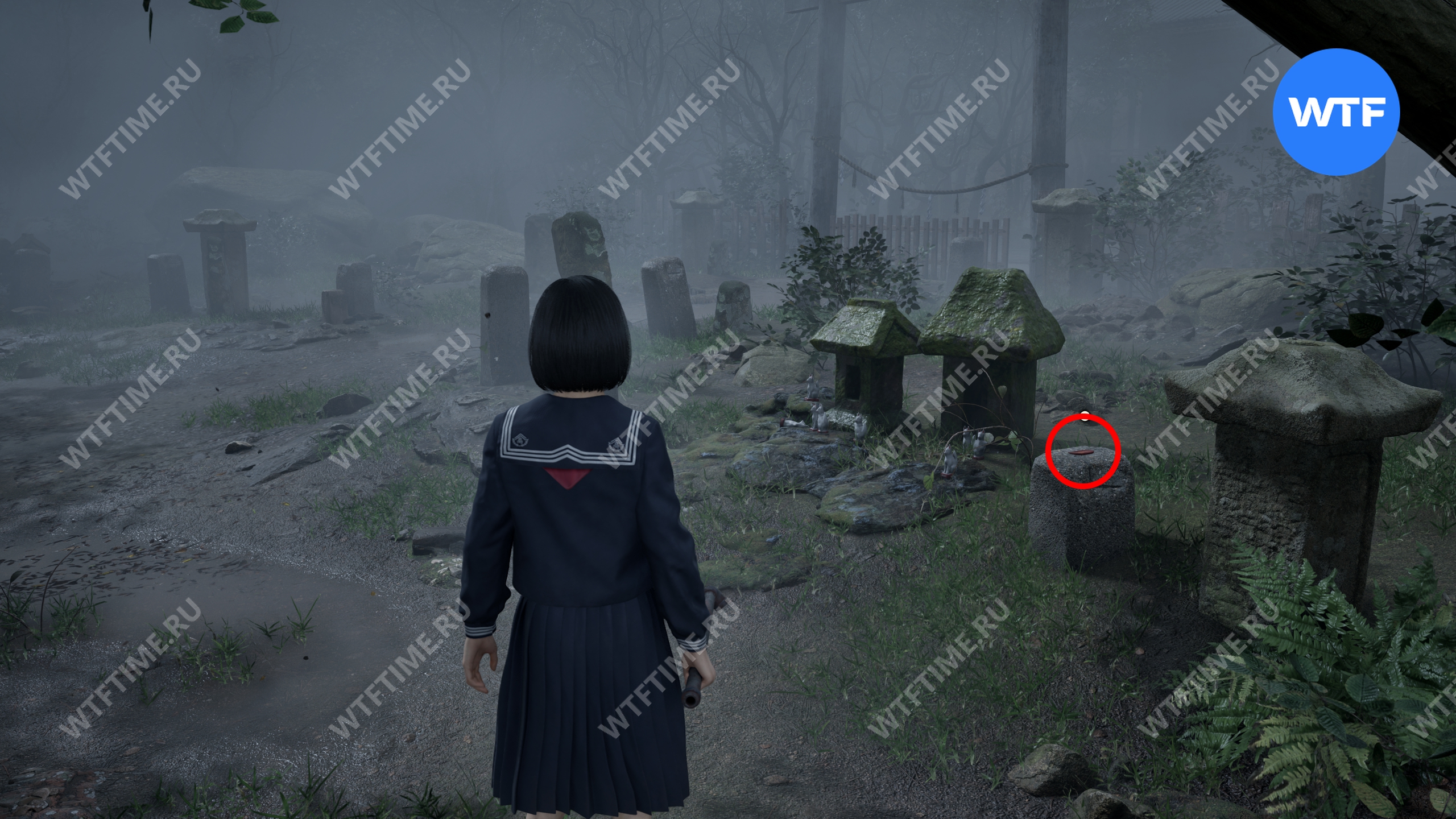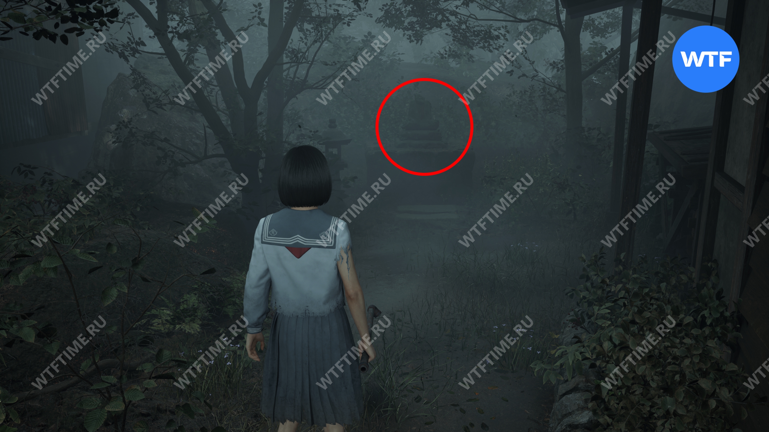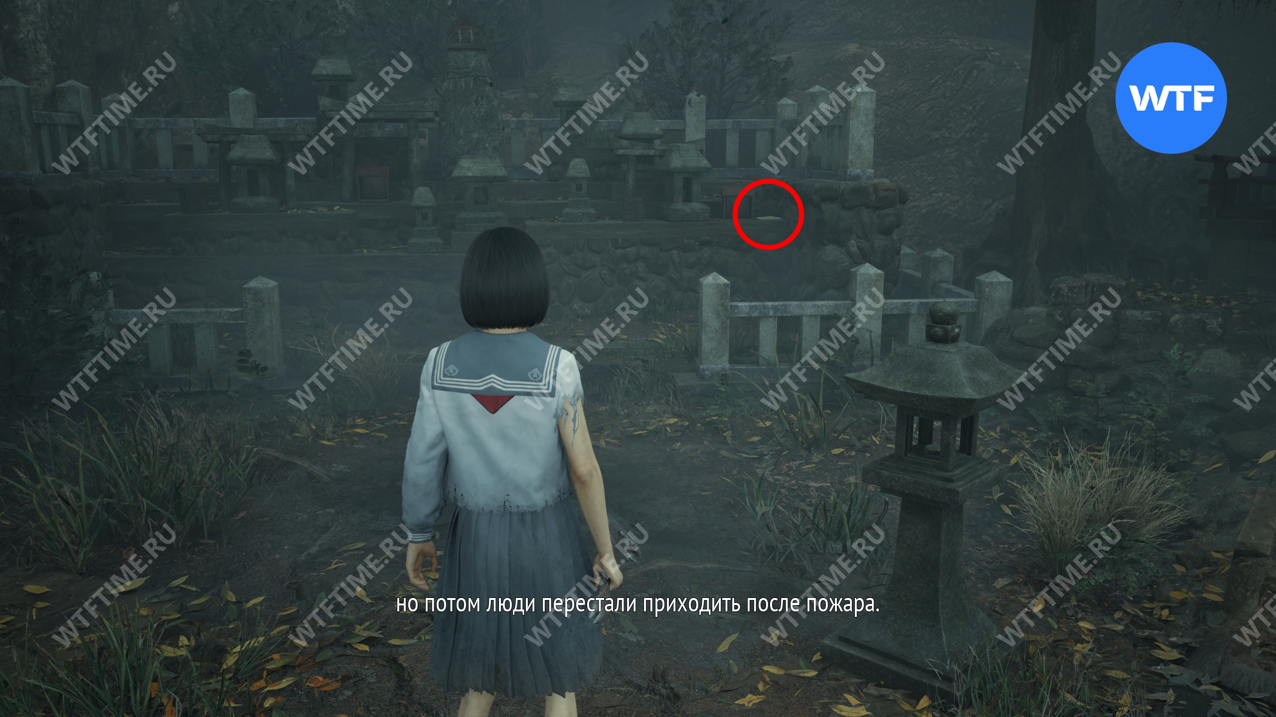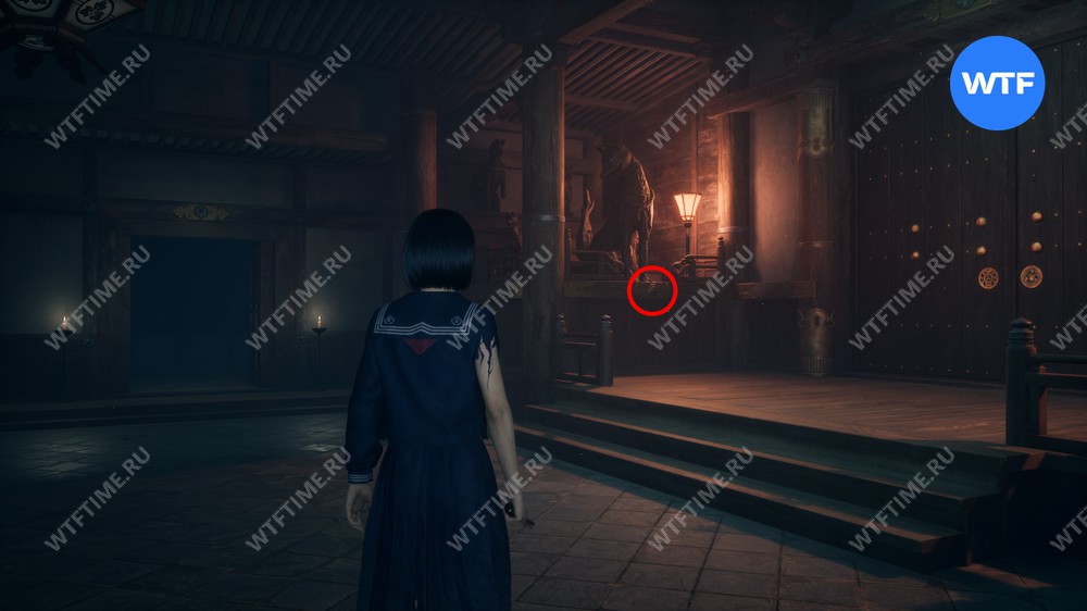 После этого поднимитесь по лестнице и идите направо. Там вы найдете последнюю дощечку эма, а также древнюю статую Дзидзо. Положите к ней свою брошь — это позволит вам достичь 4 концовки, а также получить достижение «Подарок, который я не могу принять».