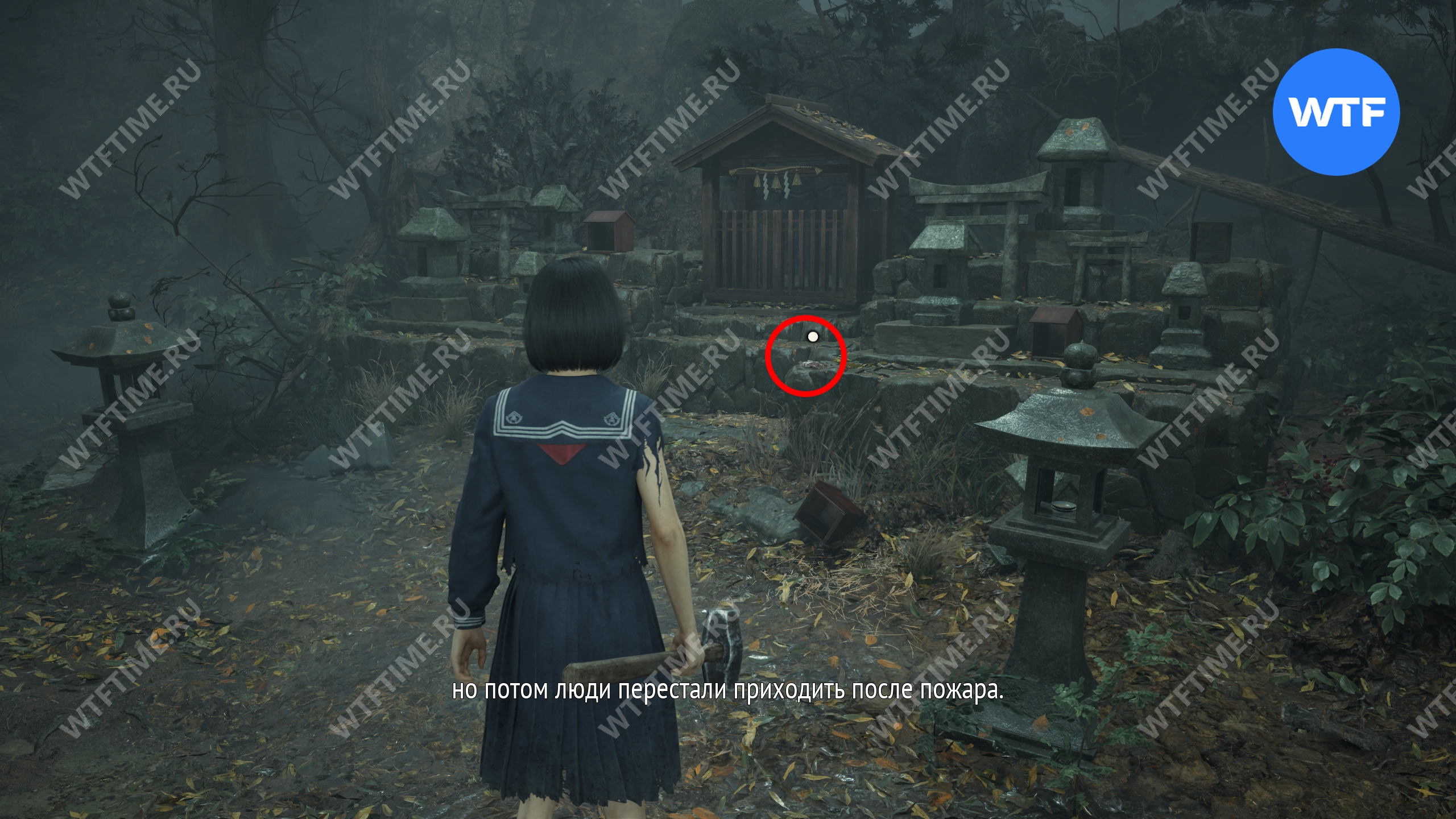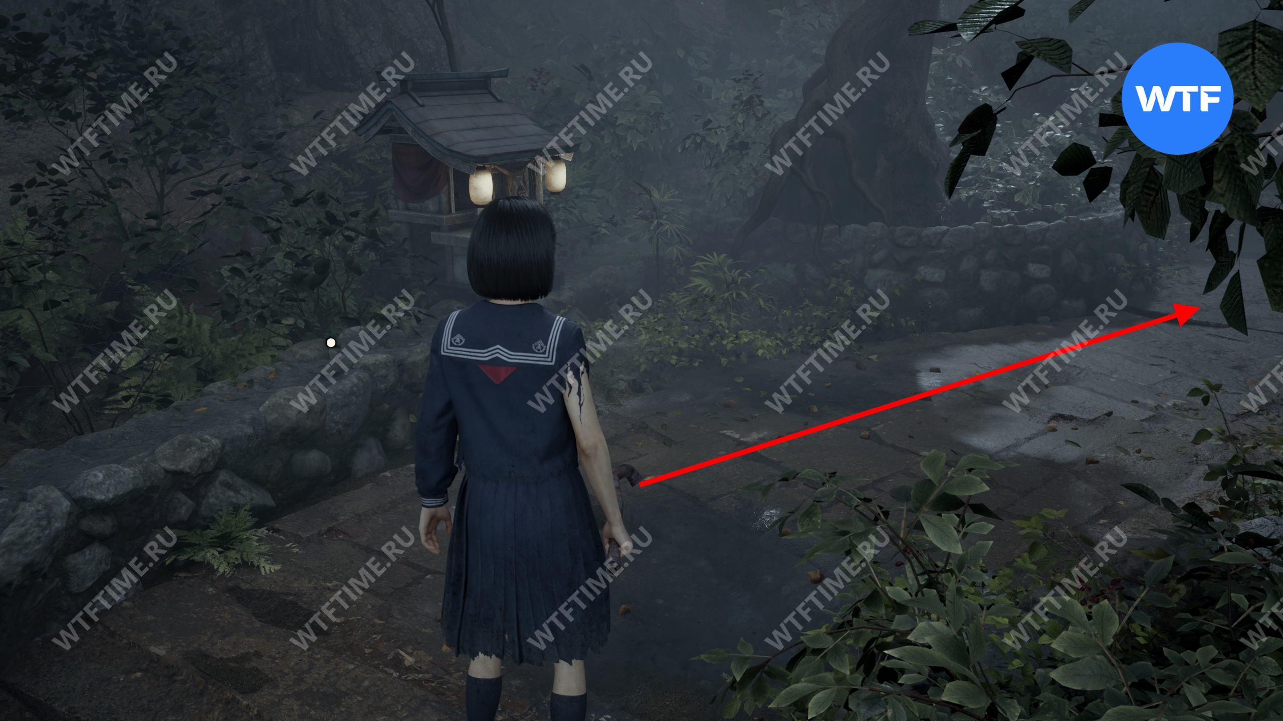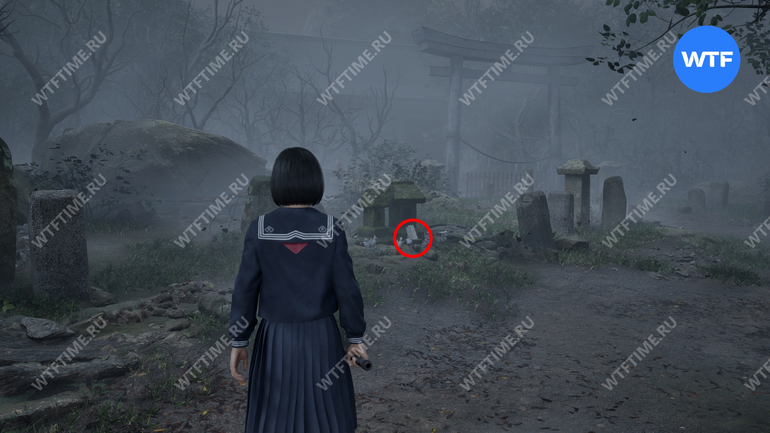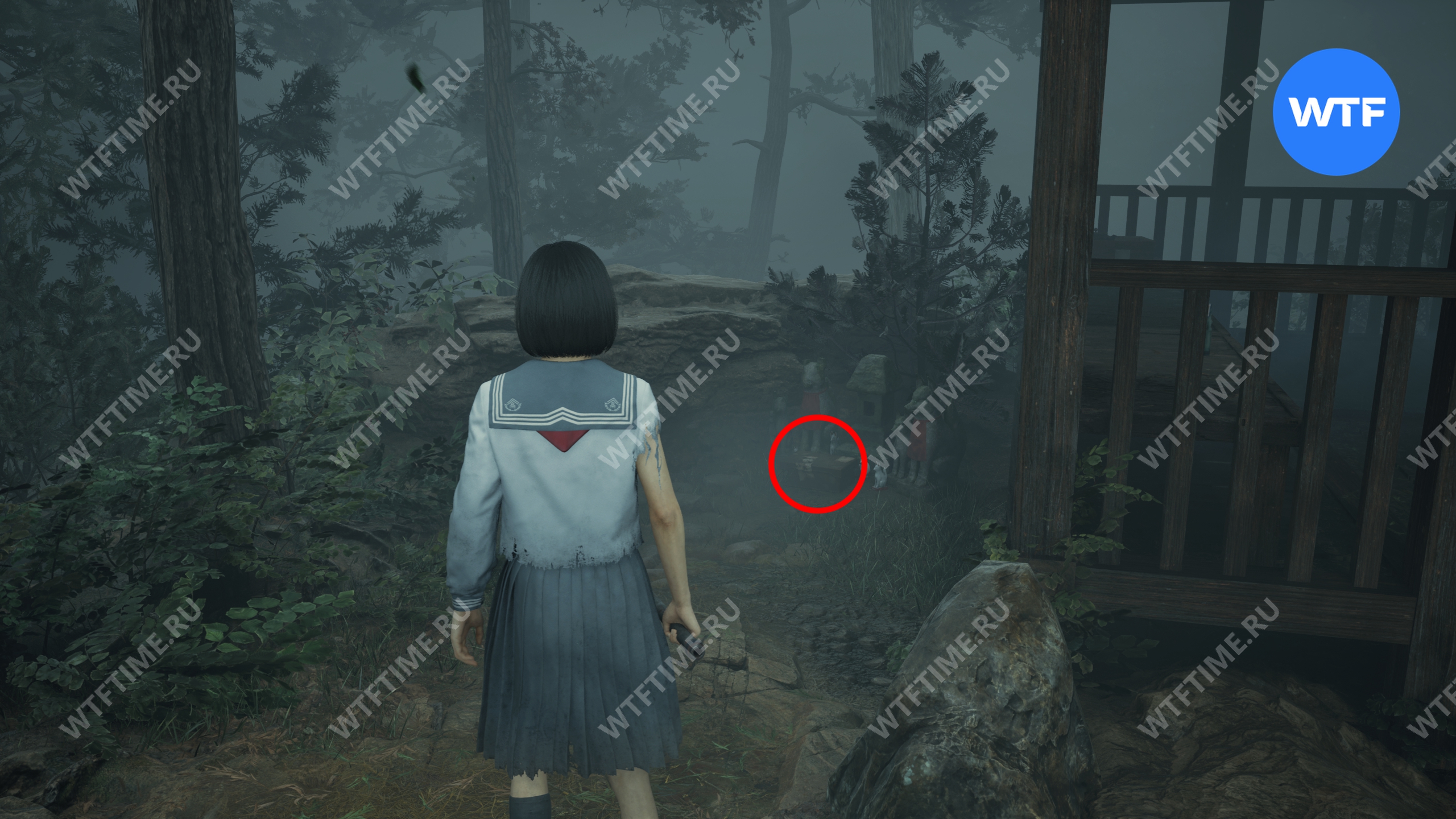 После этого поднимитесь по лестнице и идите направо. Там вы найдете последнюю дощечку эма, а также древнюю статую Дзидзо. Положите к ней свою брошь — это позволит вам достичь 4 концовки, а также получить достижение «Подарок, который я не могу принять».
