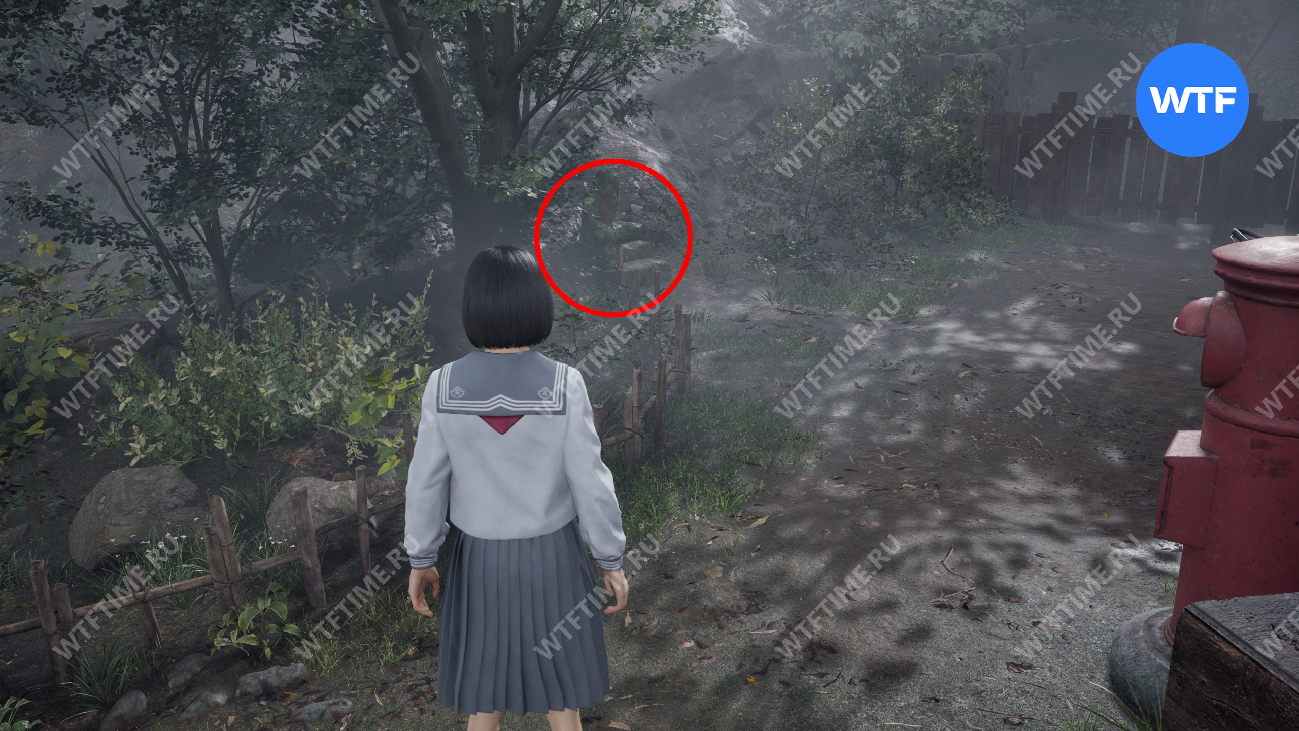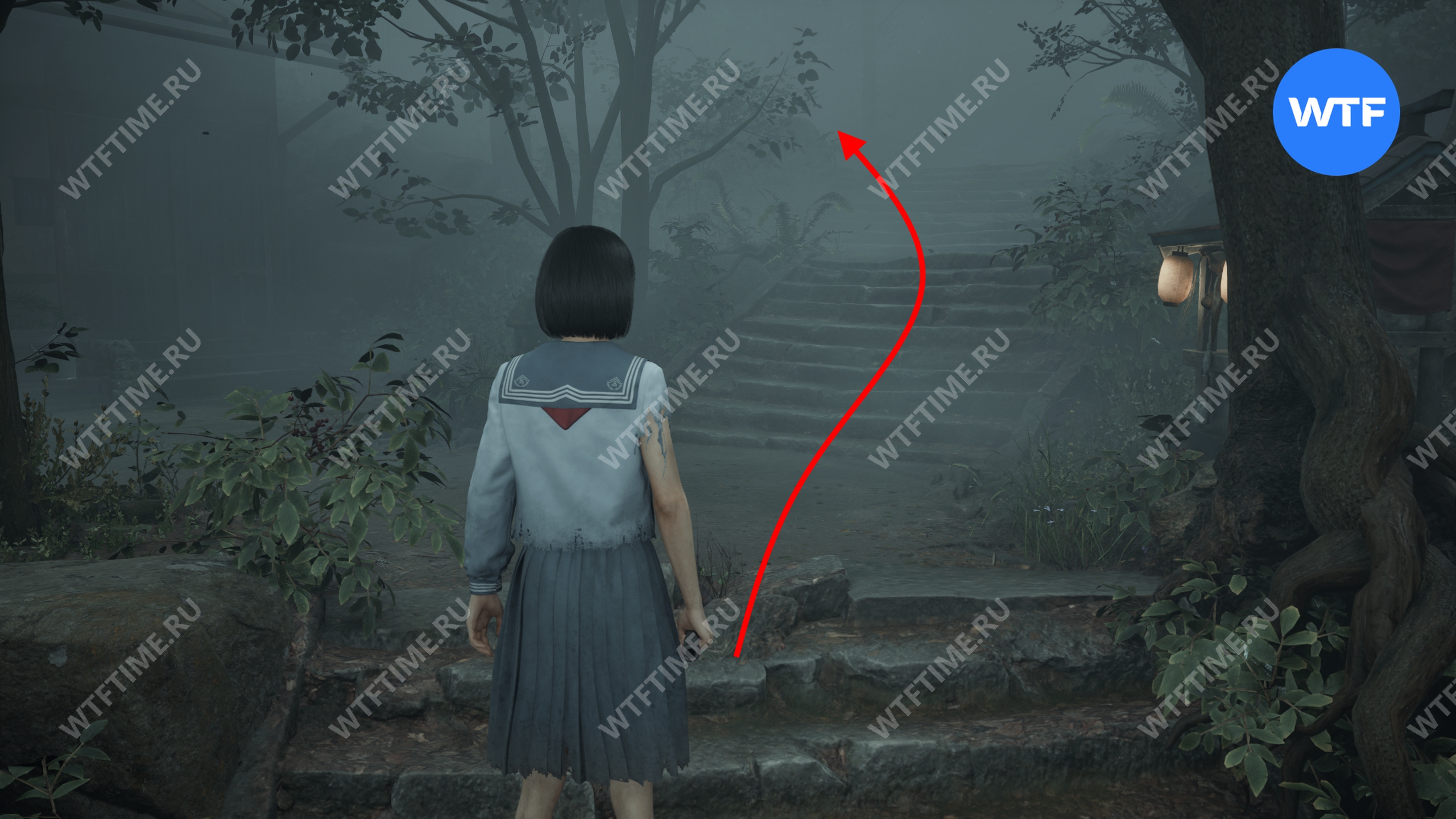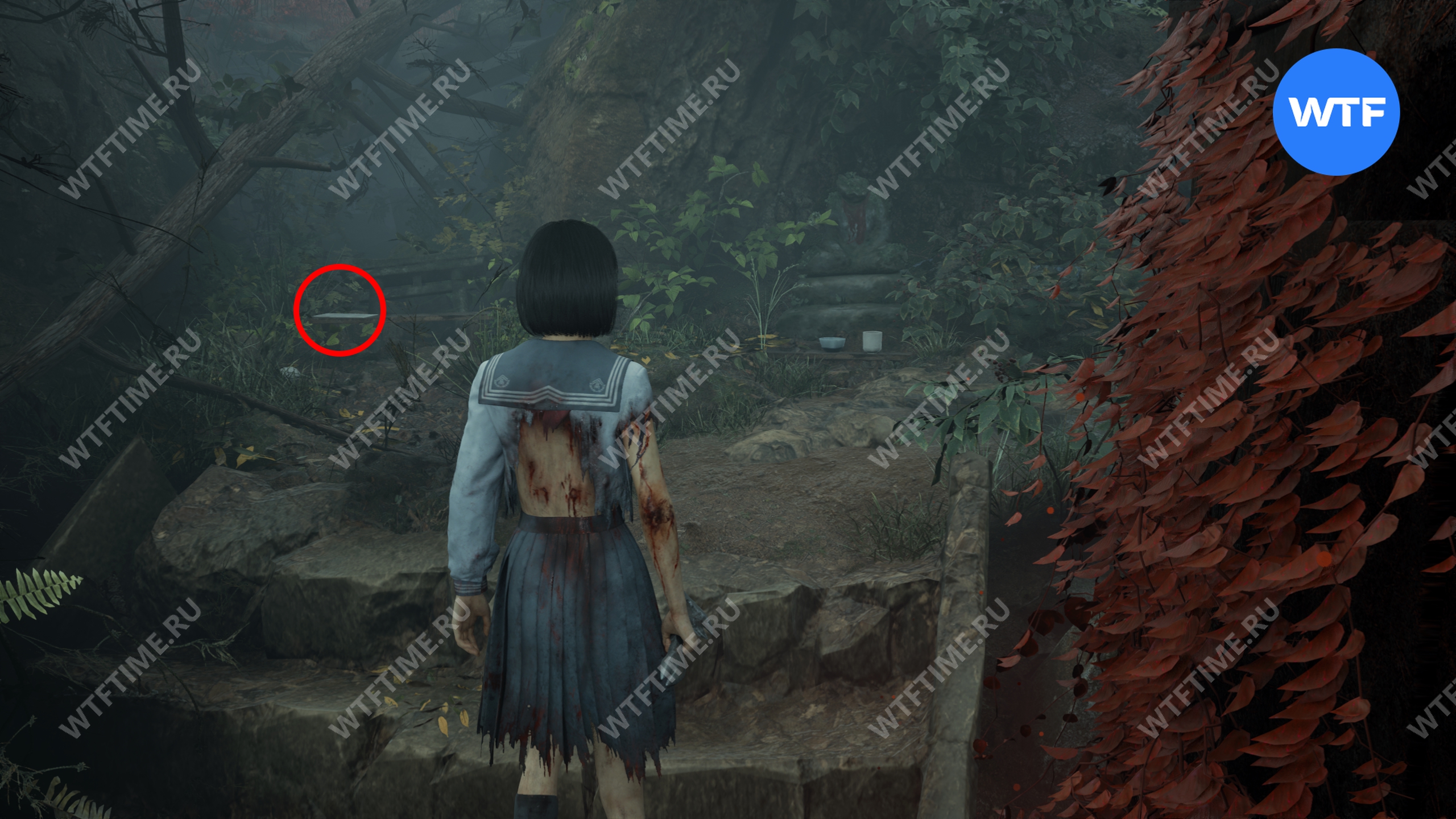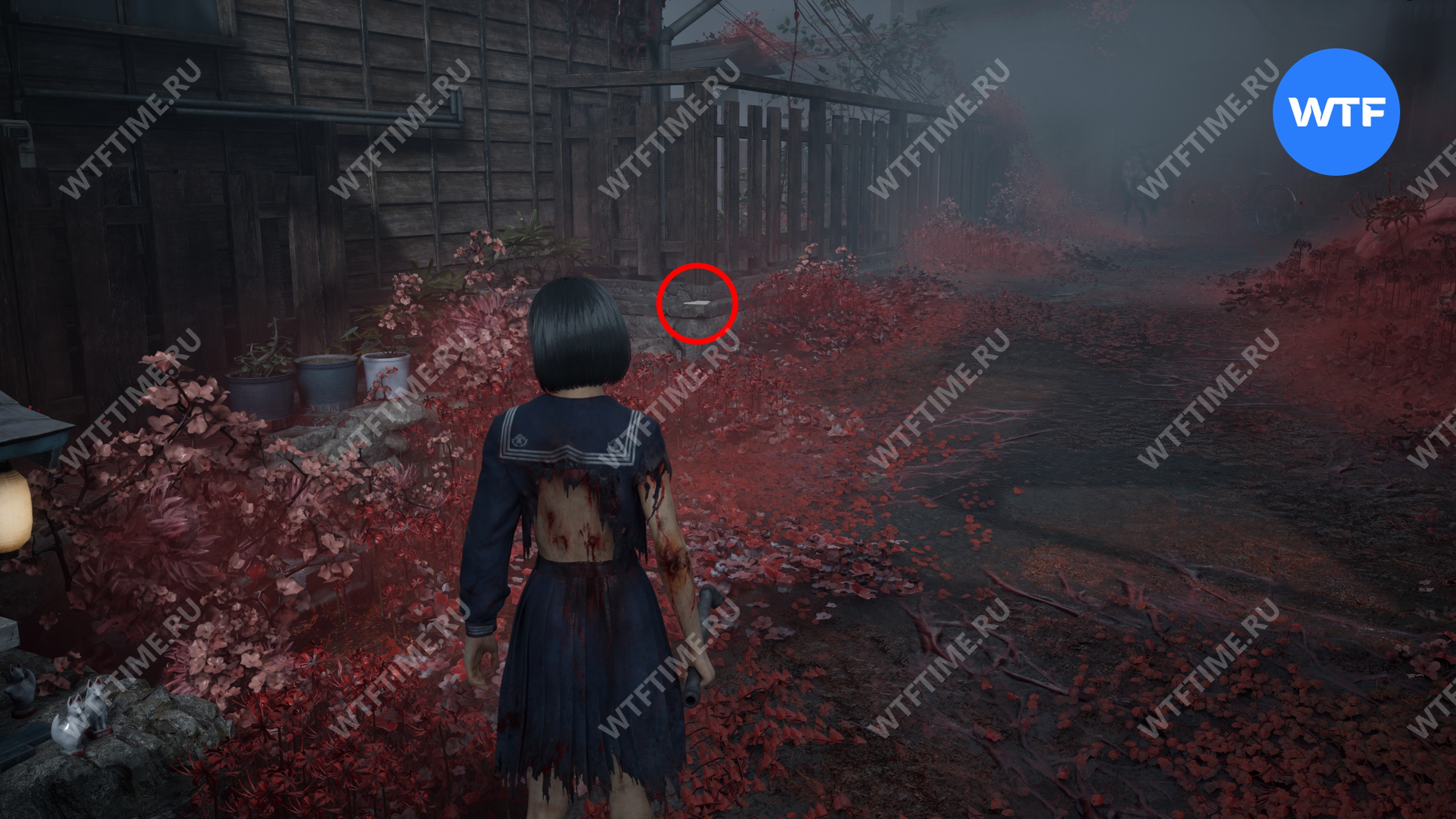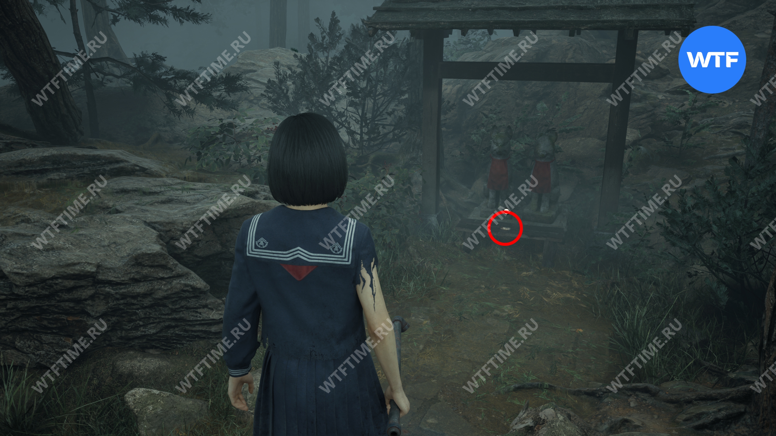 После этого поднимитесь по лестнице и идите направо. Там вы найдете последнюю дощечку эма, а также древнюю статую Дзидзо. Положите к ней свою брошь — это позволит вам достичь 4 концовки, а также получить достижение «Подарок, который я не могу принять».