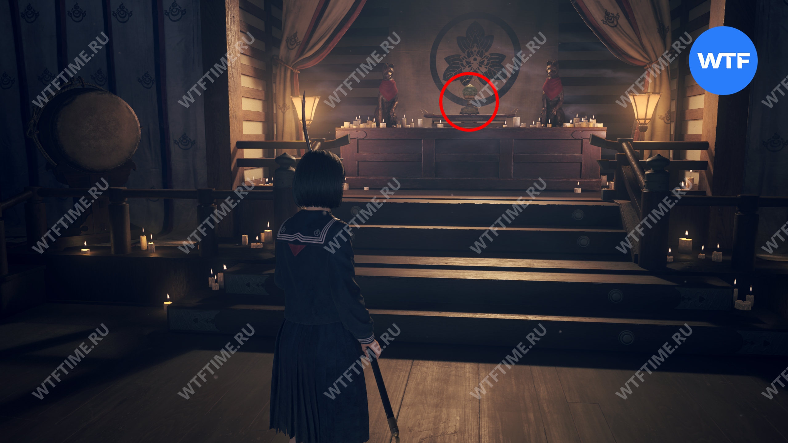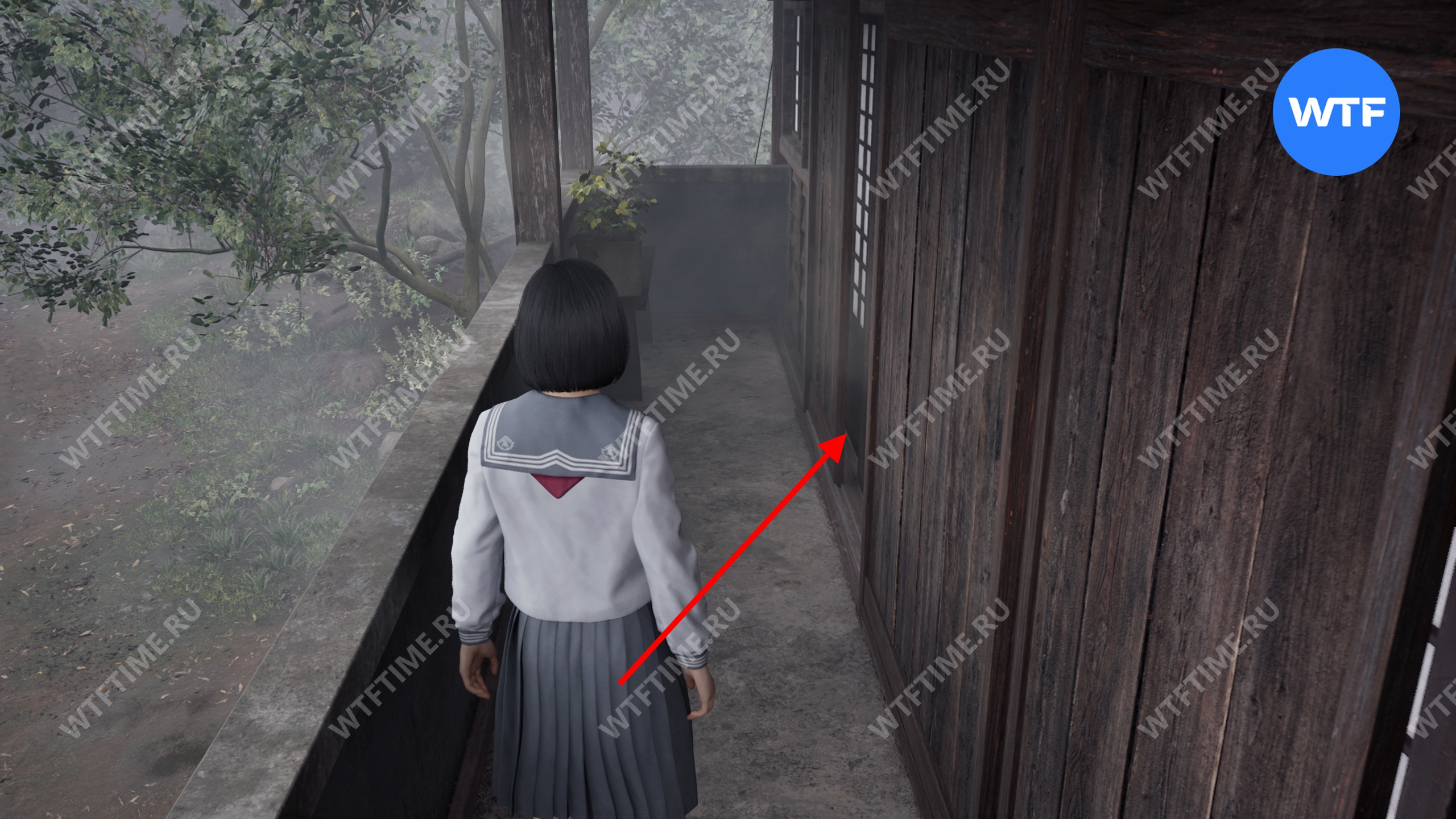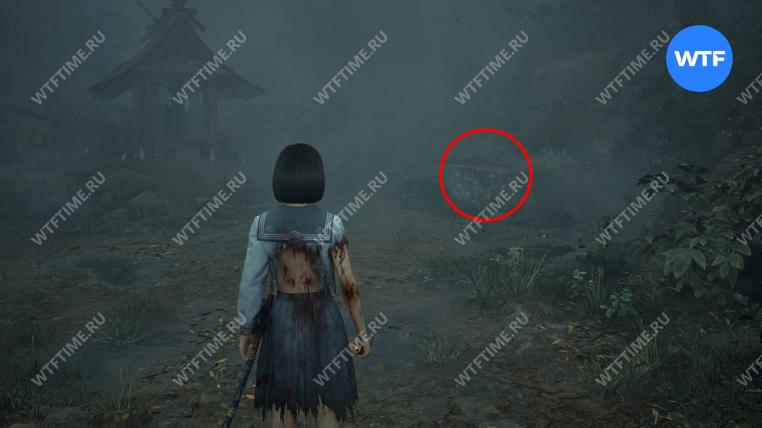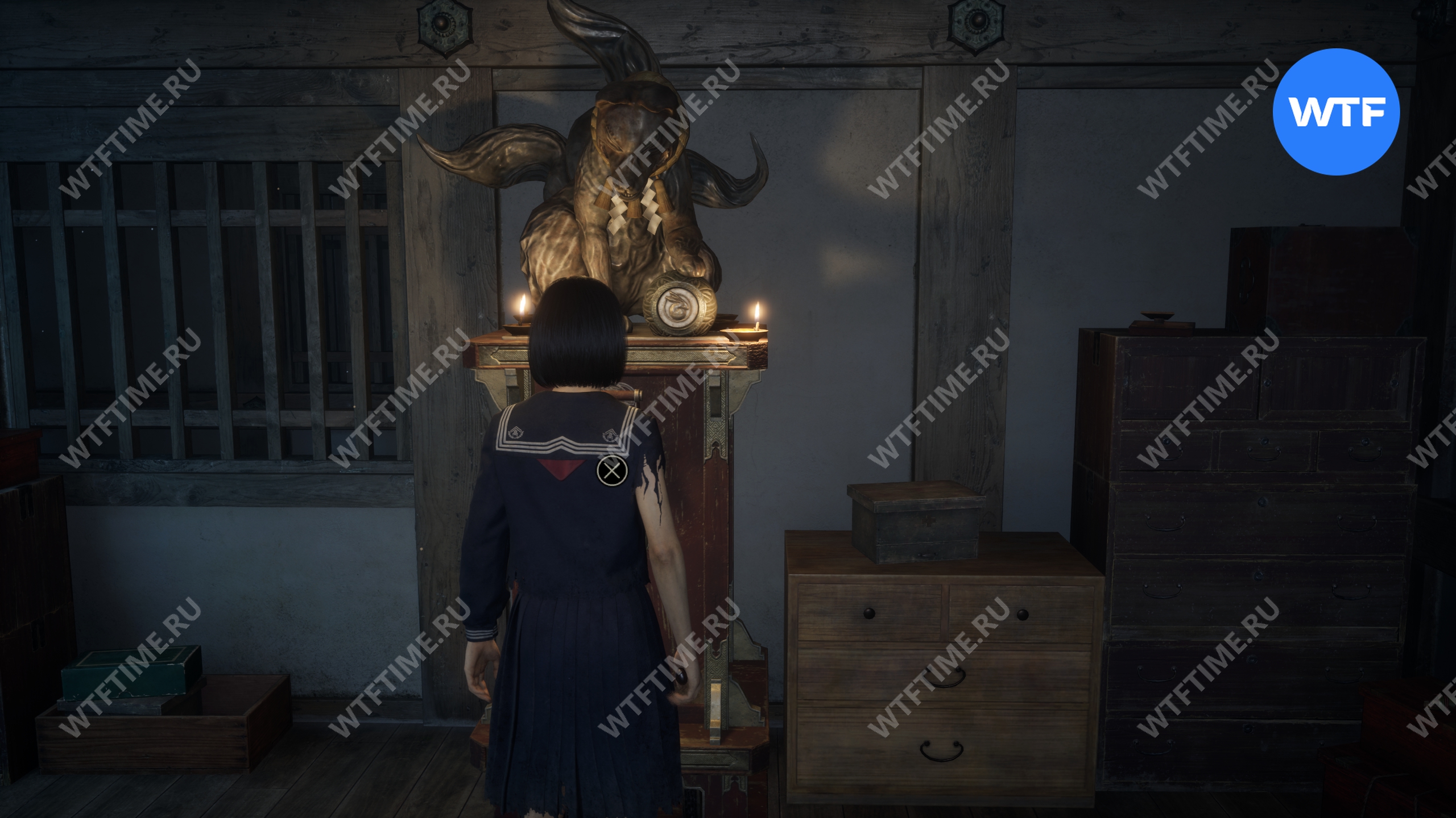 После этого поднимитесь по лестнице и идите направо. Там вы найдете последнюю дощечку эма, а также древнюю статую Дзидзо. Положите к ней свою брошь — это позволит вам достичь 4 концовки, а также получить достижение «Подарок, который я не могу принять».