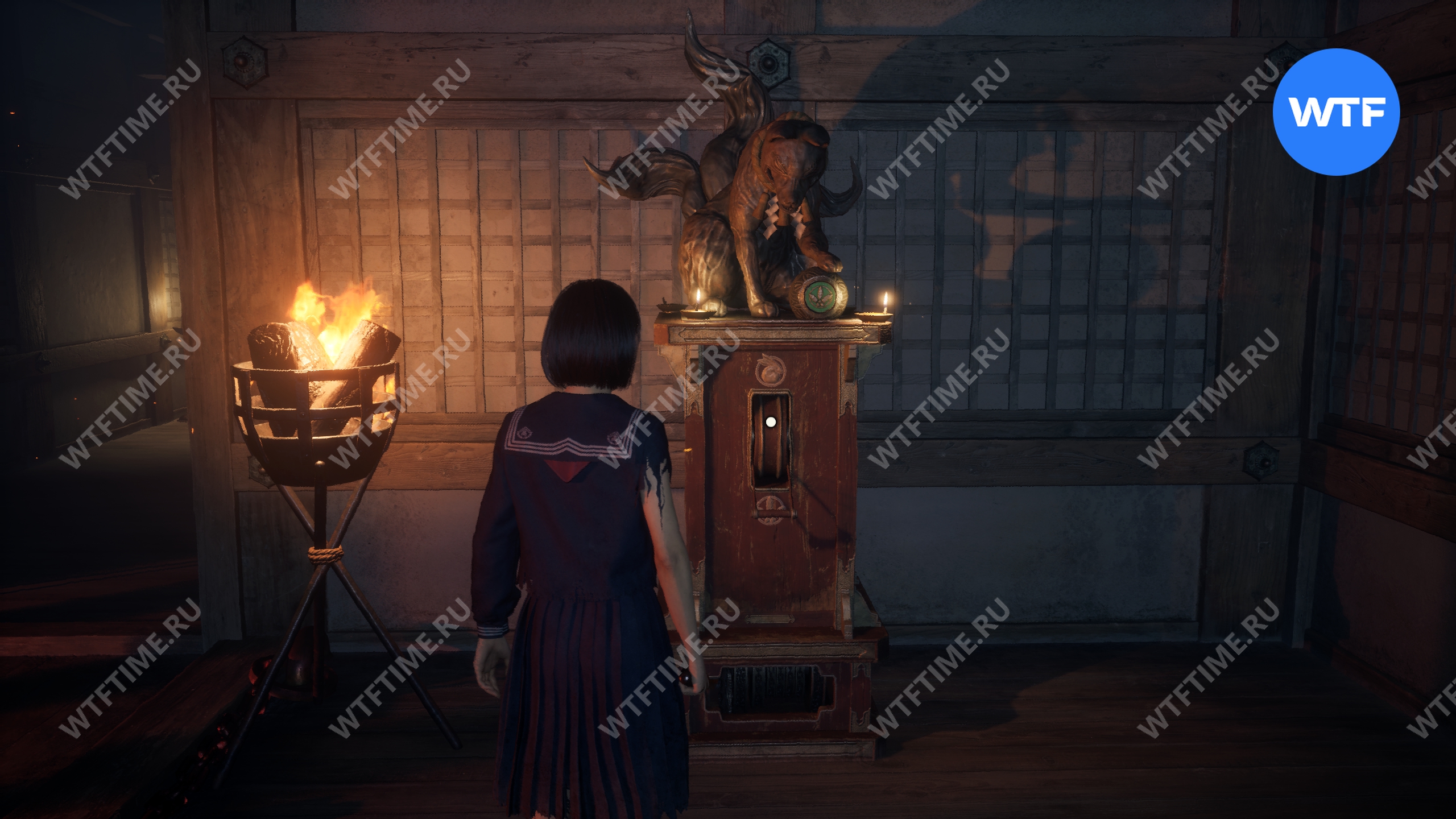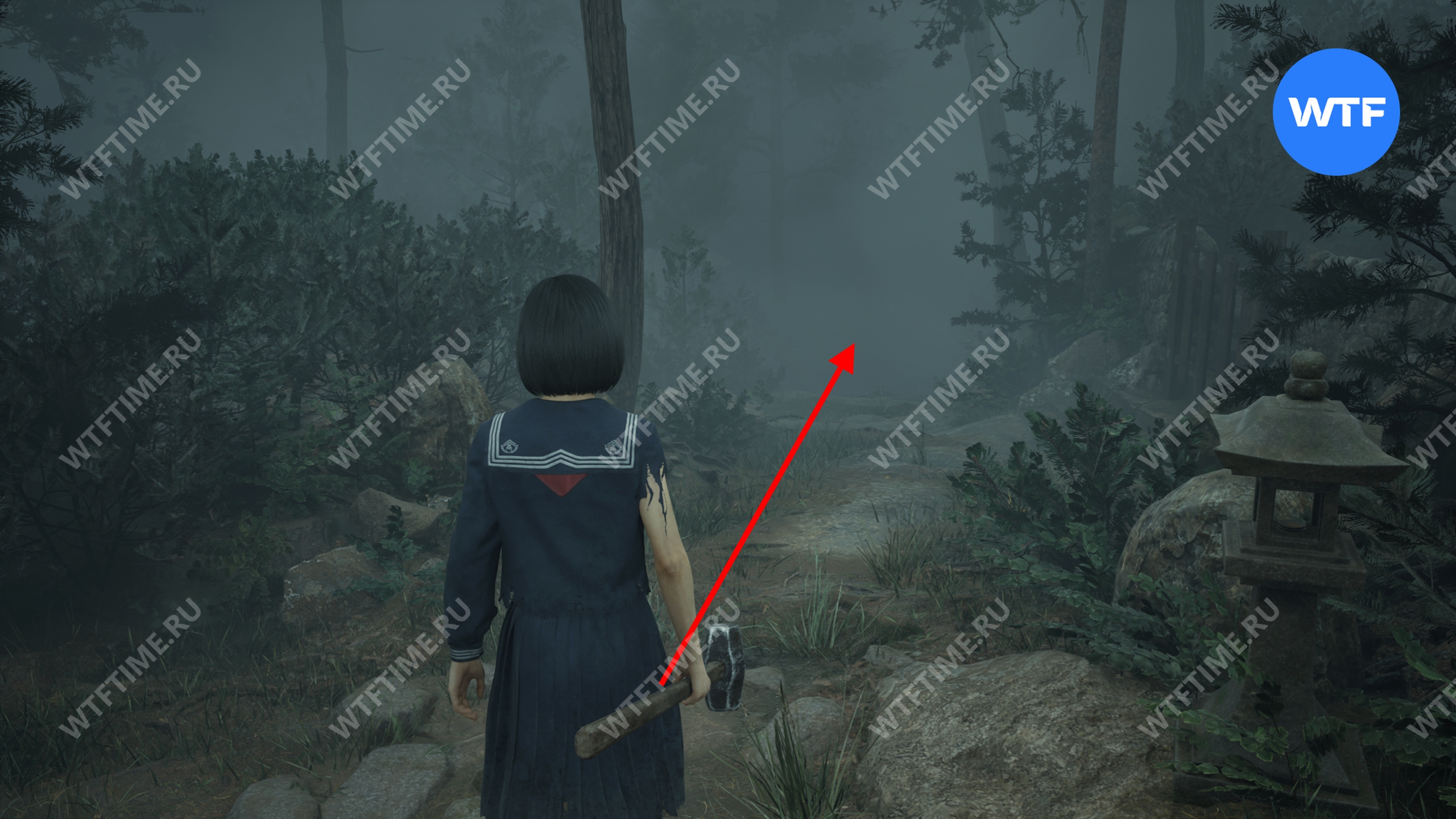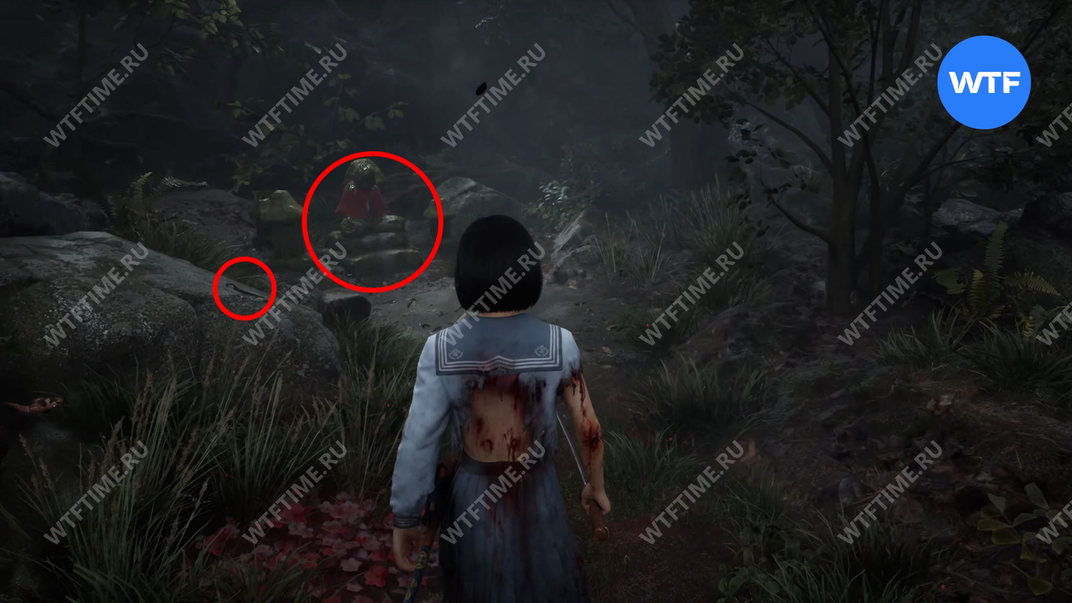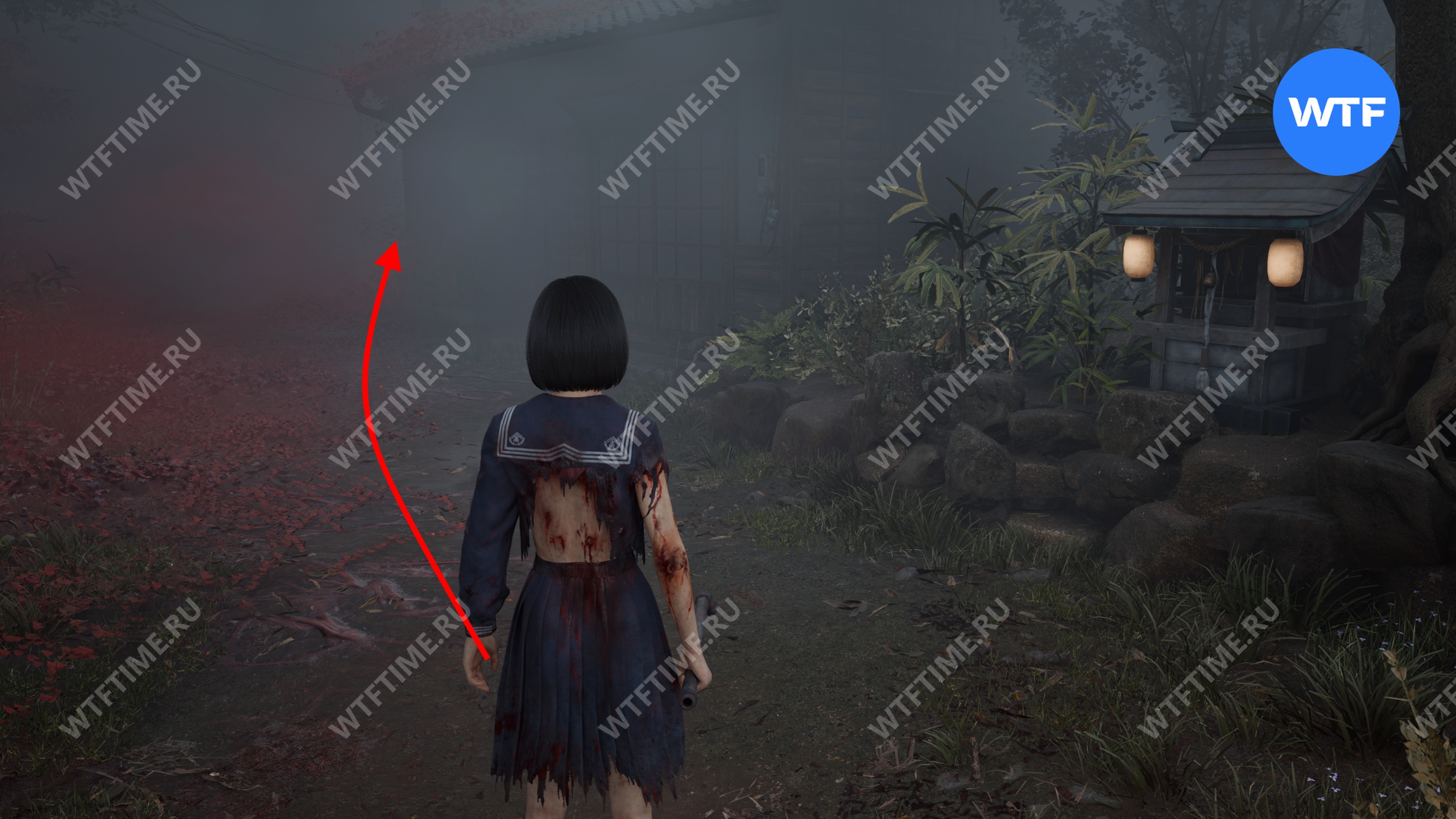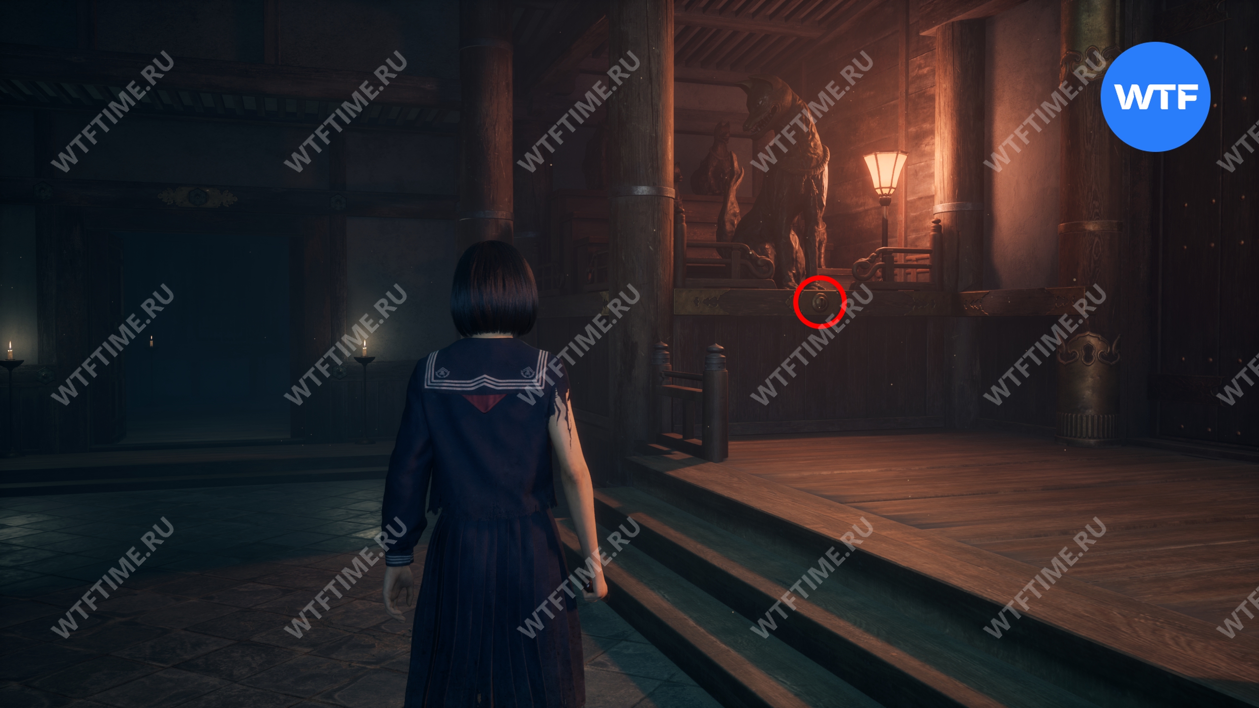 После этого поднимитесь по лестнице и идите направо. Там вы найдете последнюю дощечку эма, а также древнюю статую Дзидзо. Положите к ней свою брошь — это позволит вам достичь 4 концовки, а также получить достижение «Подарок, который я не могу принять».