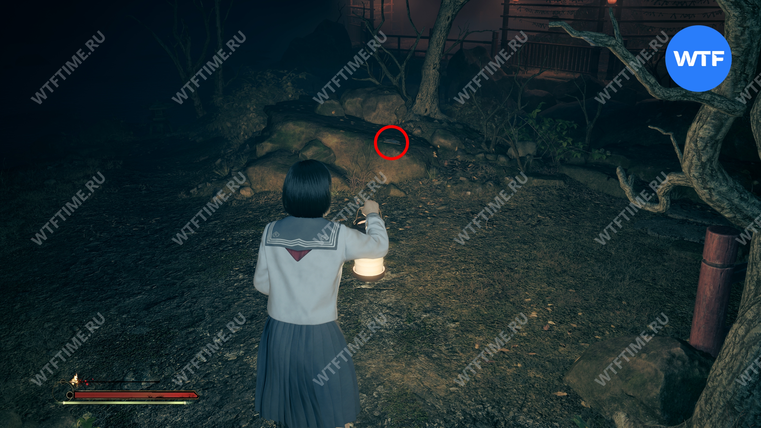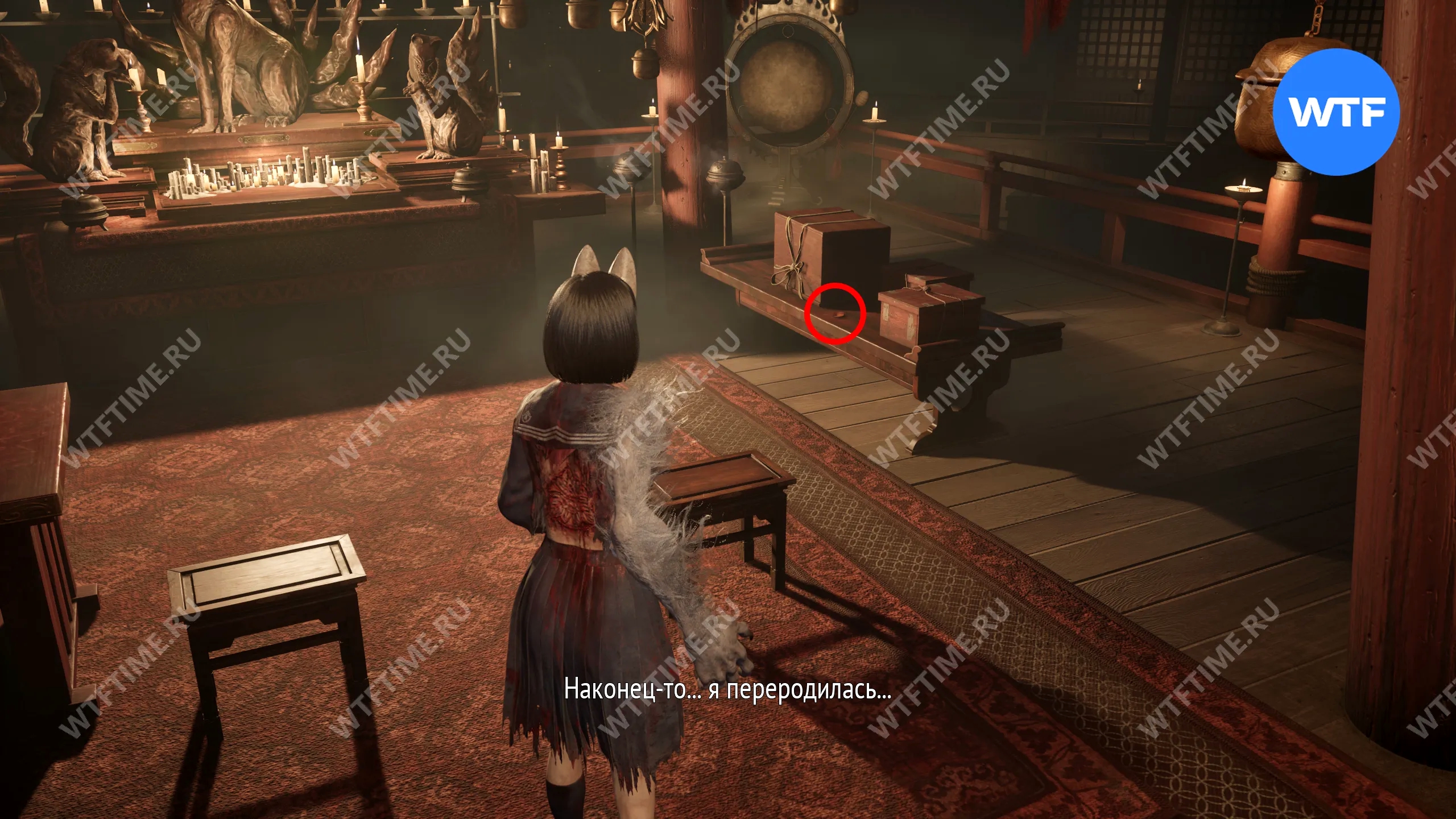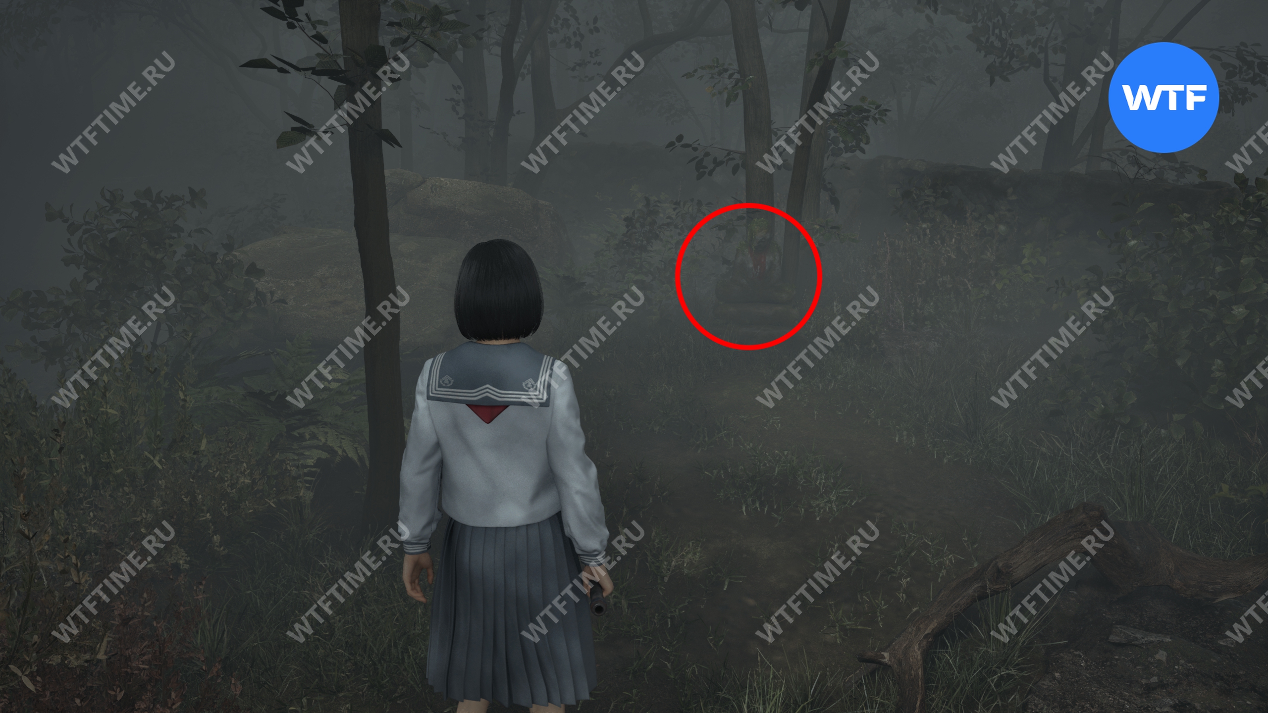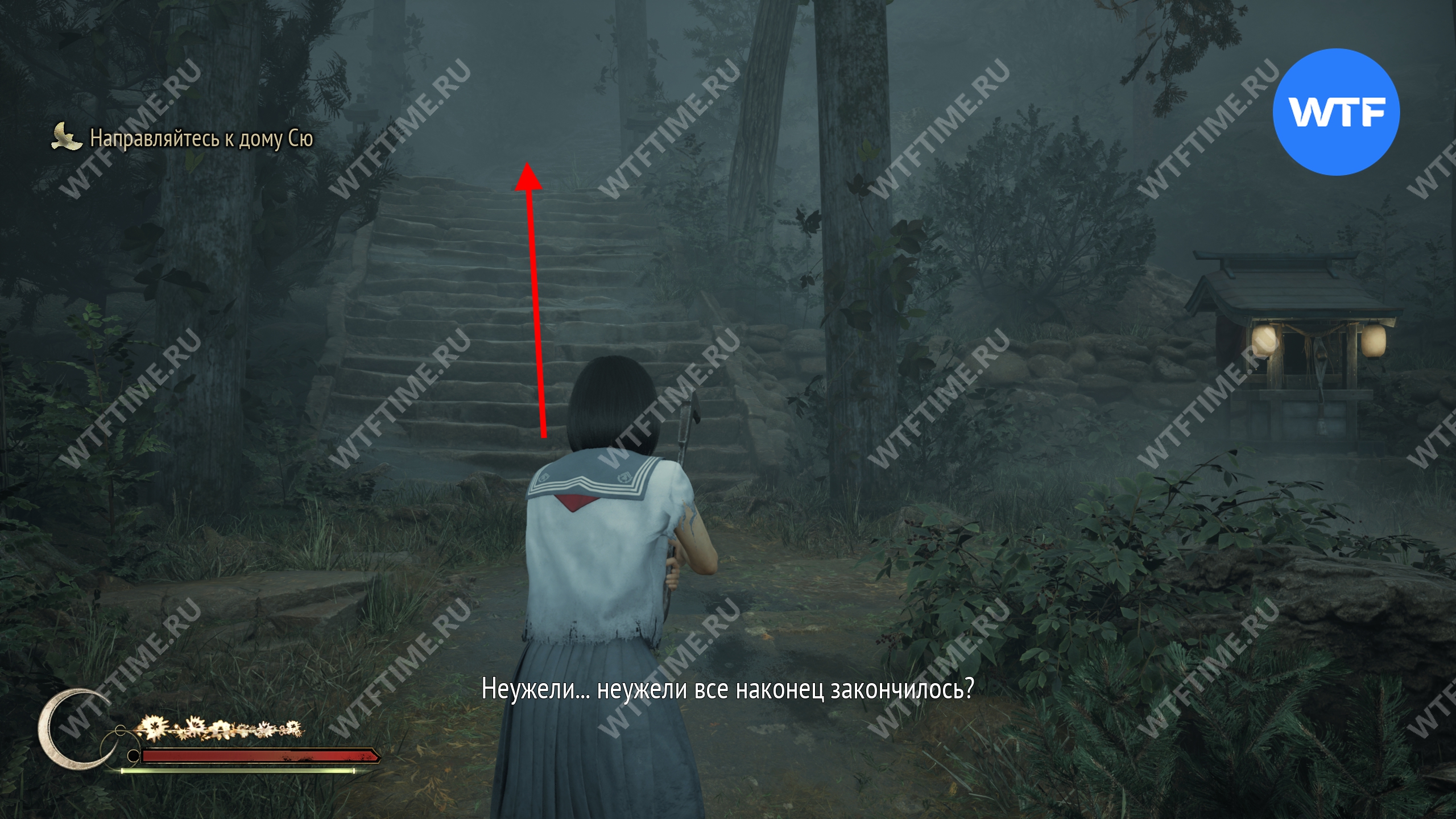 После этого поднимитесь по лестнице и идите направо. Там вы найдете последнюю дощечку эма, а также древнюю статую Дзидзо. Положите к ней свою брошь — это позволит вам достичь 4 концовки, а также получить достижение «Подарок, который я не могу принять».