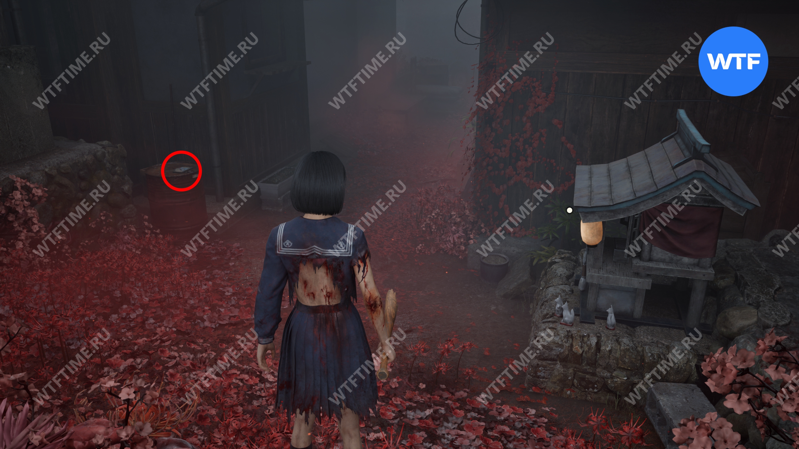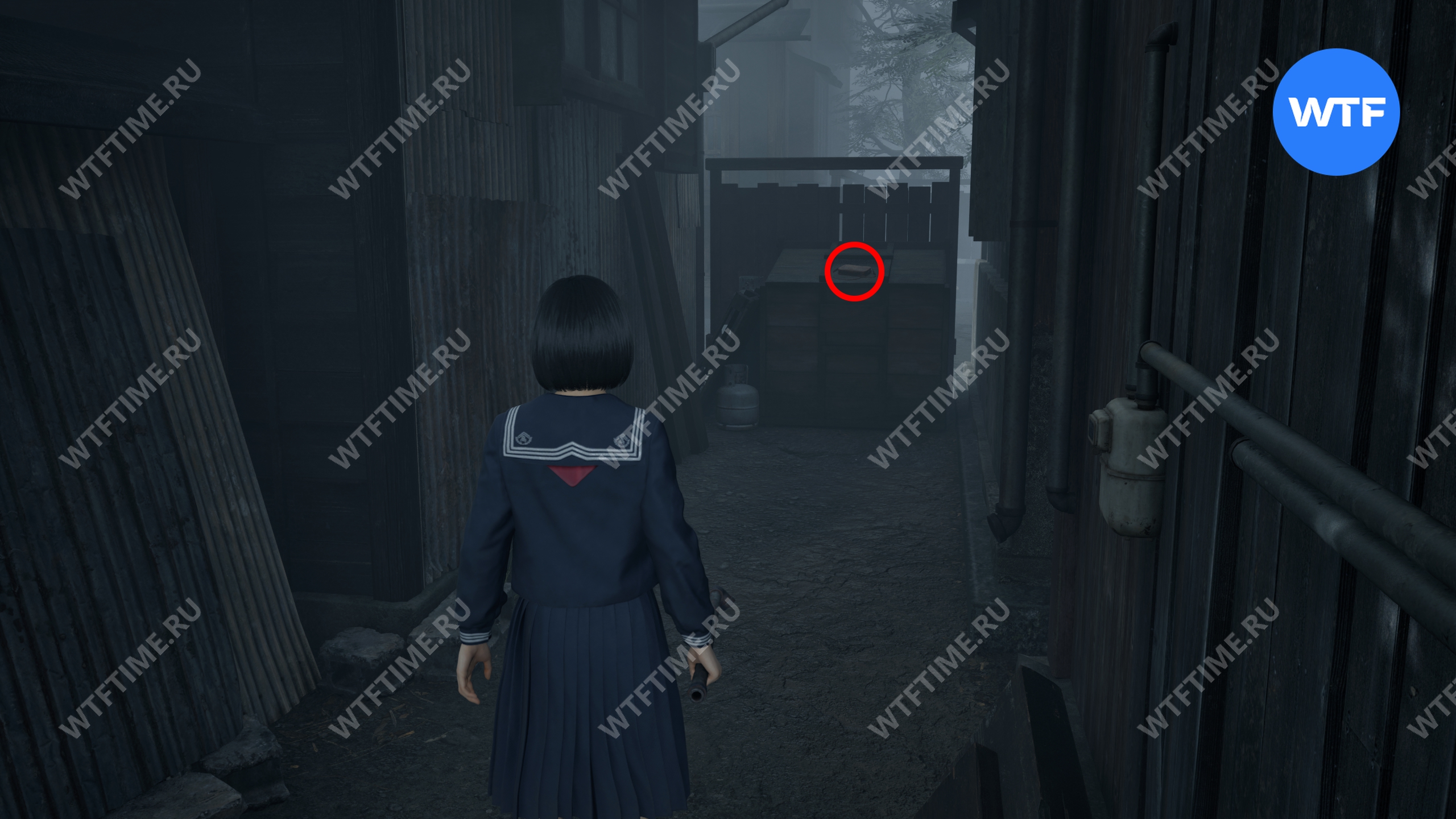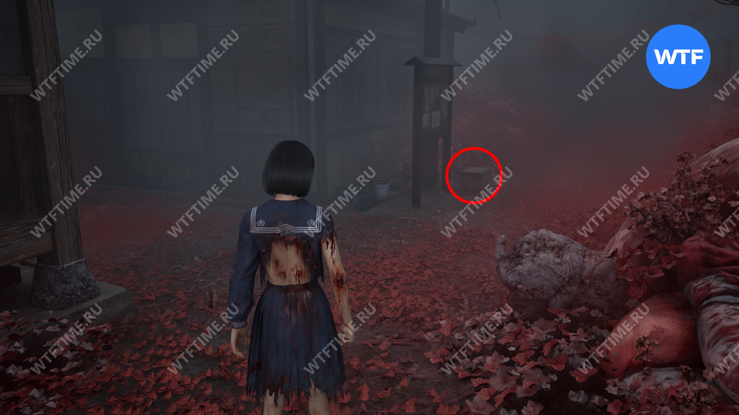 После того как вы пройдете через парк с детскими качелями, где запустится воспоминание Хинако, идите налево и загляните во двор дома справа, обнесенный забором. Там на земле стоит коробка Инари-сама, внутри которой лежит Дневник мести и дощечка эма.