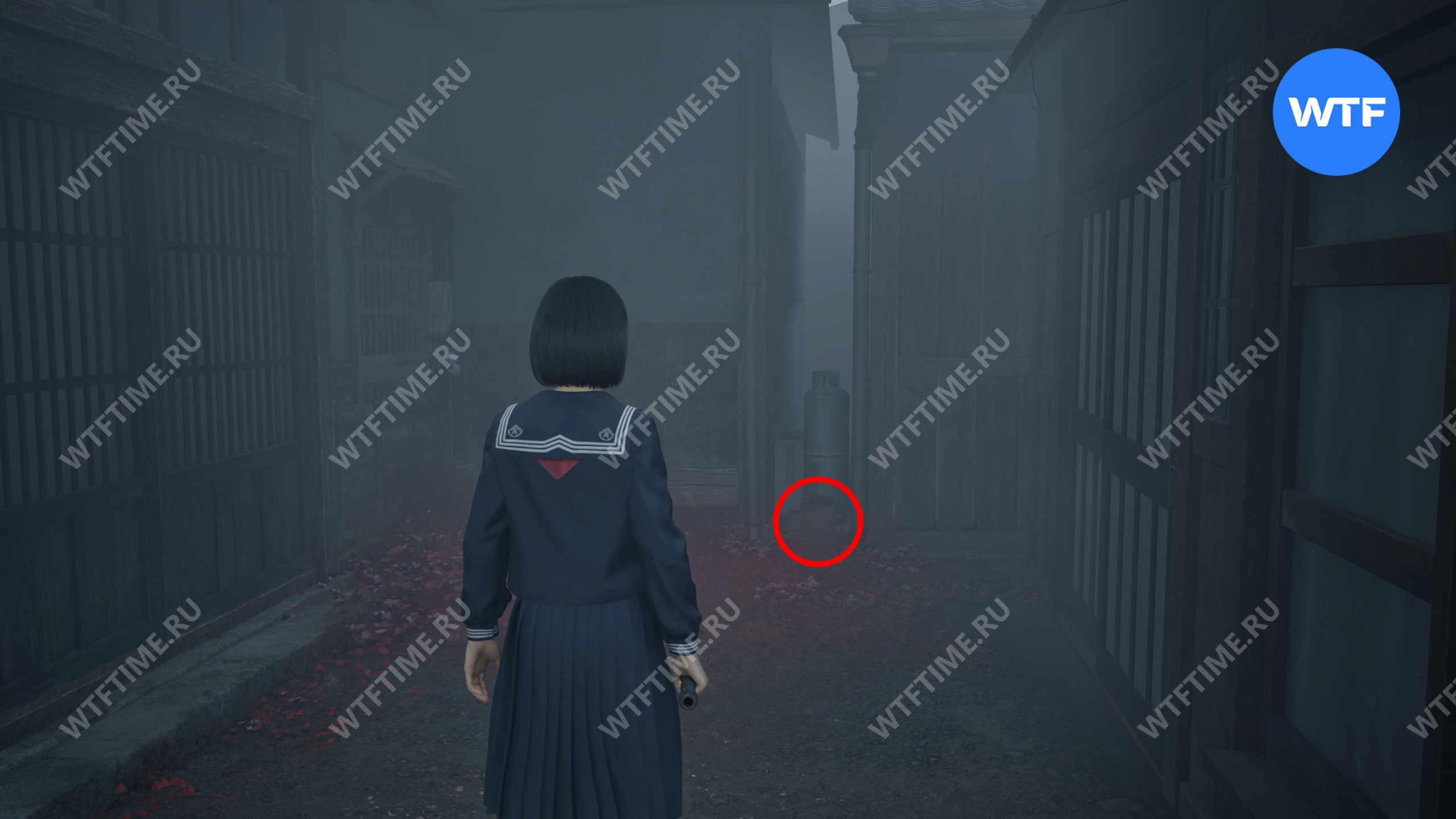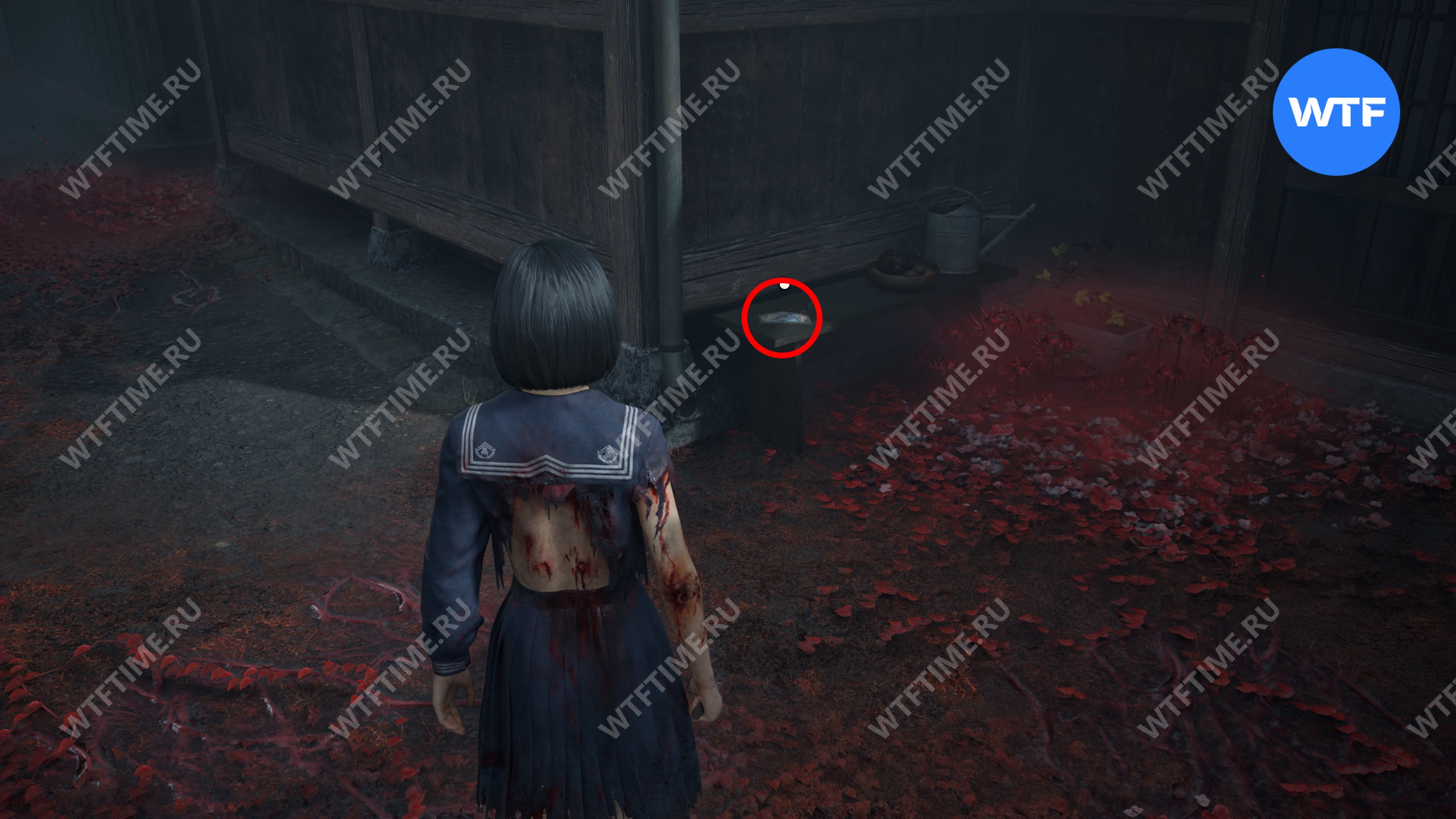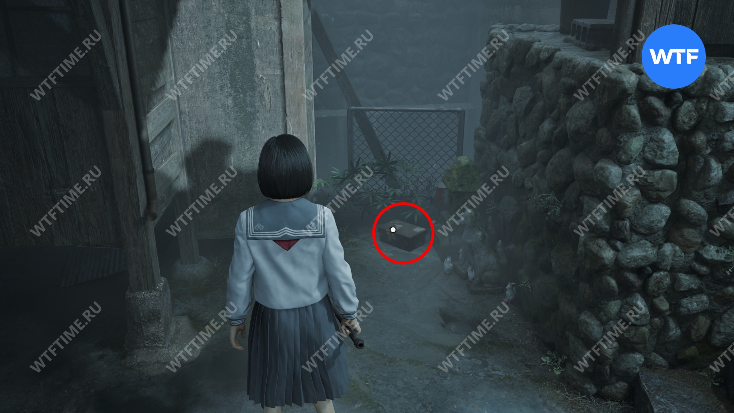 После того как вы пройдете через парк с детскими качелями, где запустится воспоминание Хинако, идите налево и загляните во двор дома справа, обнесенный забором. Там на земле стоит коробка Инари-сама, внутри которой лежит Дневник мести и дощечка эма.