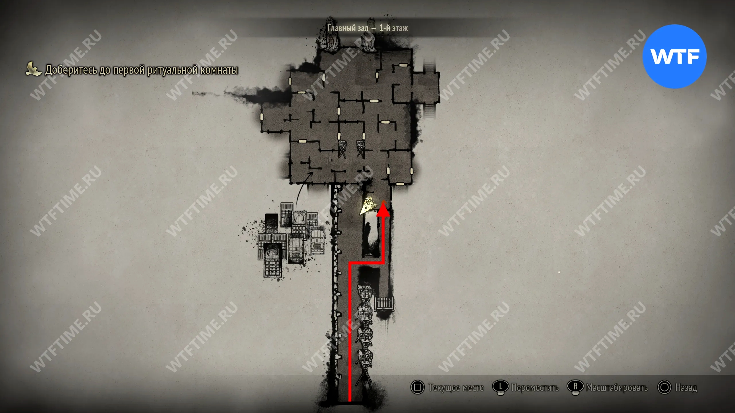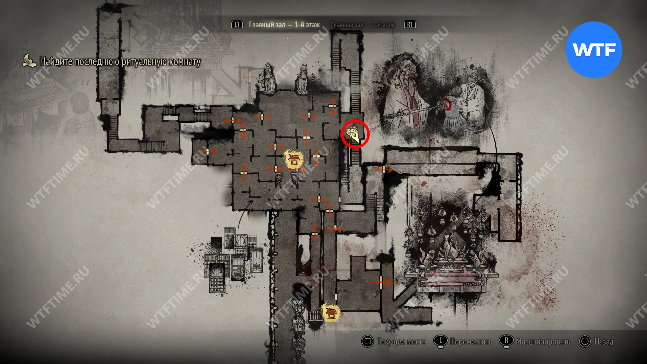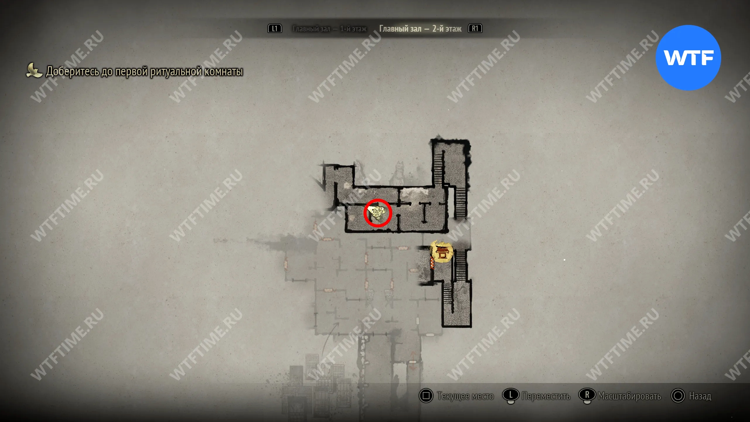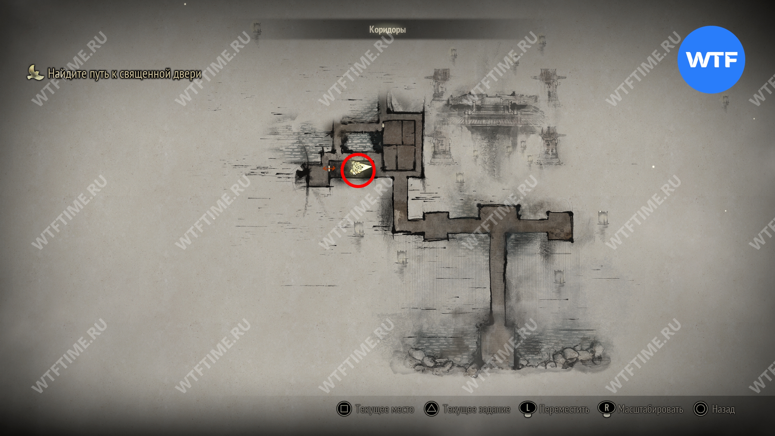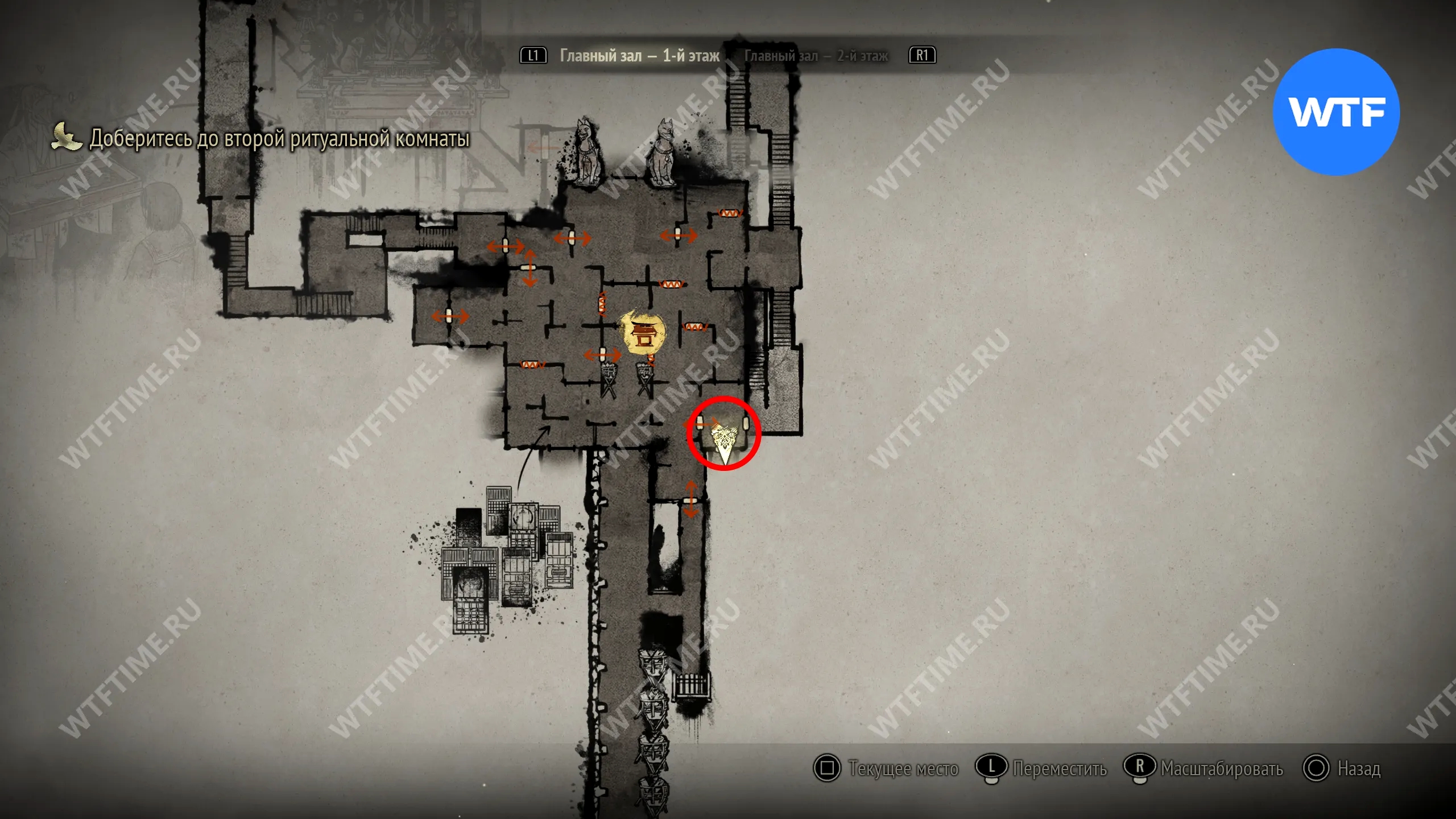 Поскольку все навыки, полученные в ходе ритуалов, будут перенесены в Новую игру+, вы сможете свободно передвигаться по локации с самого начала. Пройдите к двери в юго-восточном углу, отмеченной на скриншоте ниже.