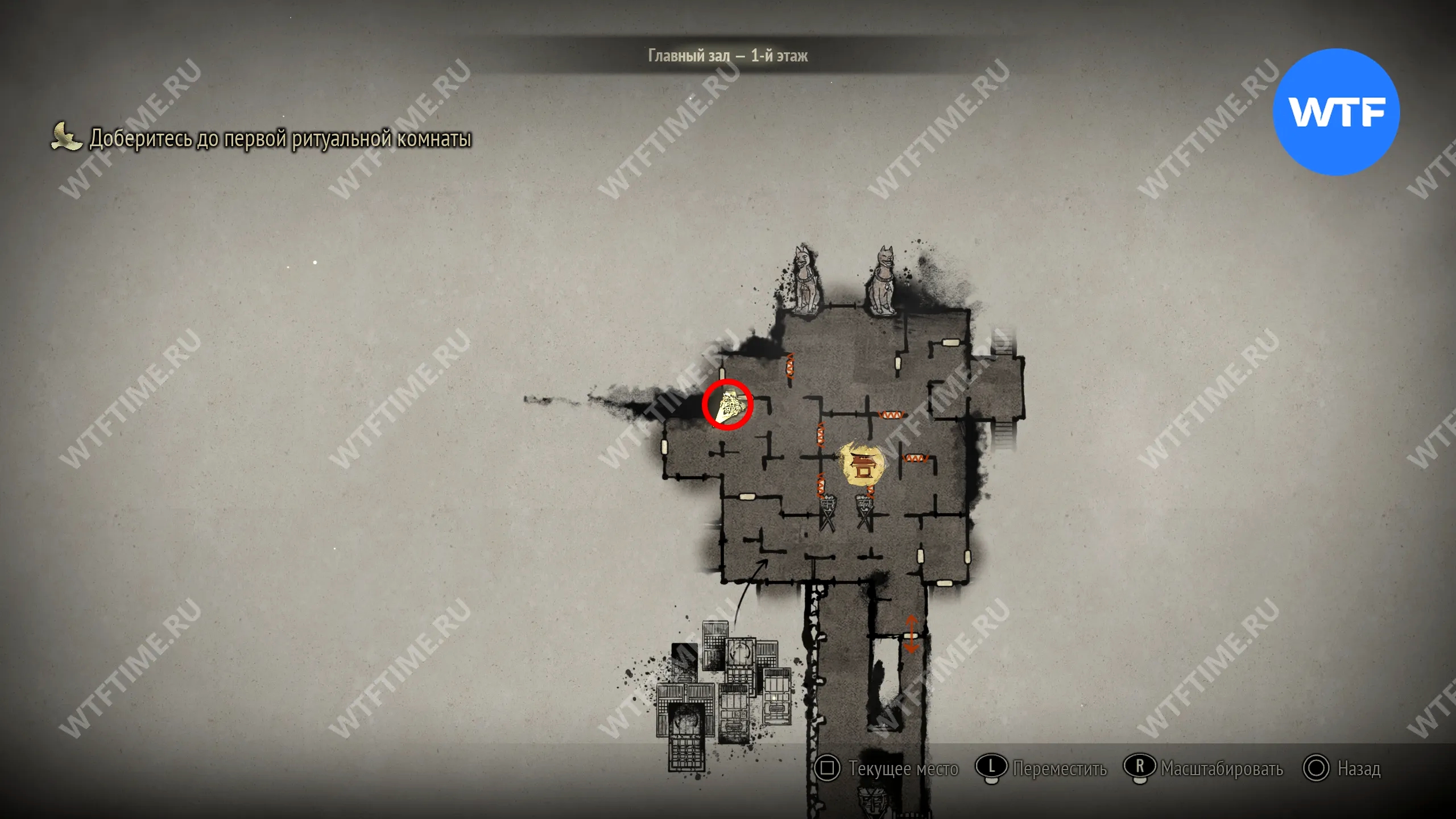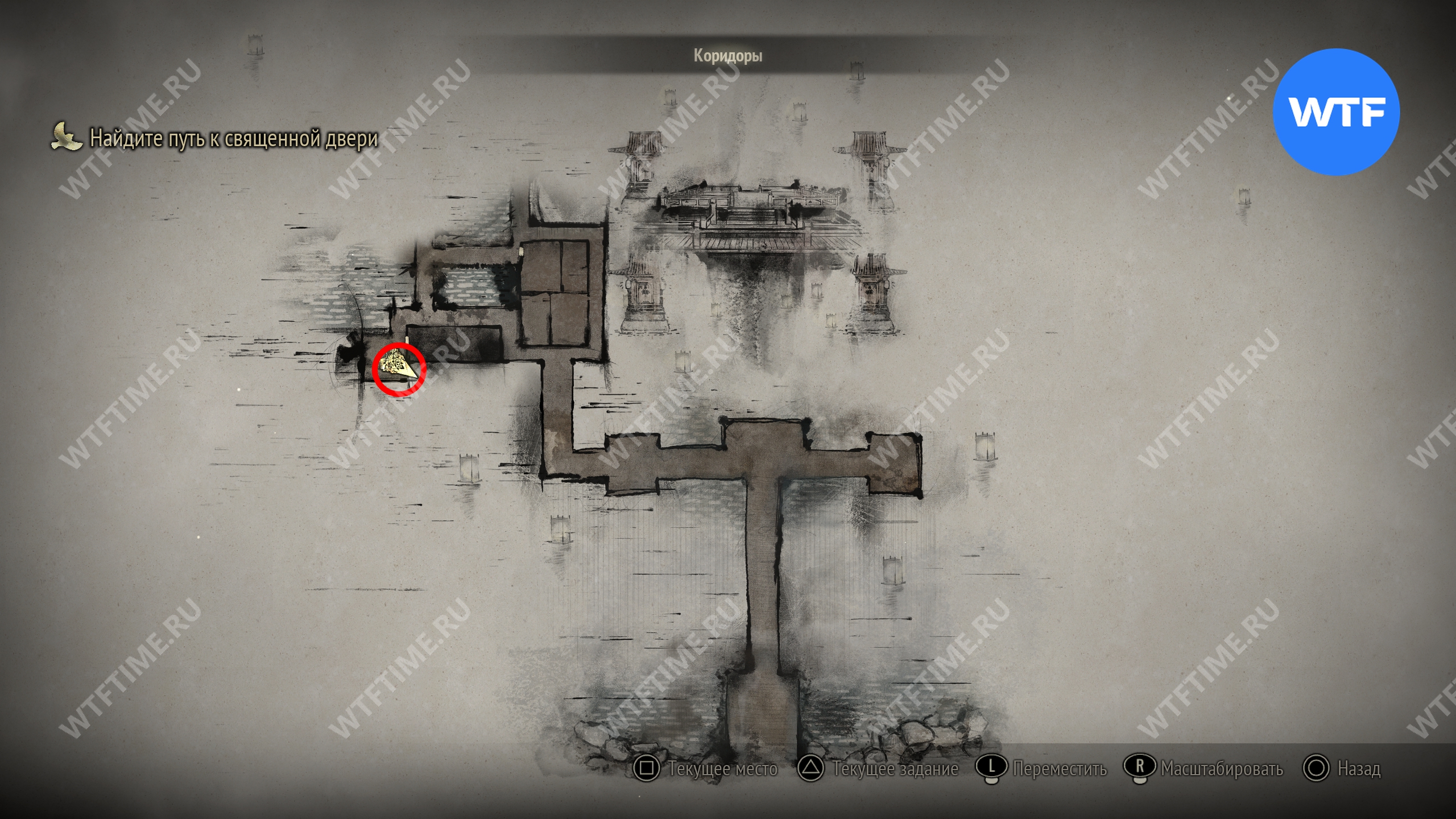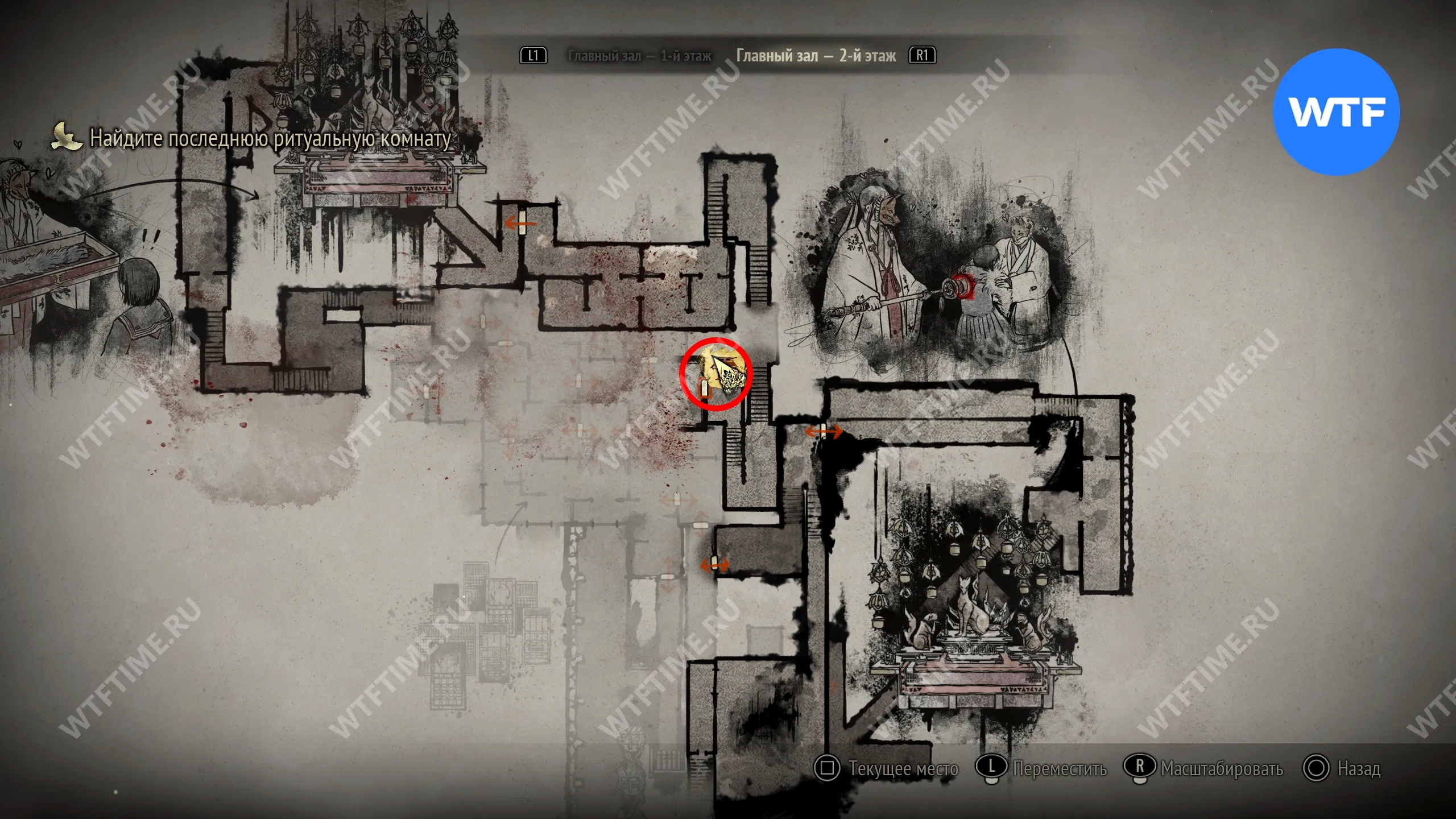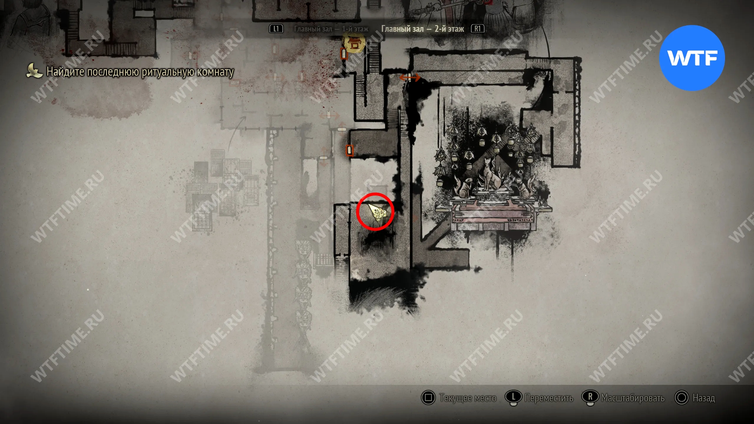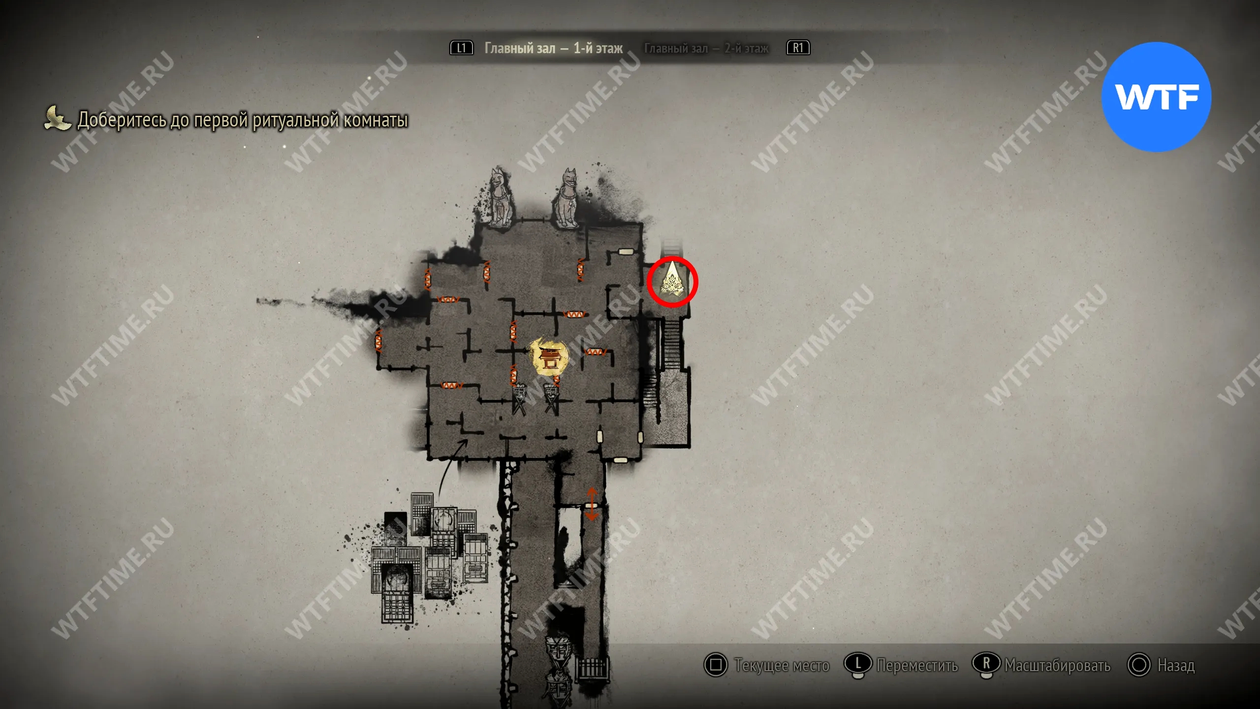 Поскольку все навыки, полученные в ходе ритуалов, будут перенесены в Новую игру+, вы сможете свободно передвигаться по локации с самого начала. Пройдите к двери в юго-восточном углу, отмеченной на скриншоте ниже.