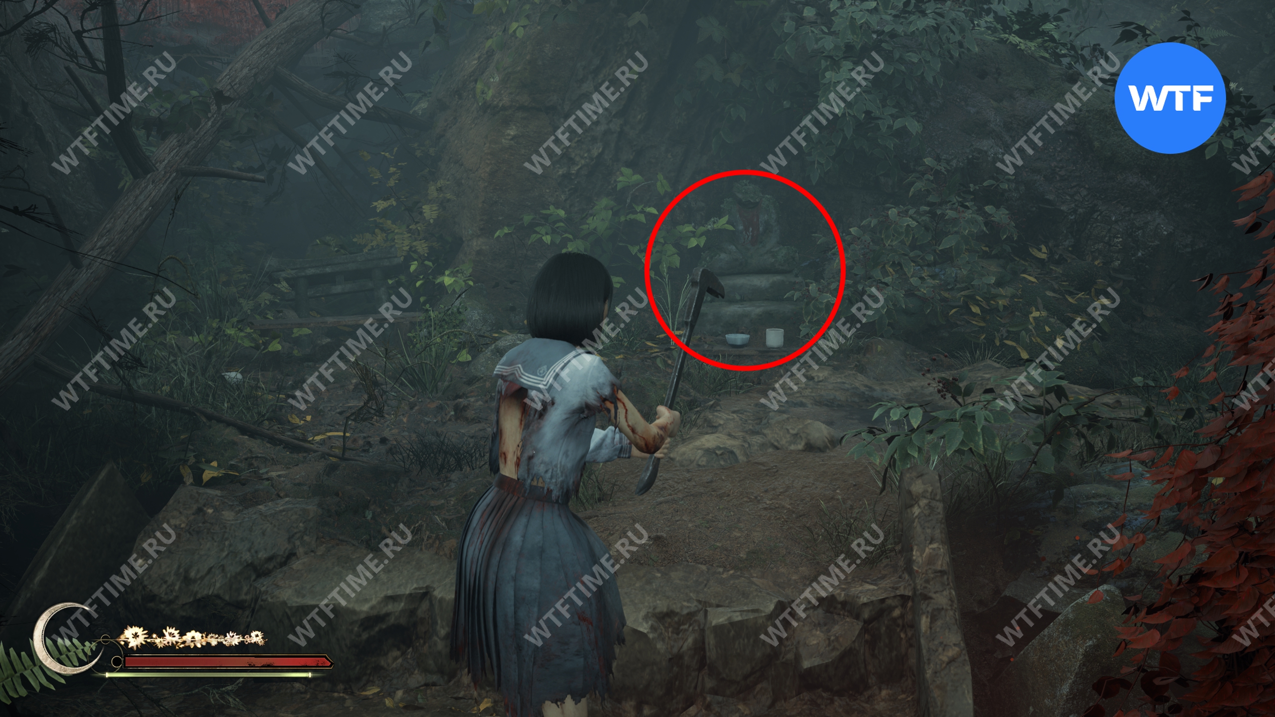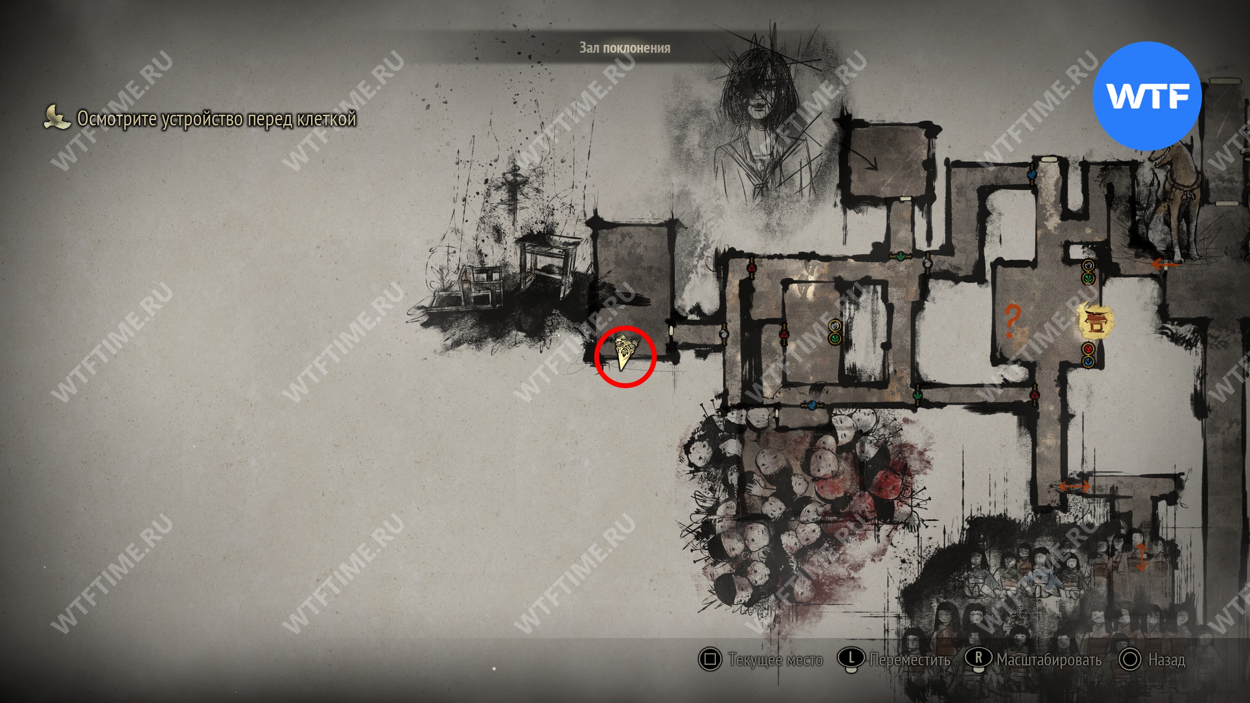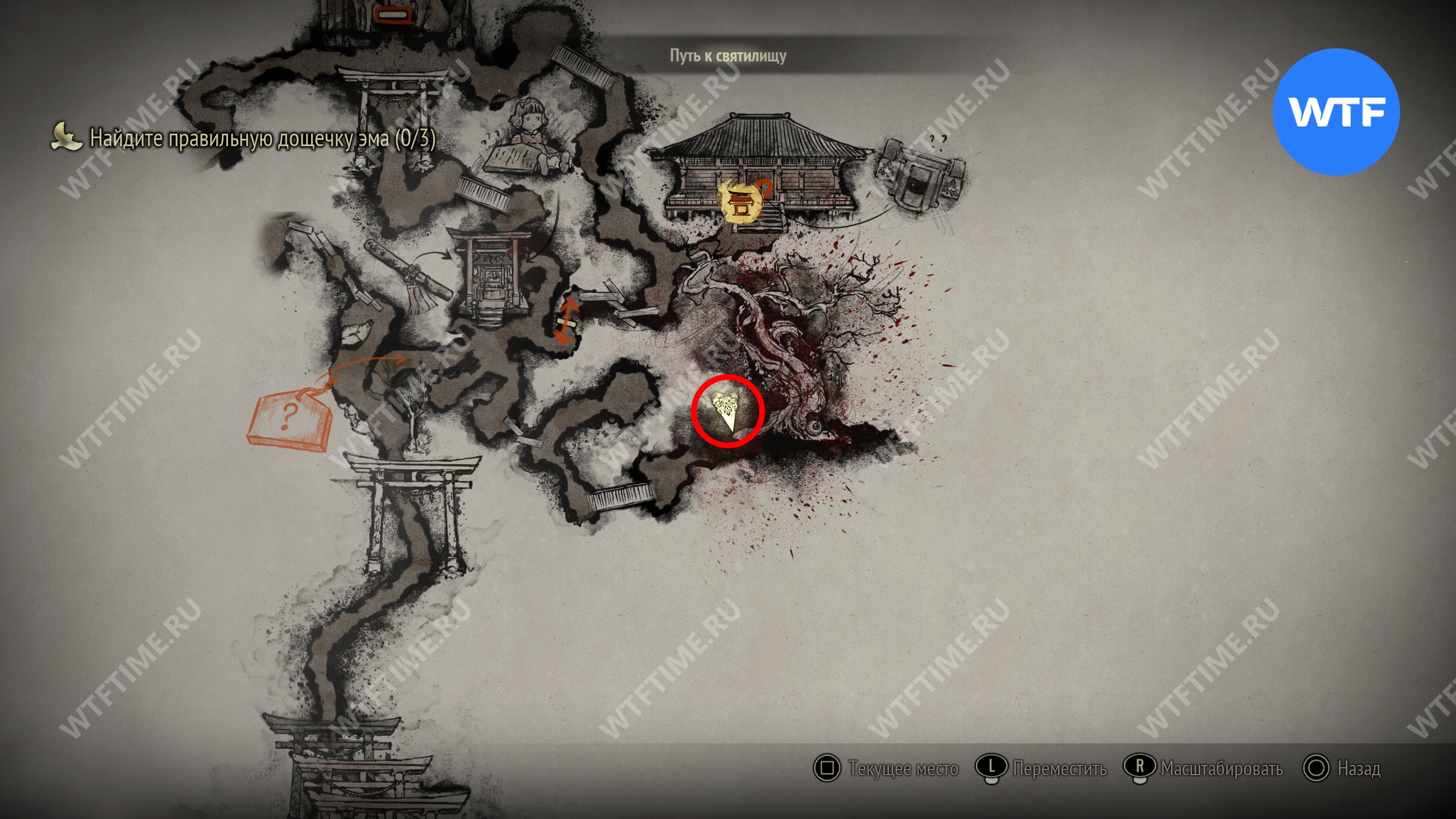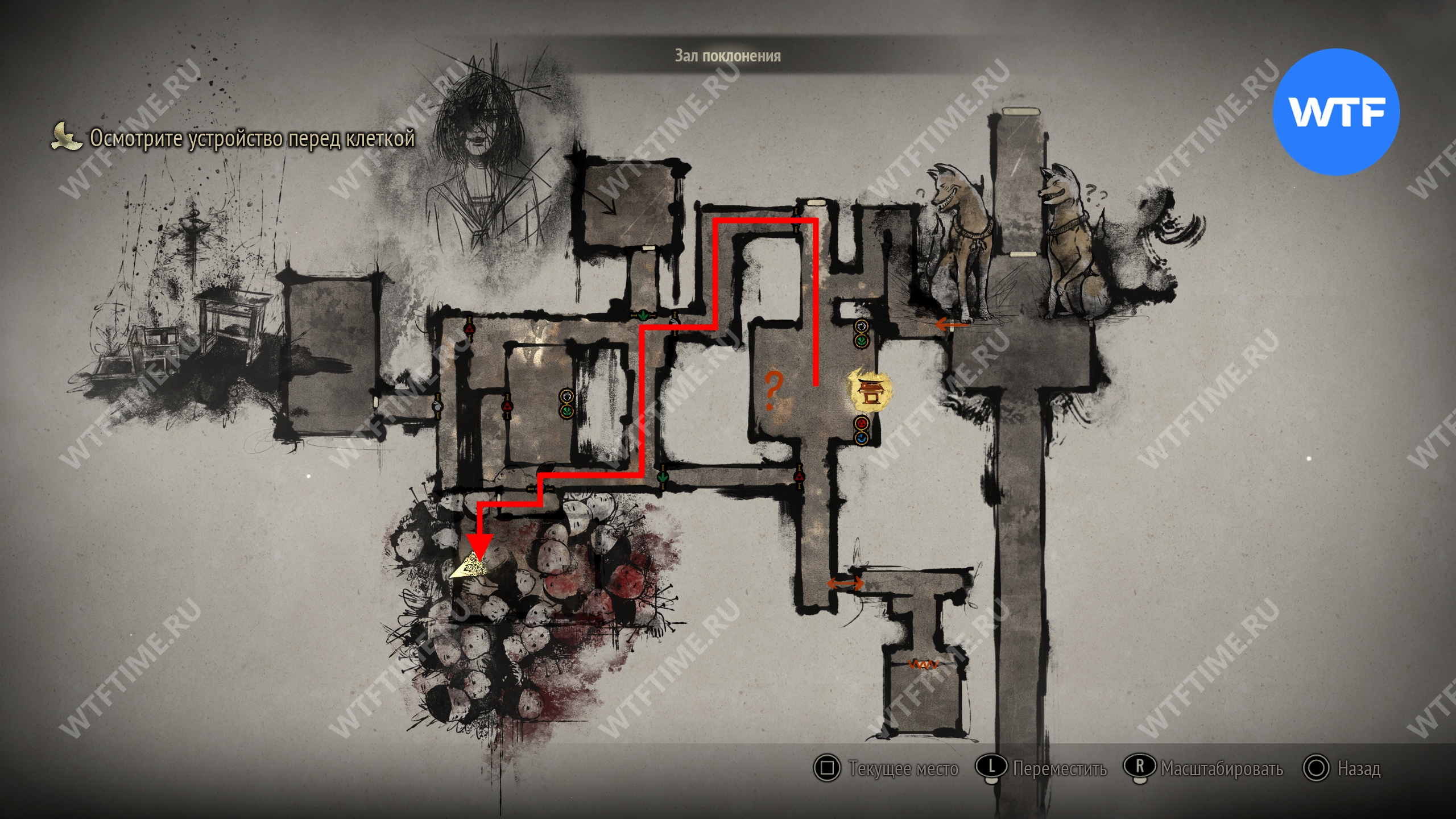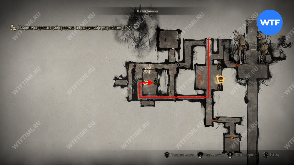 Затем вернитесь обратно на основной путь и идите к святилищу, отмеченному на карте ниже. Если в Главном зале вы решили загадку «Багряная жидкость», здесь появится ванна, наполненная кровью.