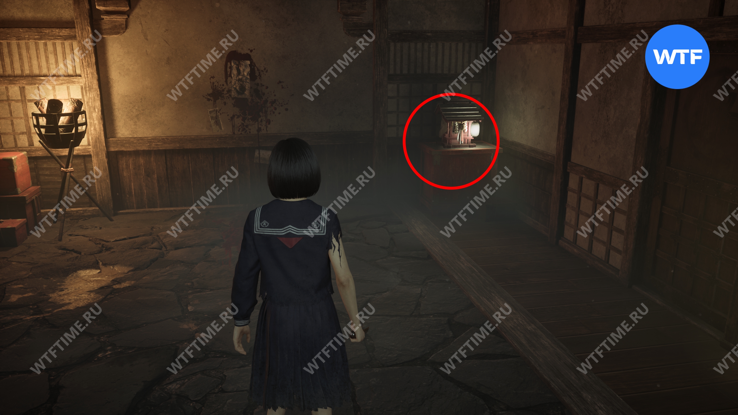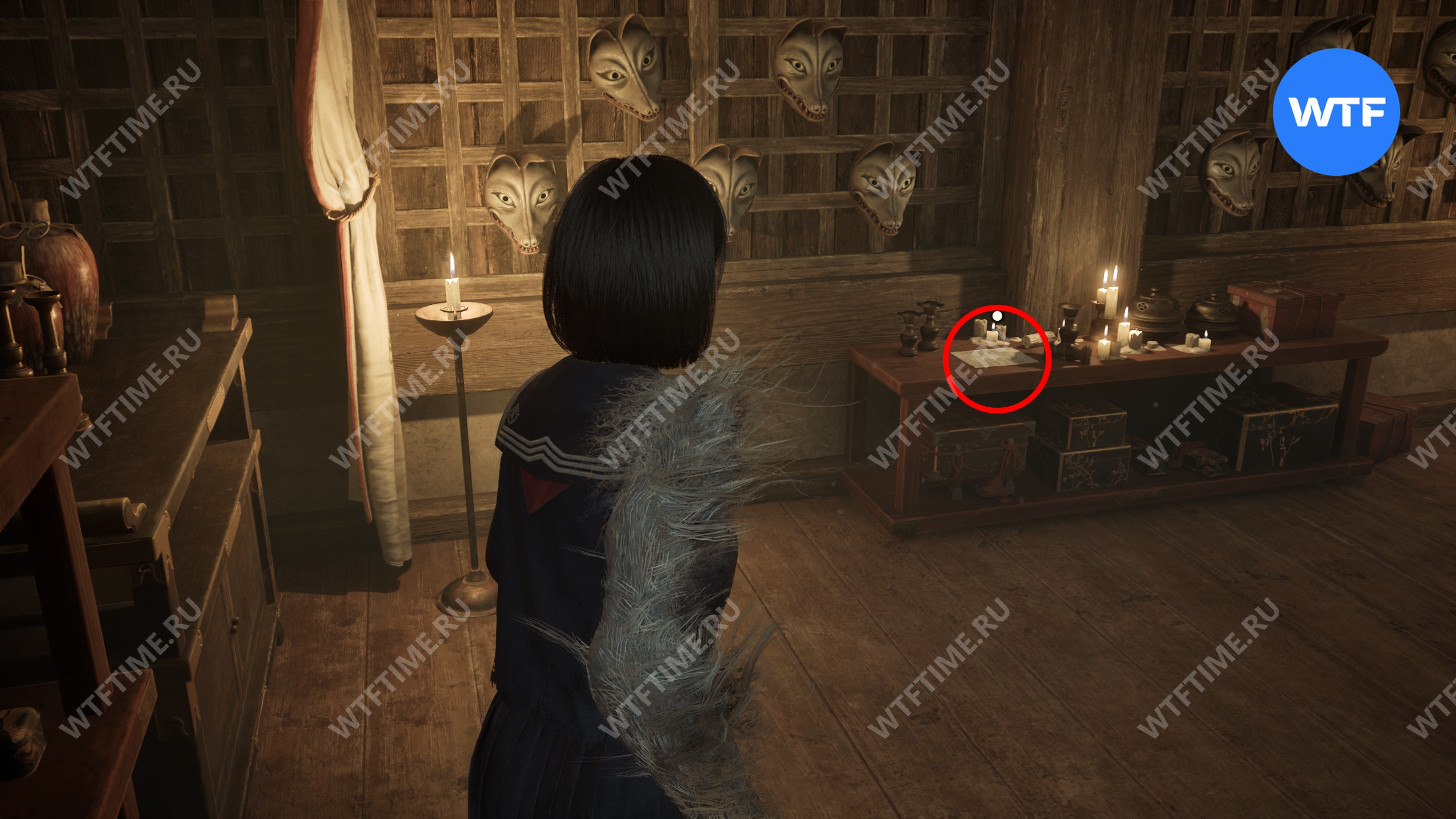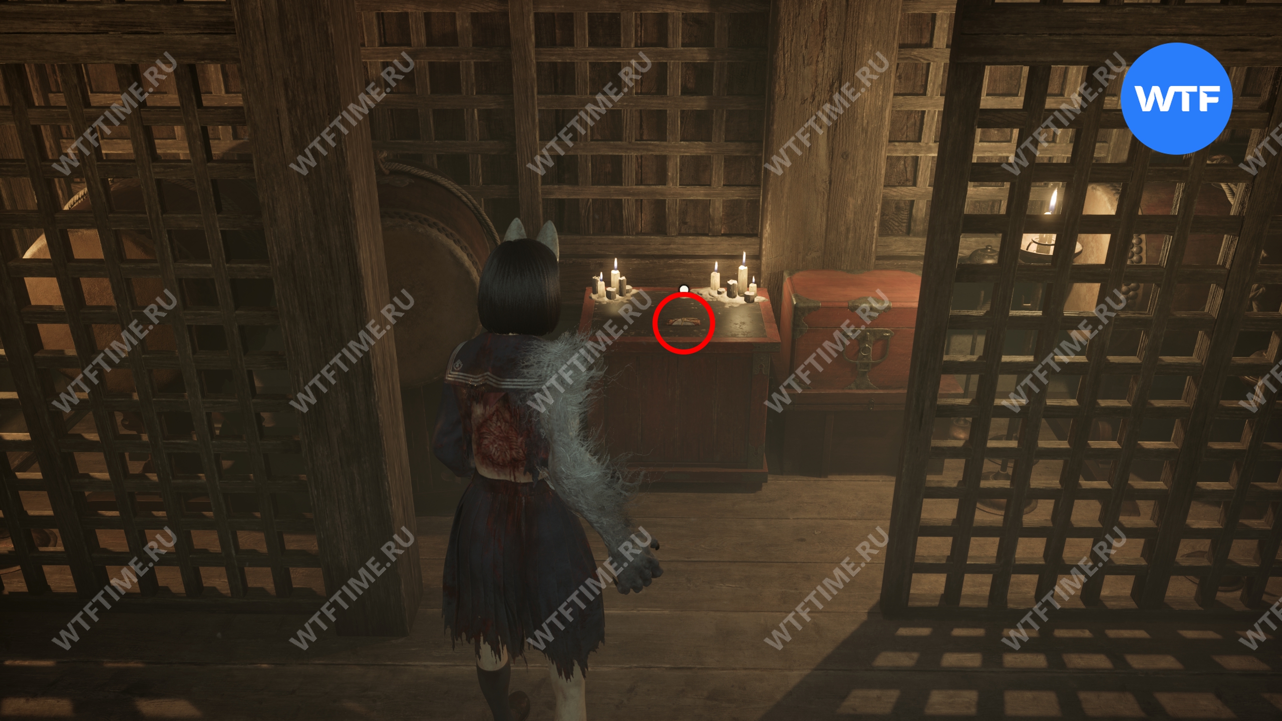 Пройдите по коридору до конца и в итоге окажетесь в первой ритуальной комнате. После длинной кат сцены, в которой Хинако обзаведется новой рукой, заберите сморщенный абура-агэ, лежащий на алтаре.