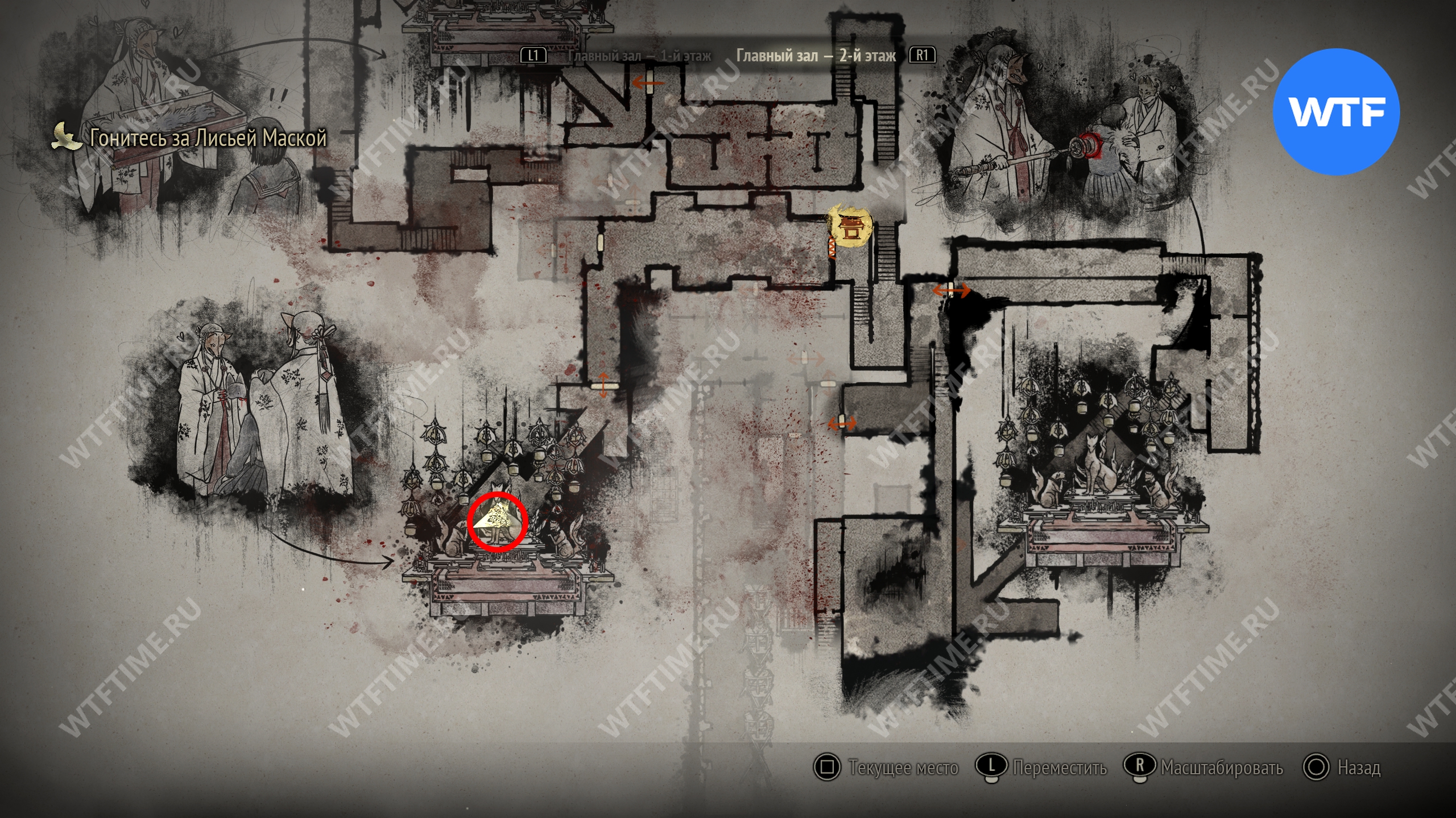 Следуйте за Лисьей Маской, чтобы покинуть ритуальный зал. Сразившись сразу с тремя врагами, вы окажетесь в небольшом коридоре с лестницей. Пока поднимайтесь по ней наверх.