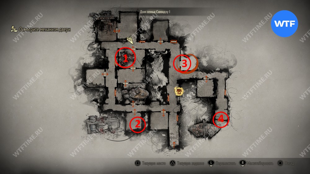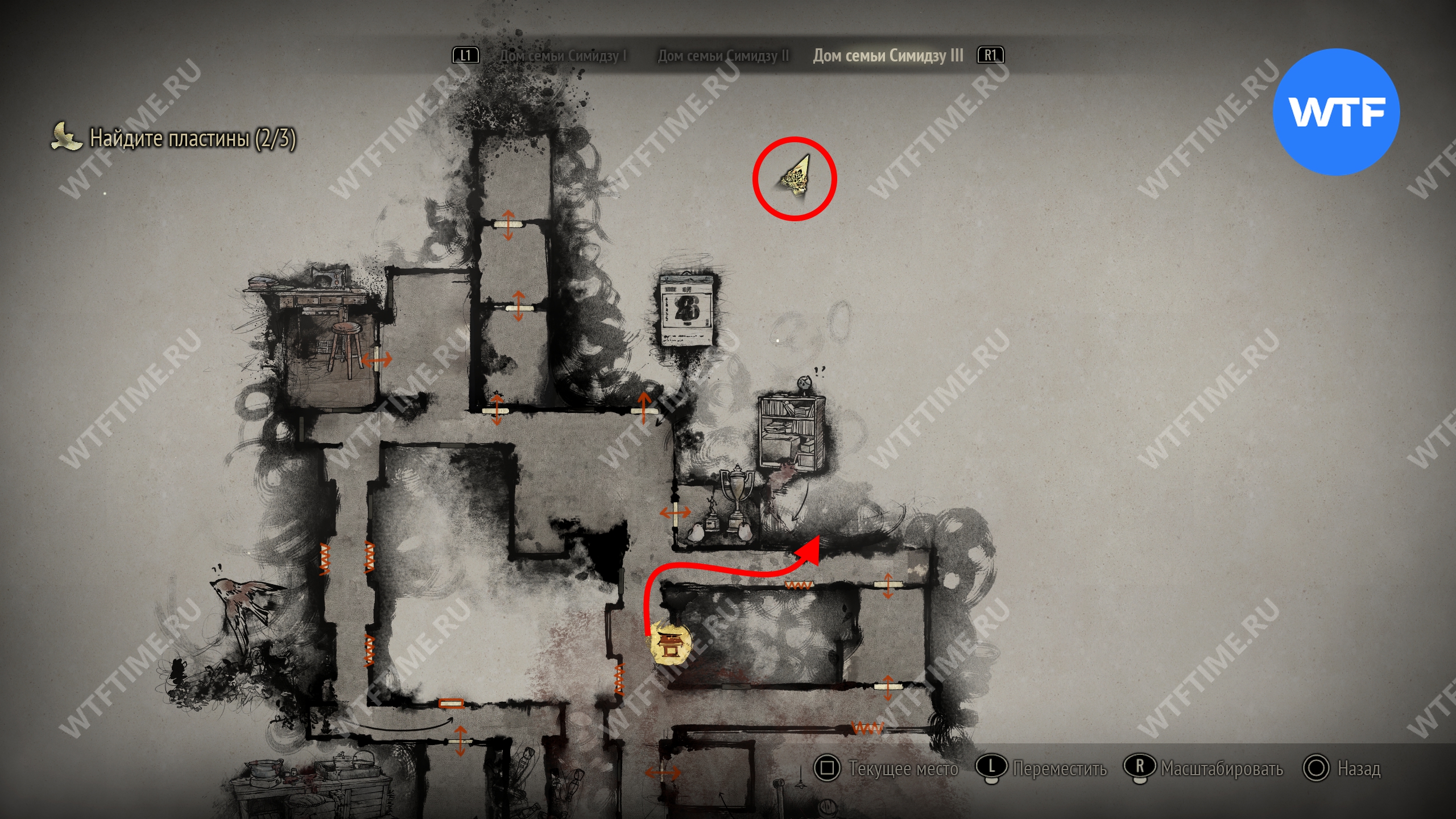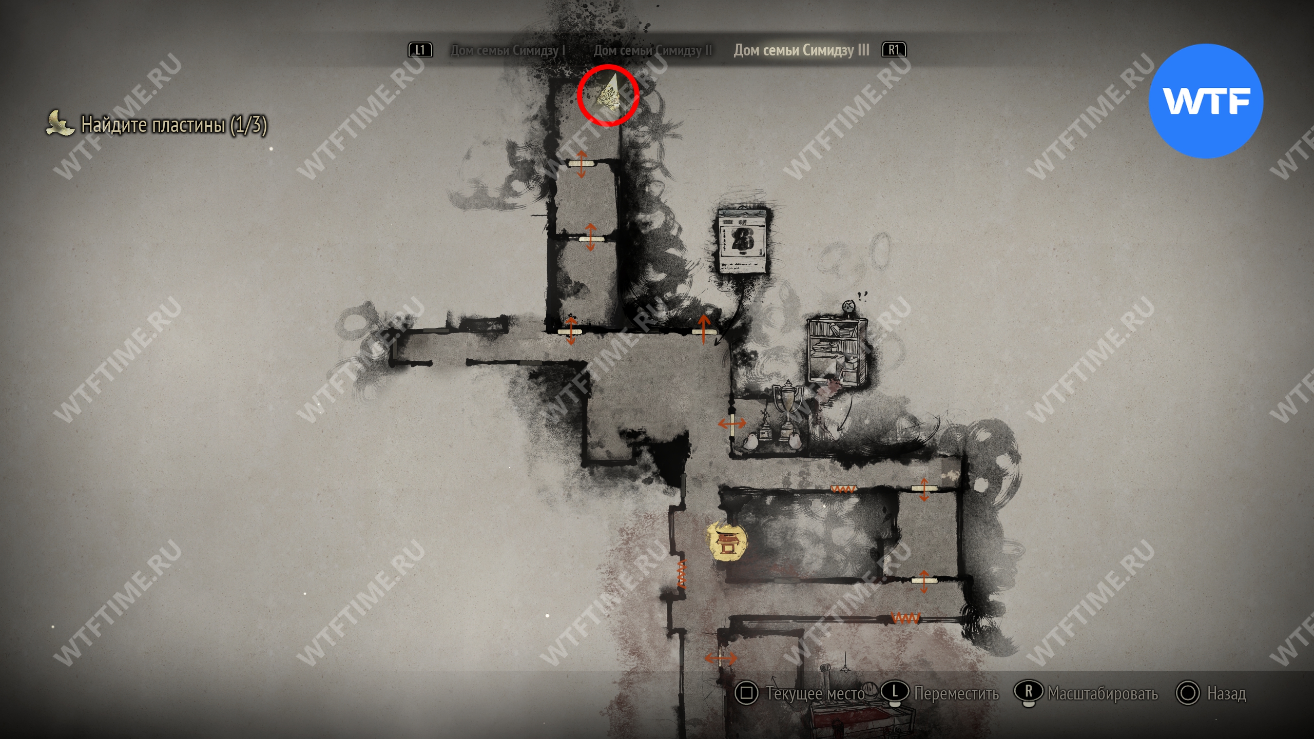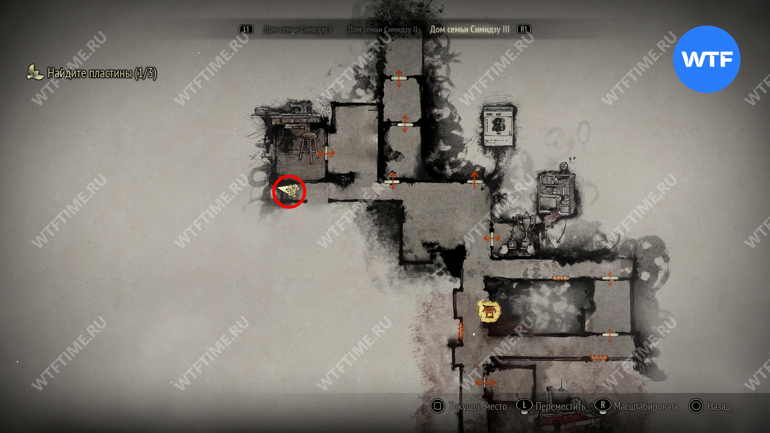 Затем идите к месту, отмеченному на карте ниже, и разместите пожелтевший календарь на пустующем крючке. Это откроет дверь к северу и позволит вам перейти к третьей версии дома семьи Симидзу.