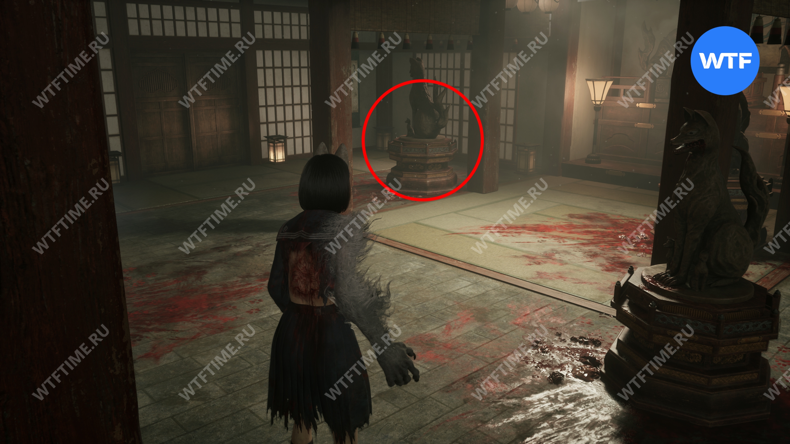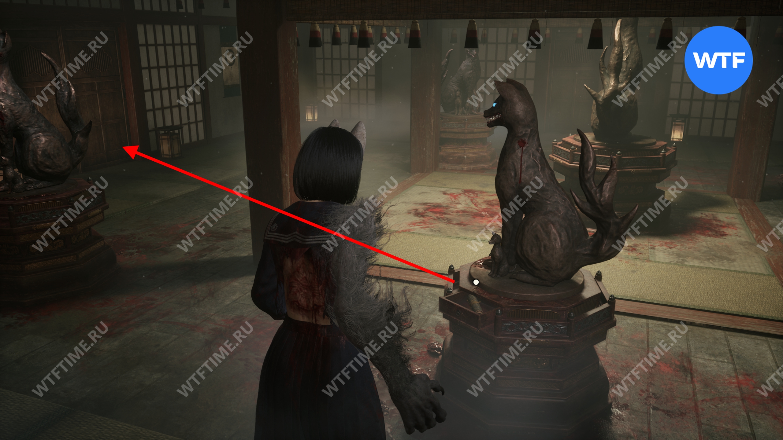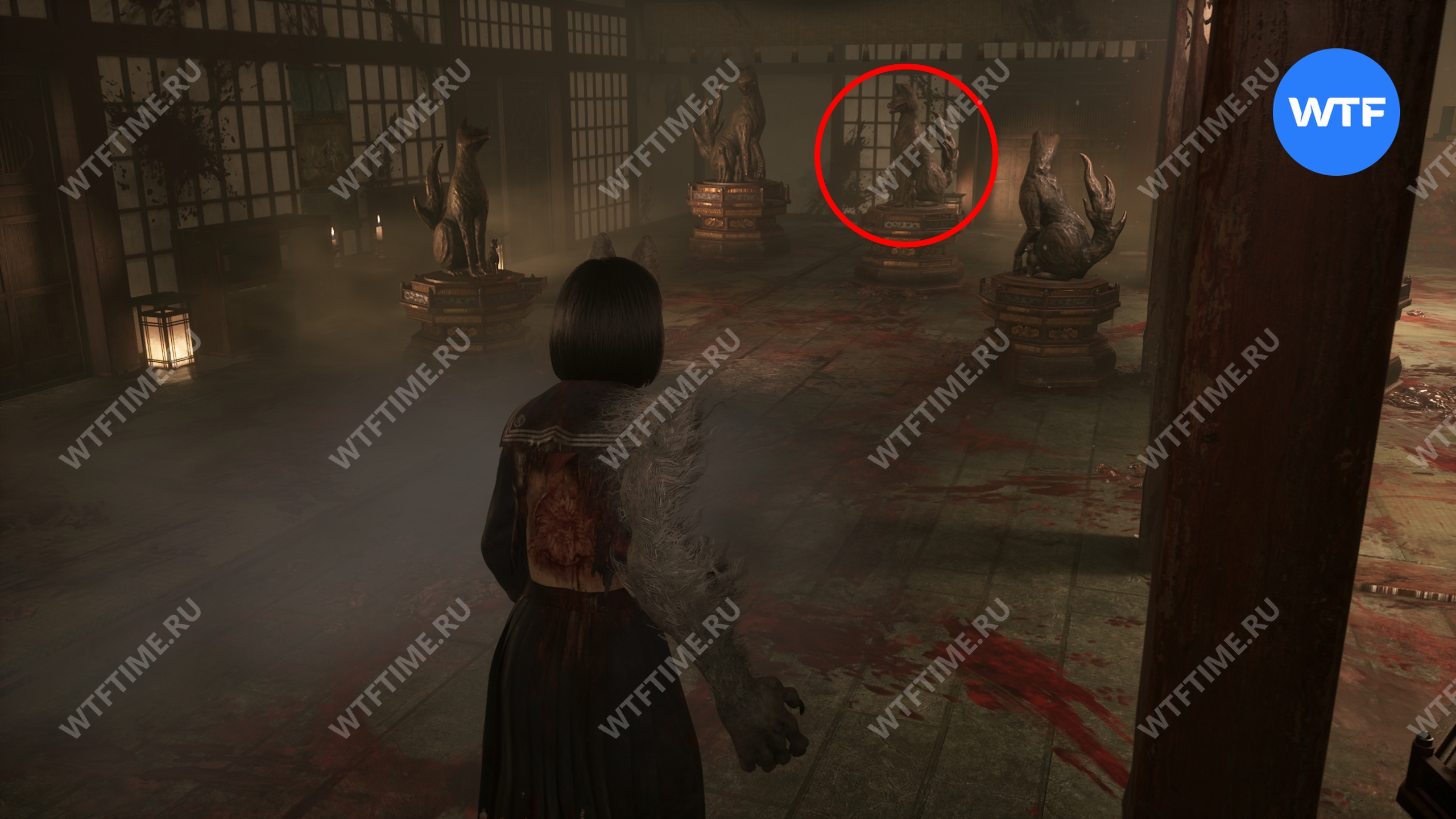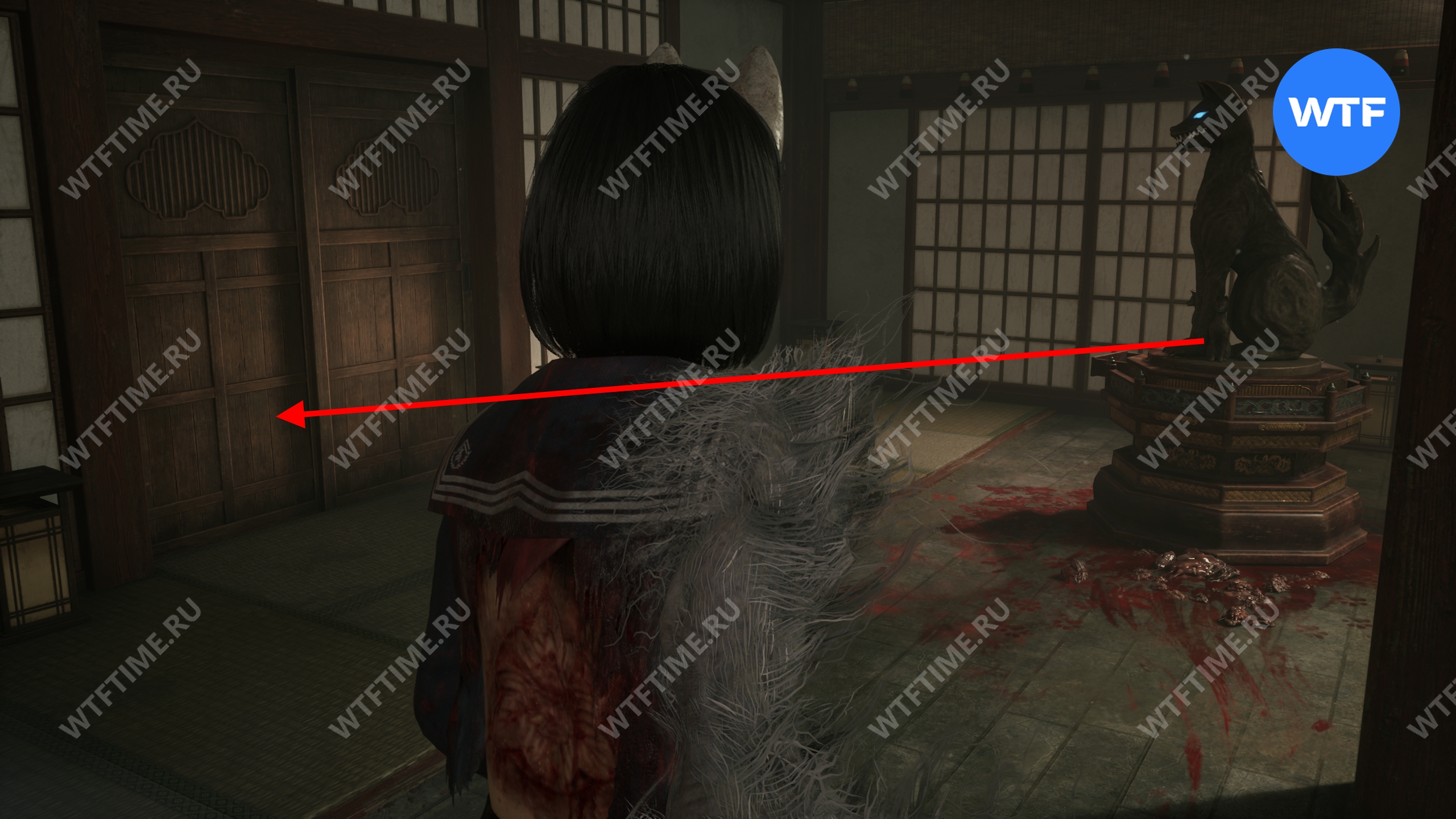 Изначально статуй лисиц здесь нет, поэтому чтобы выбрать правильное направление, вы должны использовать концентрацию на луже крови в правой части комнаты. Появившаяся статуя укажет вам на дверь справа.