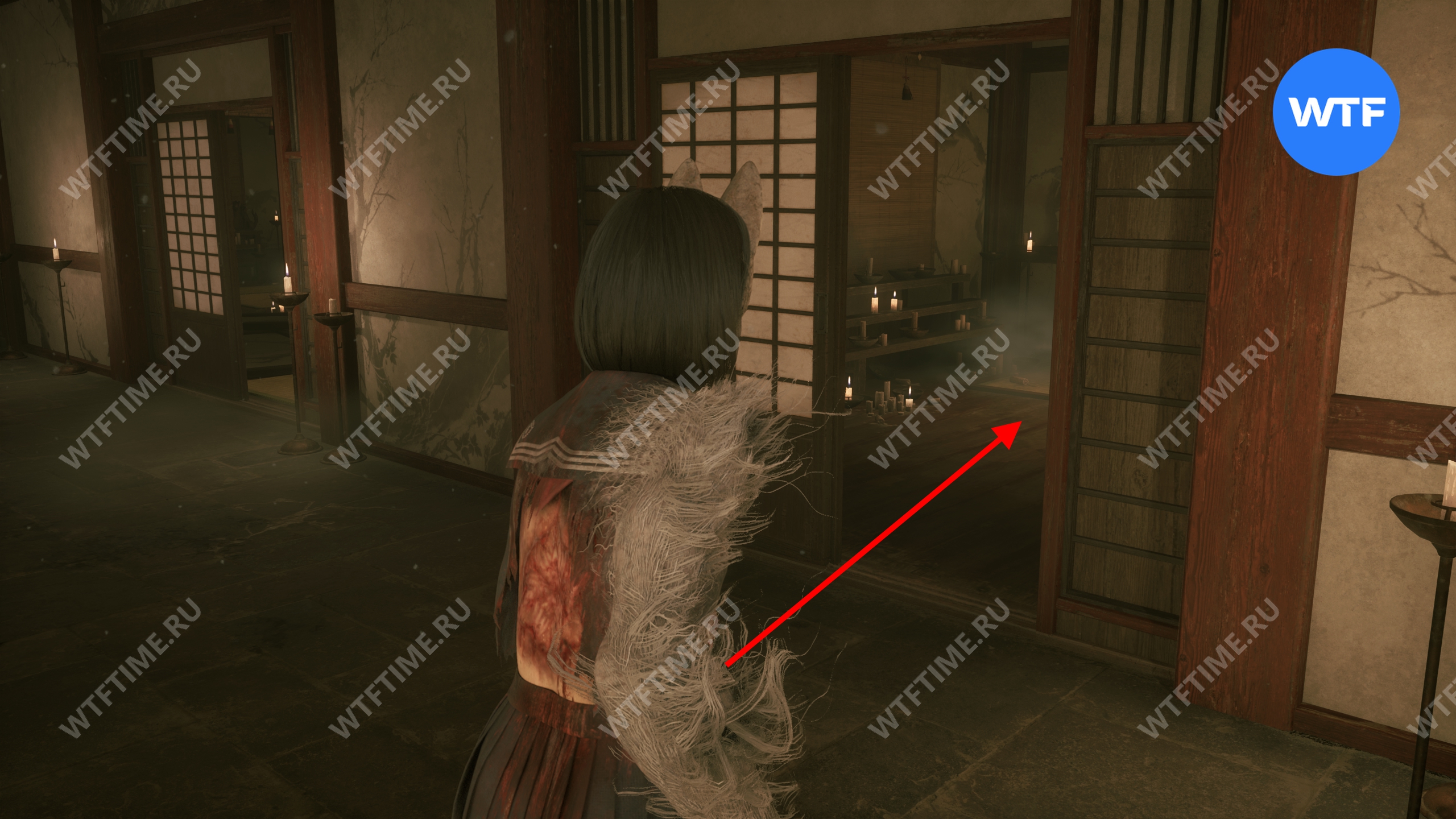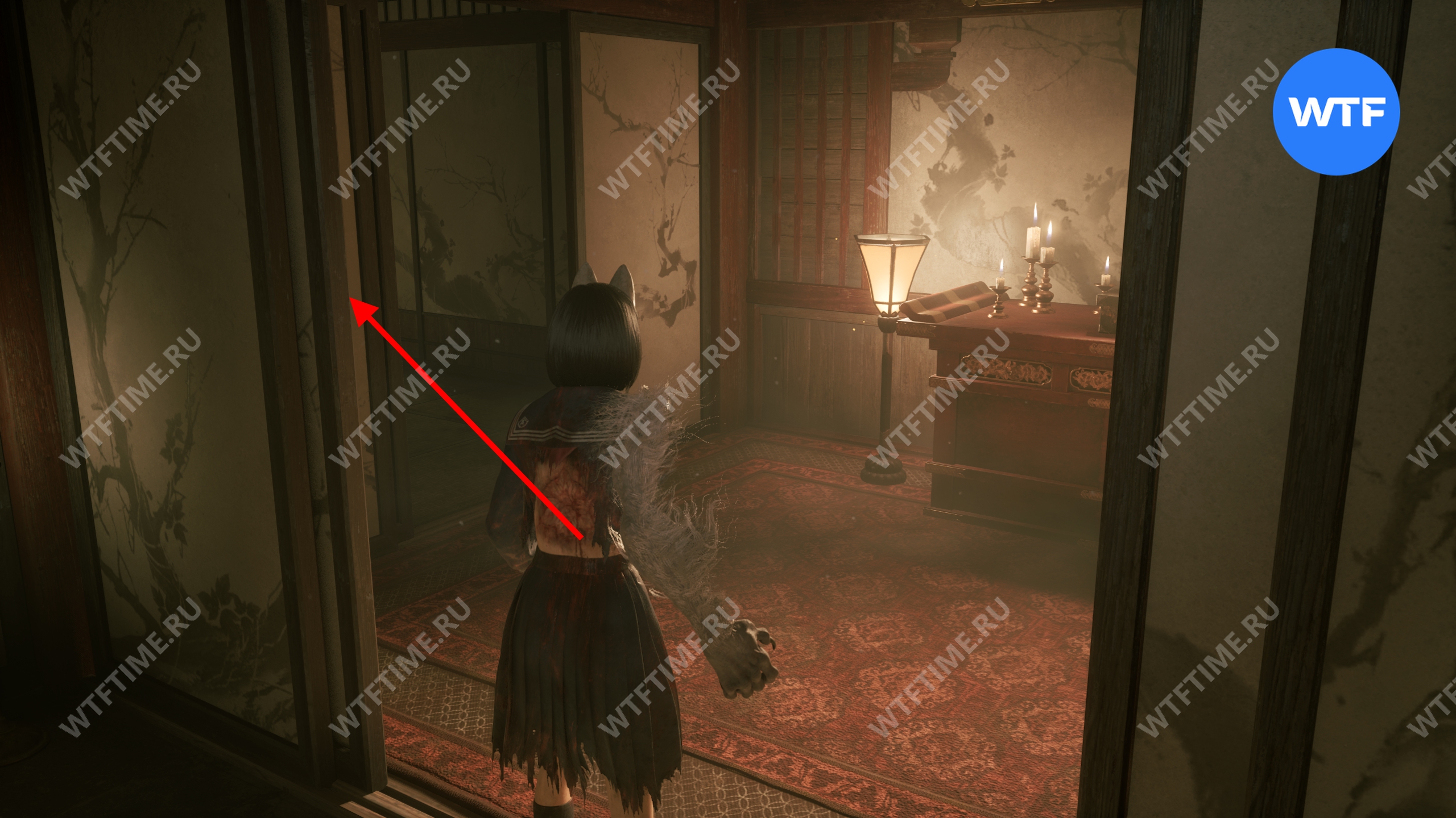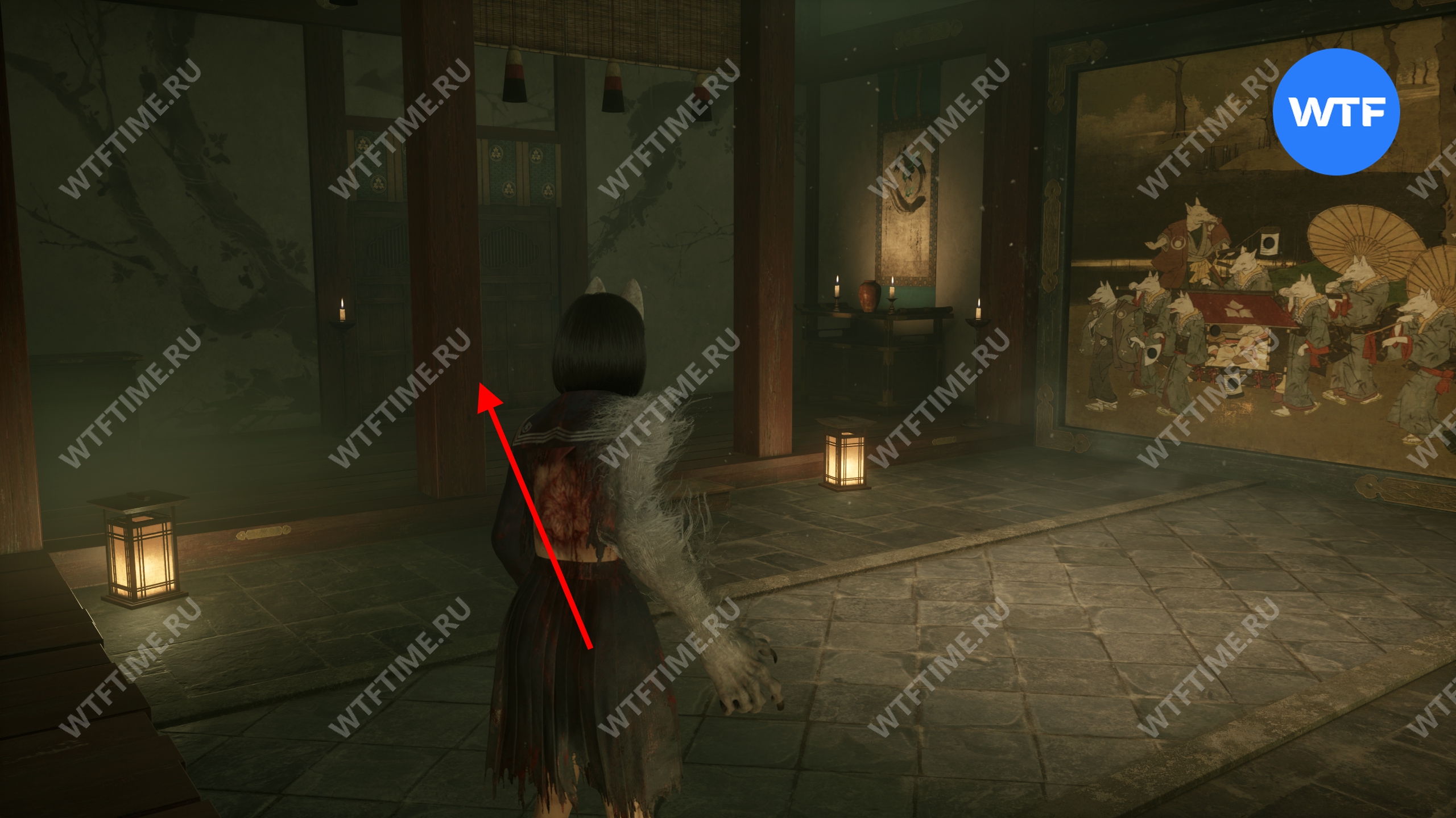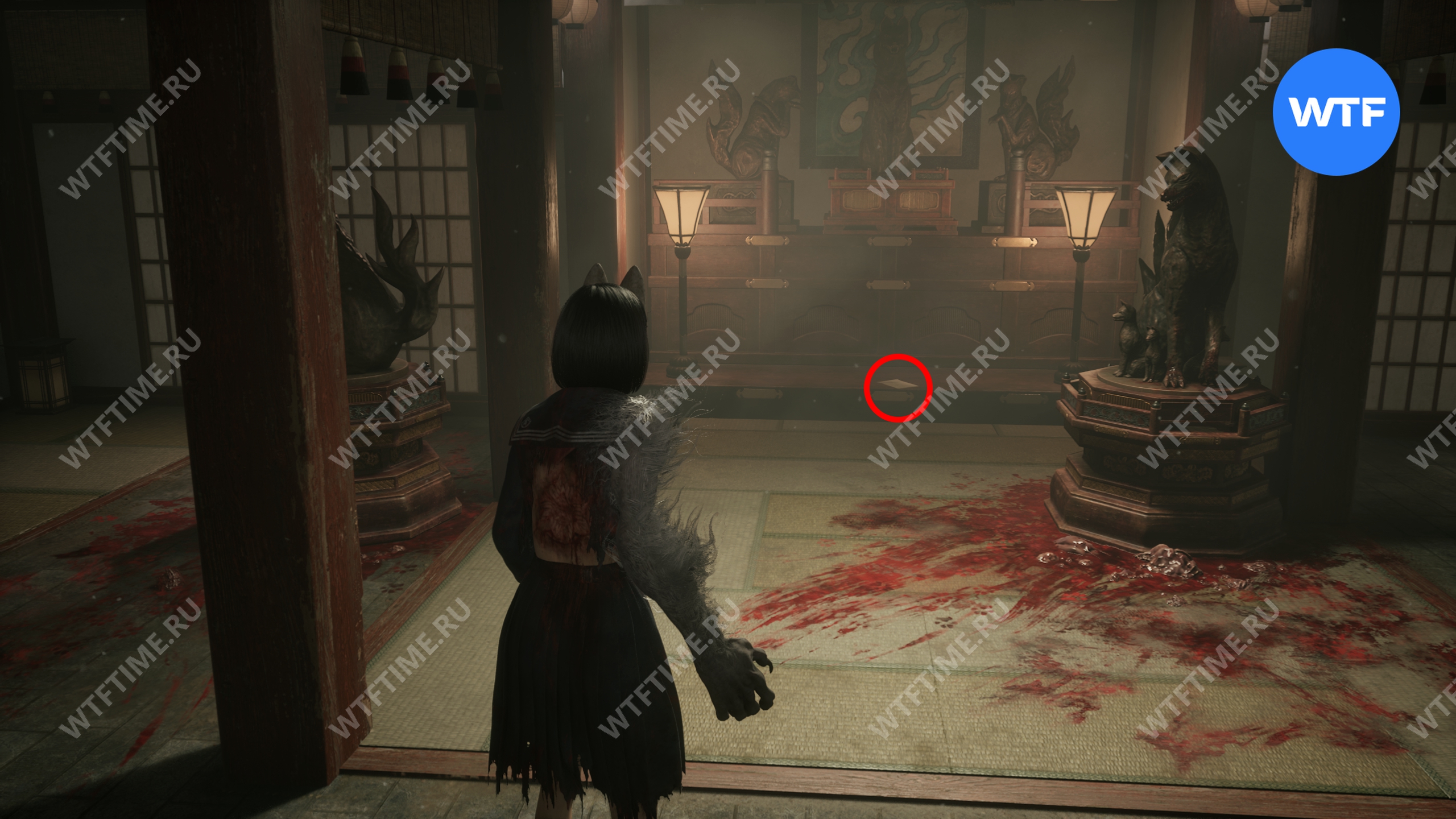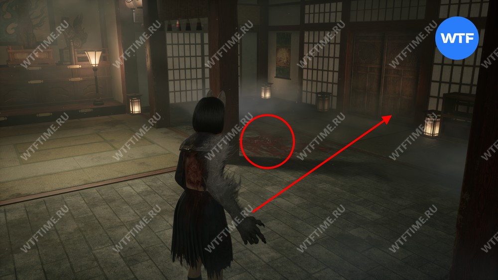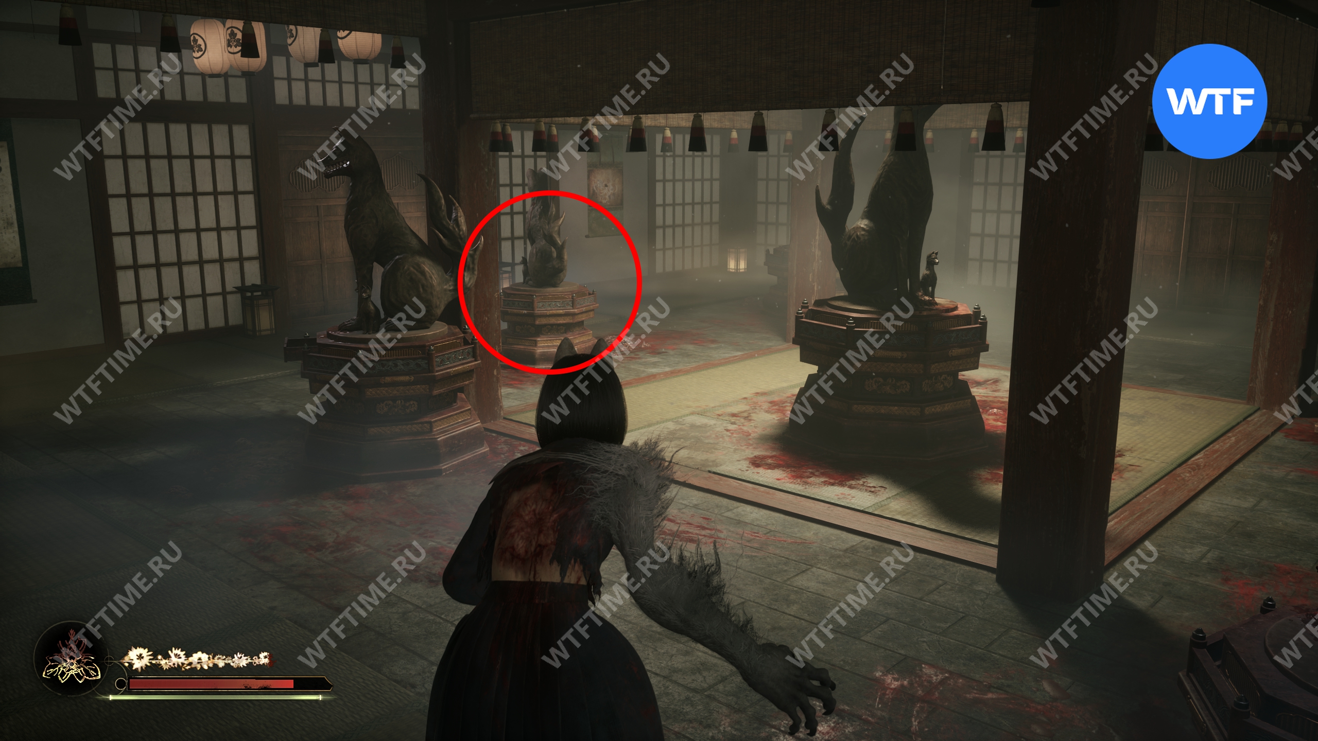 Изначально статуй лисиц здесь нет, поэтому чтобы выбрать правильное направление, вы должны использовать концентрацию на луже крови в правой части комнаты. Появившаяся статуя укажет вам на дверь справа.