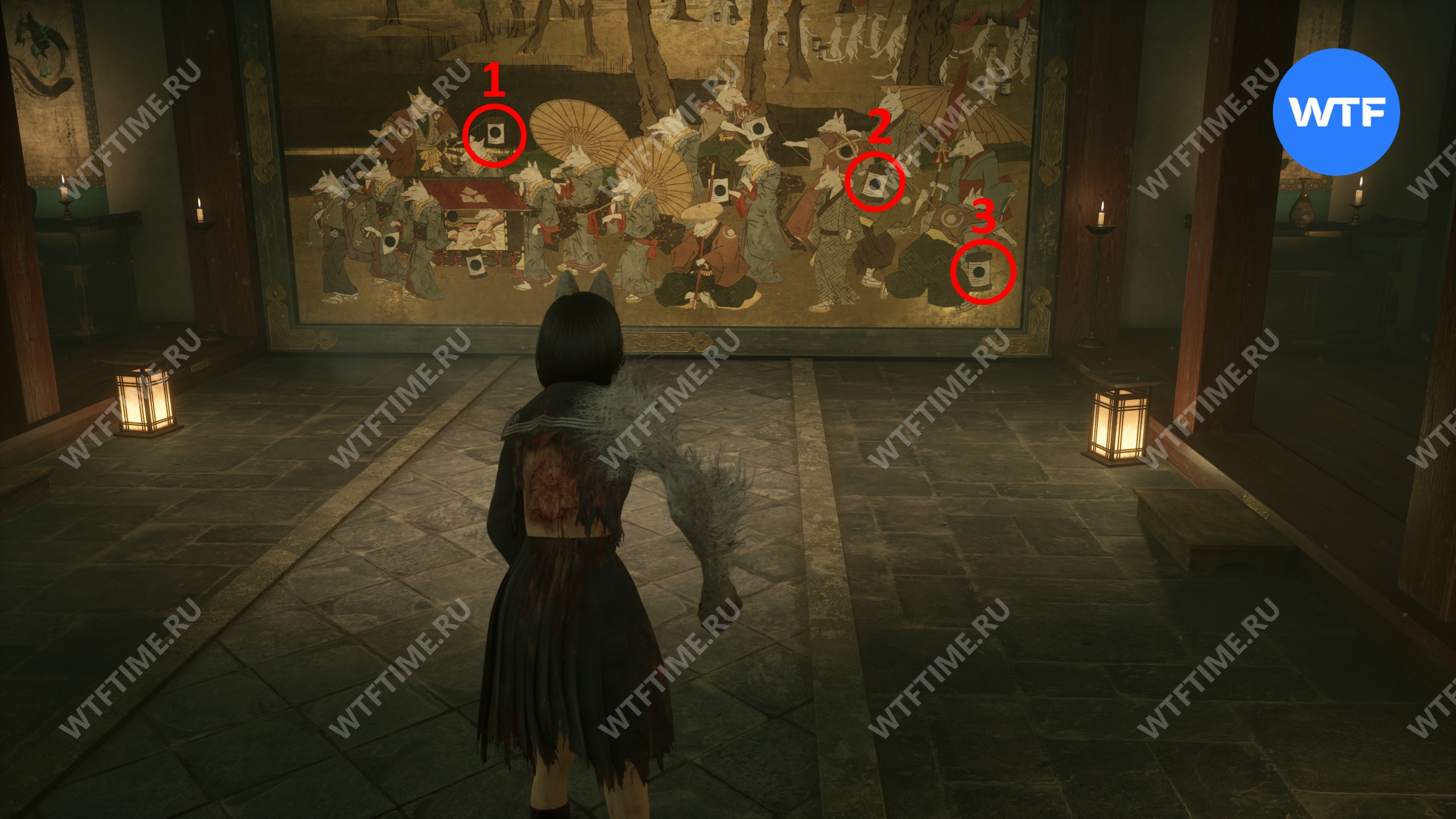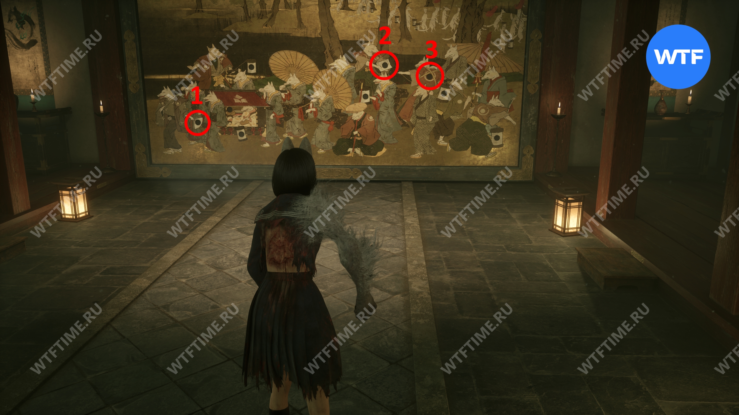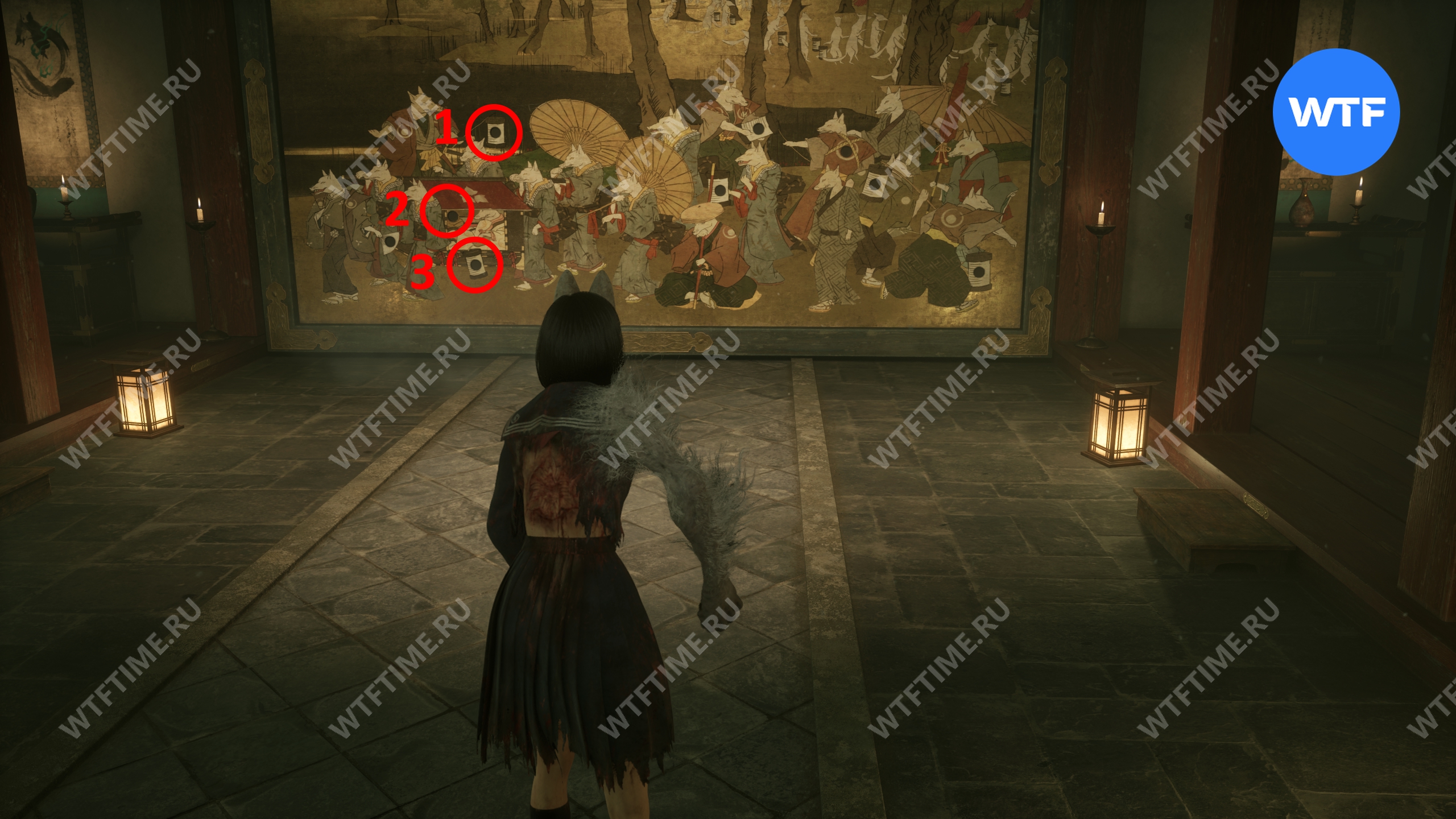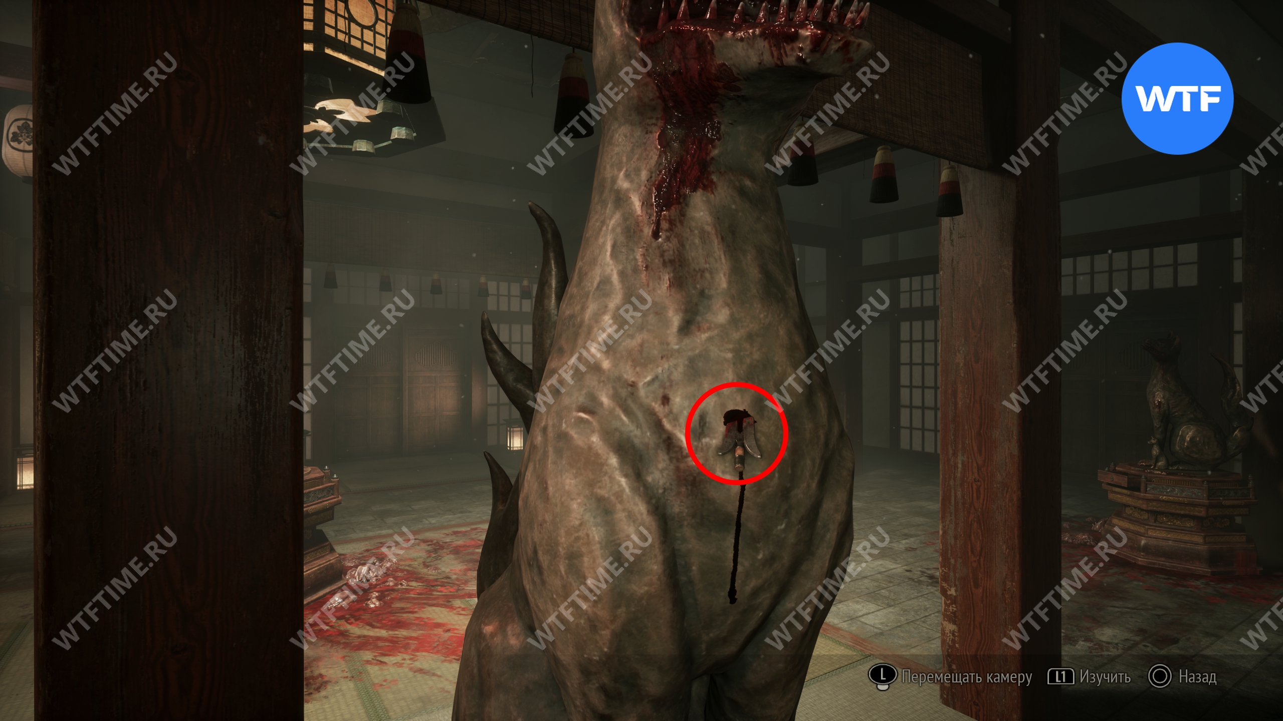 Изначально статуй лисиц здесь нет, поэтому чтобы выбрать правильное направление, вы должны использовать концентрацию на луже крови в правой части комнаты. Появившаяся статуя укажет вам на дверь справа.