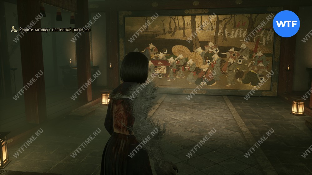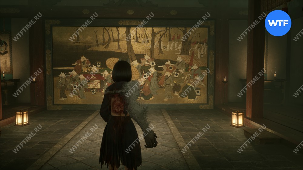 После прохождения Дома семьи Симидзу вы снова перенесетесь туда, где в последний раз виделись с Лисьей Маской. Идите по коридору вперед, пройдите через мост и откройте двойные двери, чтобы оказаться в комнате с большой фреской с лисами перед вами.