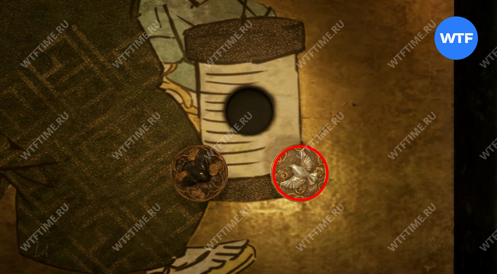Затем идите по коридору до конца и окажетесь у алтаря, на котором стоит небольшая шкатулка. Внутри вы найдете герб с черным воробьем.