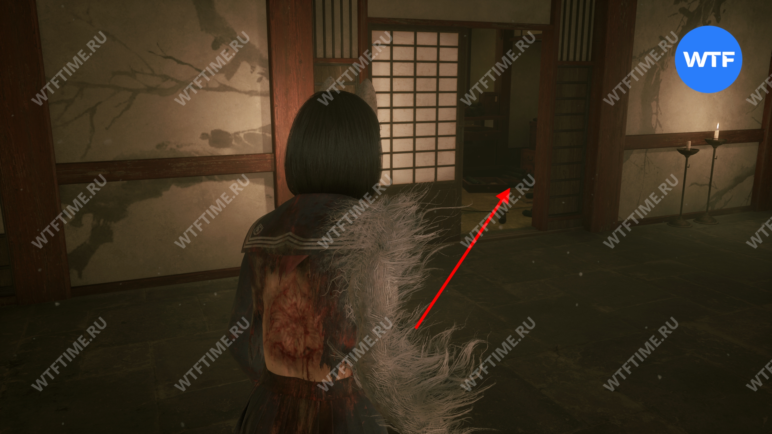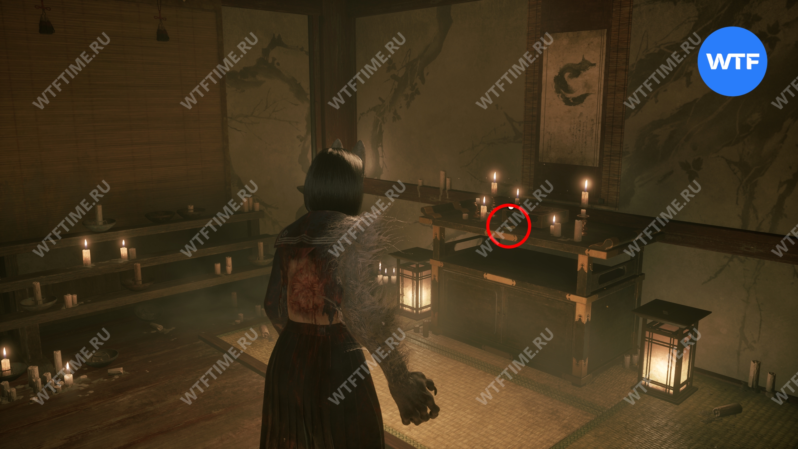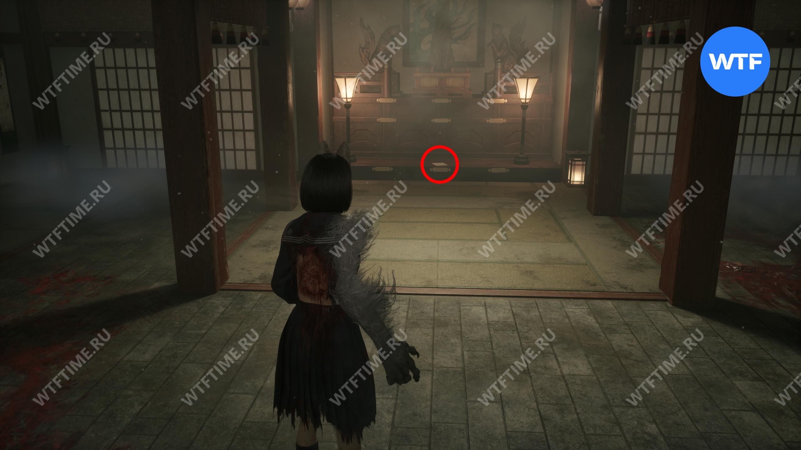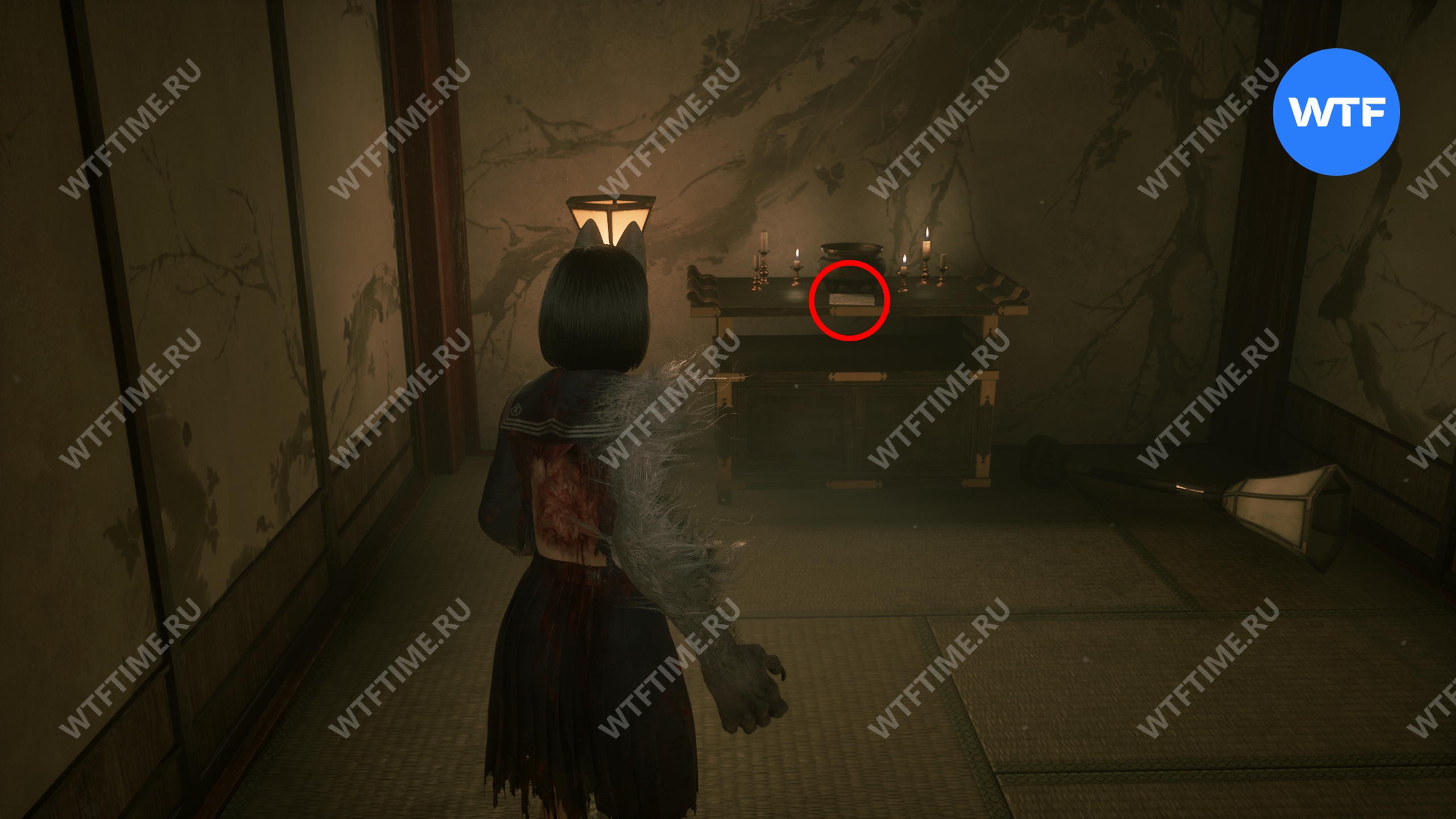 Это приведет вас в длинный коридор с дверьми по обеим сторонам. Пройдите через первую дверь справа, чтобы забрать со стола Омамори-собаку, который немного восстанавливает уровень здравомыслия после победы над врагами.