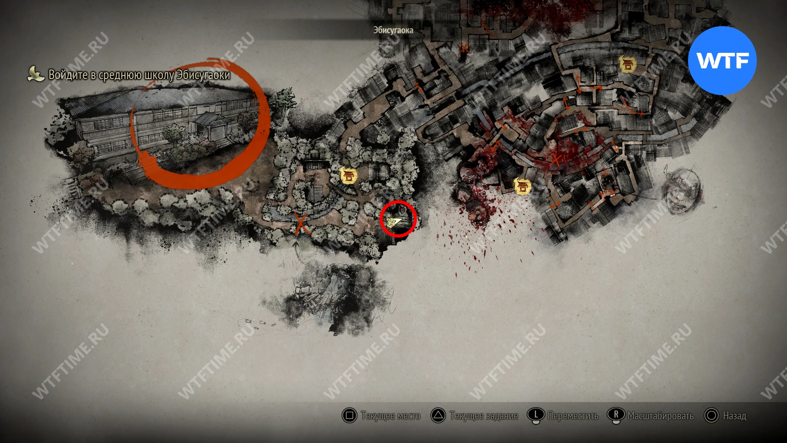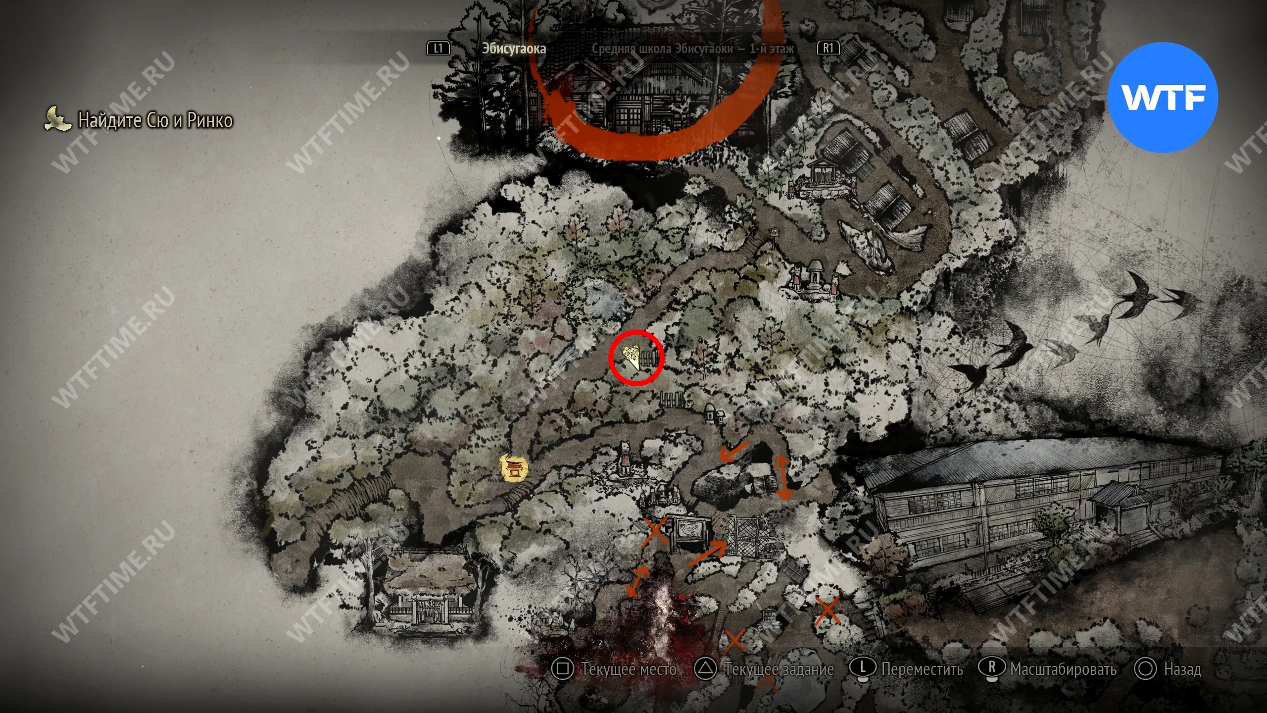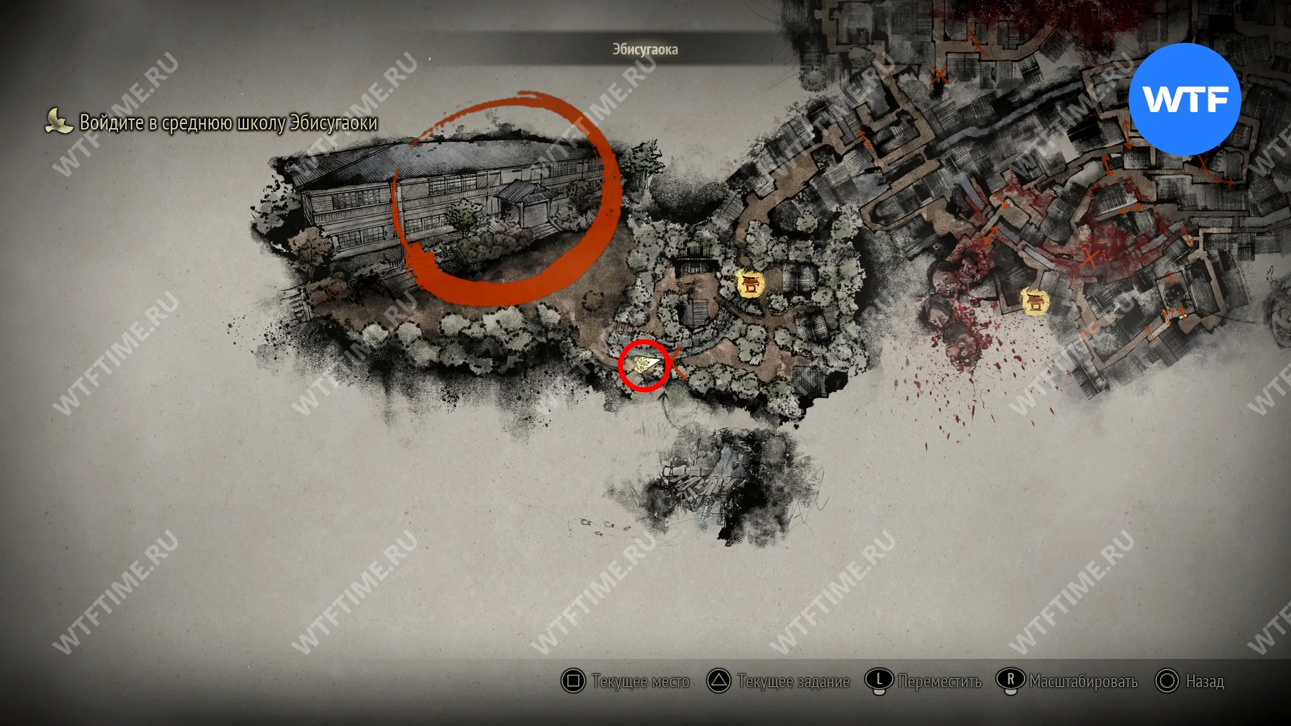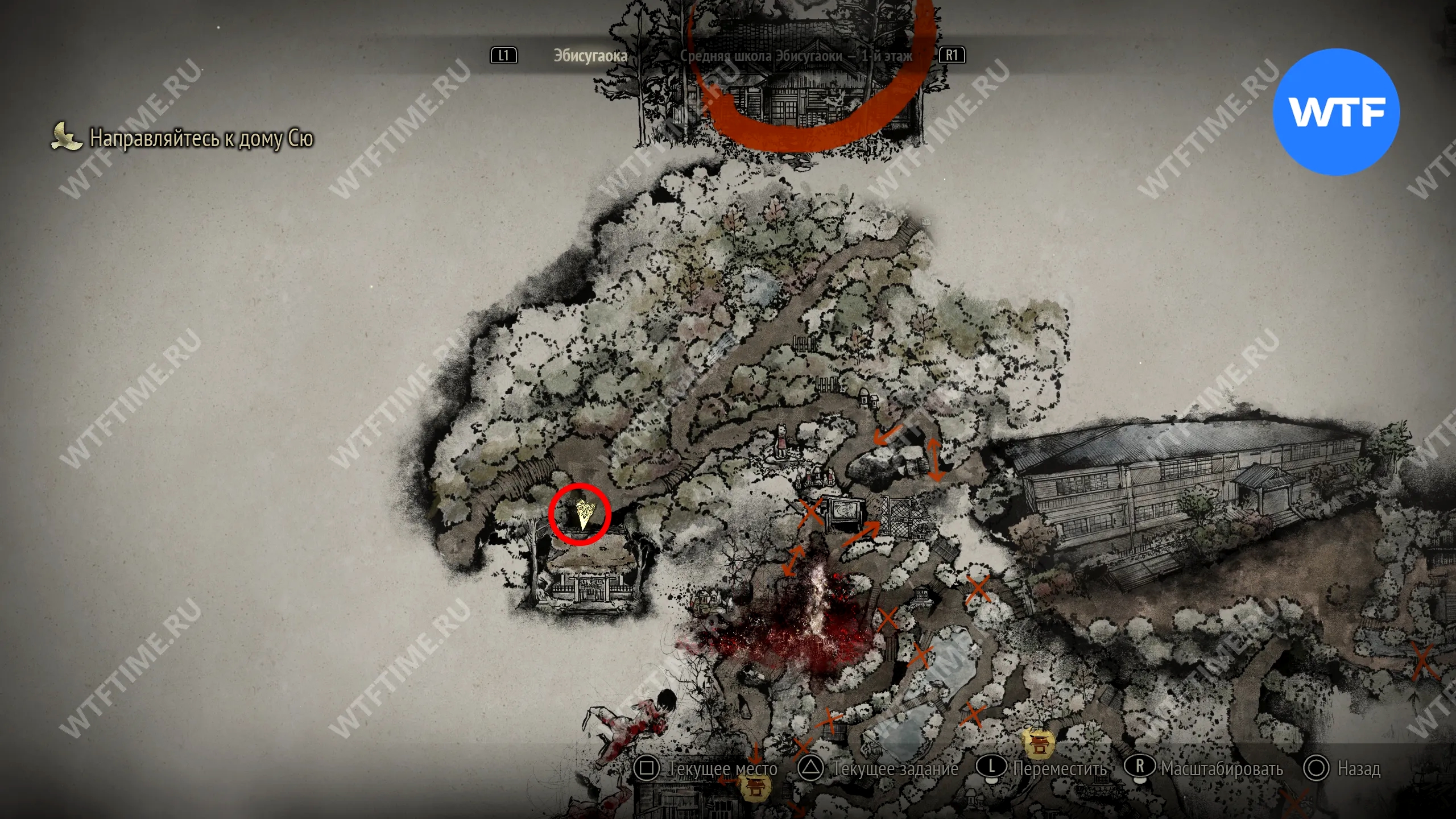 Чтобы очистить Священный меч, во время своего пятого визита в Эбисугаоку идите к святилищу, отмеченному на карте ниже. Если в Главном зале вы решили загадку «Багряная жидкость», здесь появится ванна, наполненная кровью.
