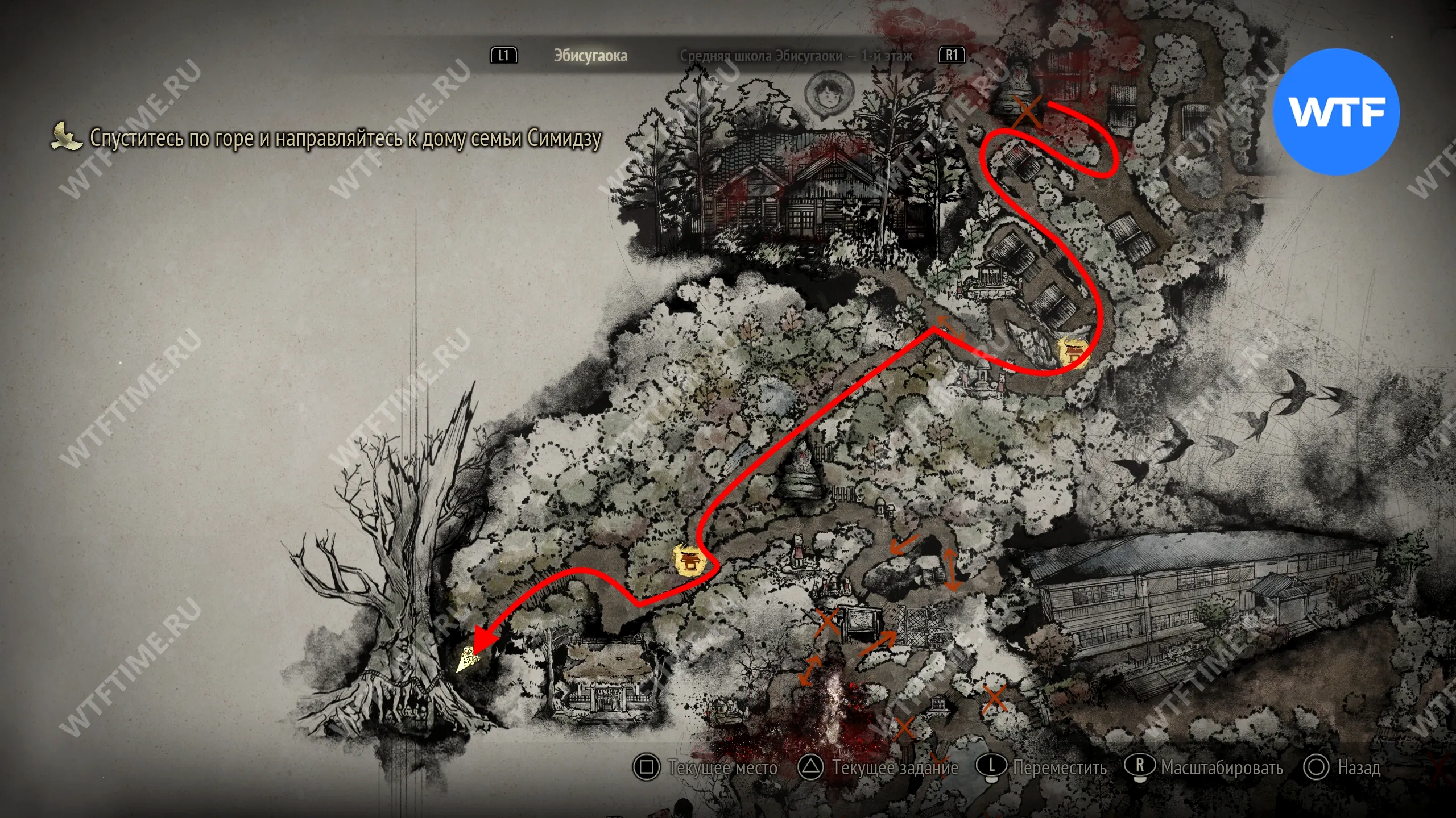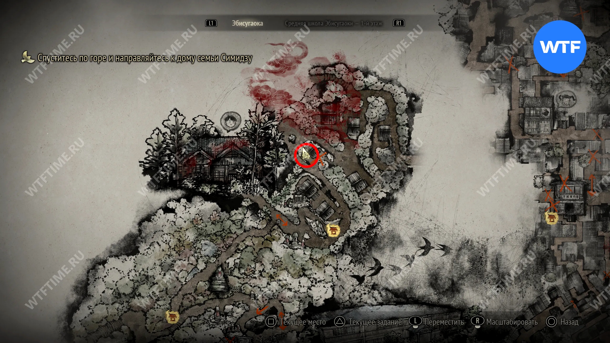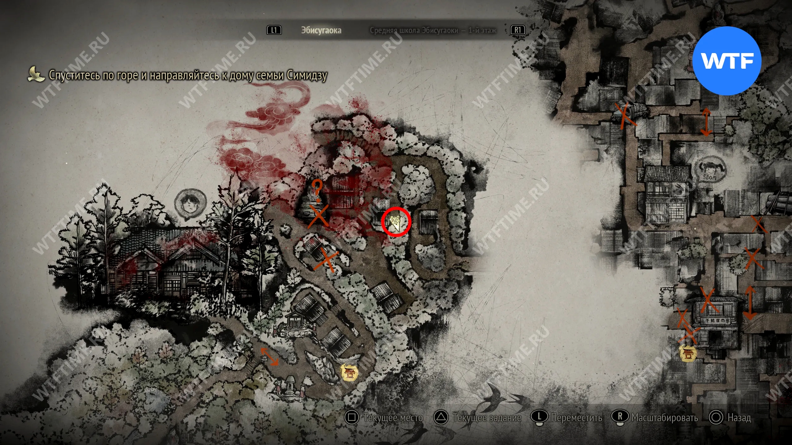 Чтобы очистить Священный меч, во время своего пятого визита в Эбисугаоку идите к святилищу, отмеченному на карте ниже. Если в Главном зале вы решили загадку «Багряная жидкость», здесь появится ванна, наполненная кровью.