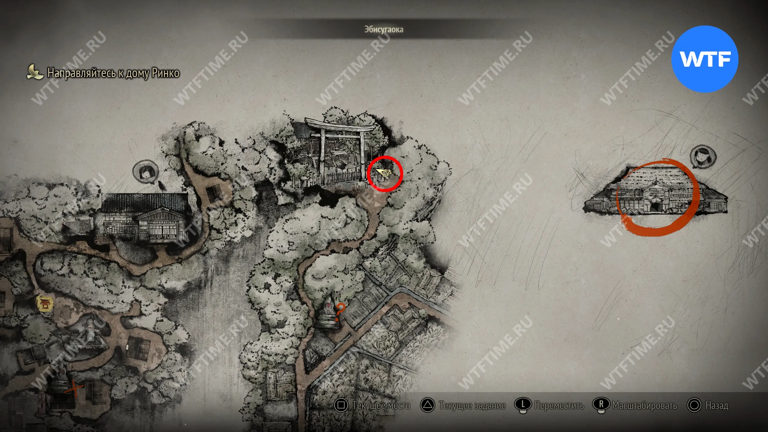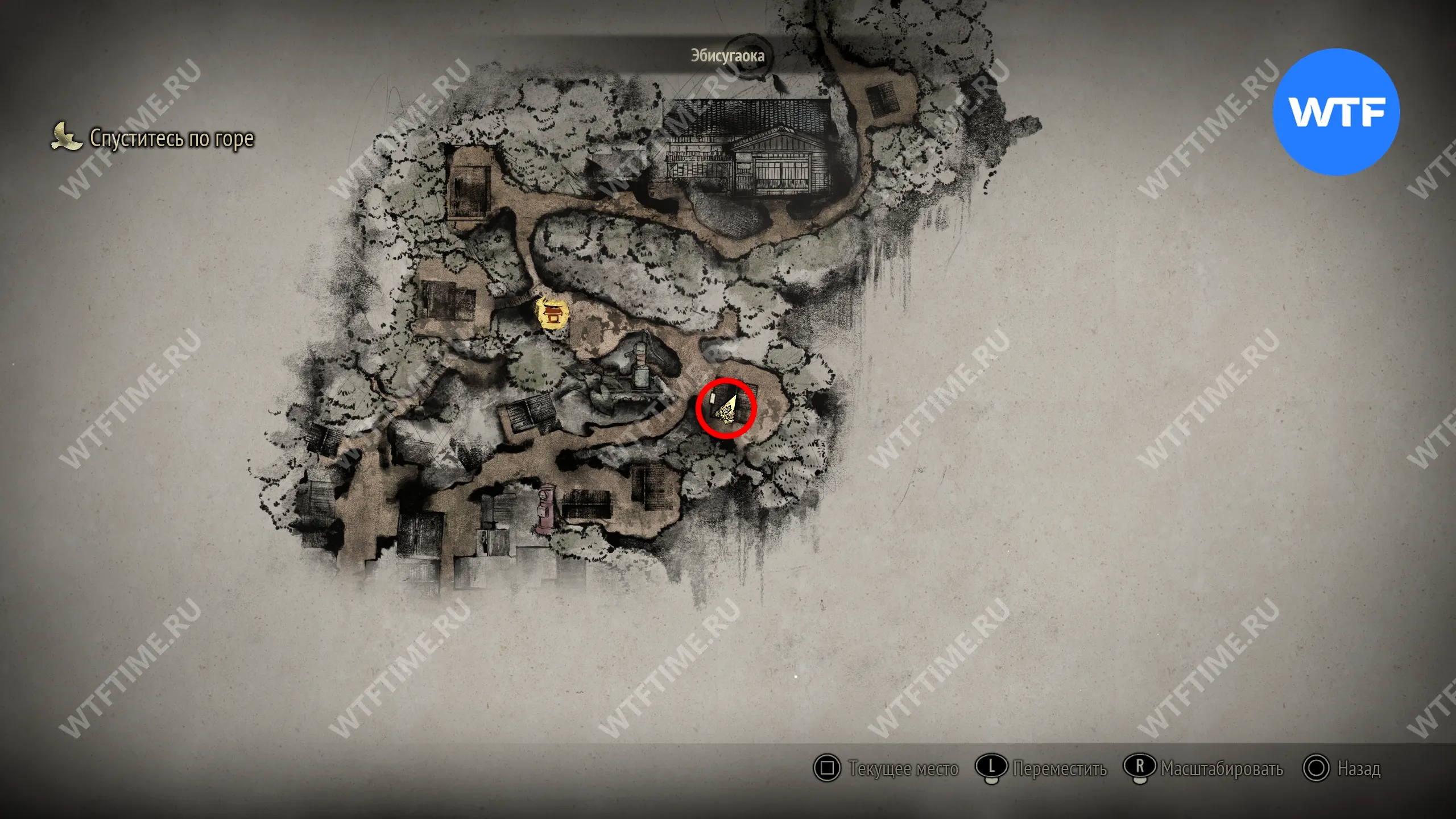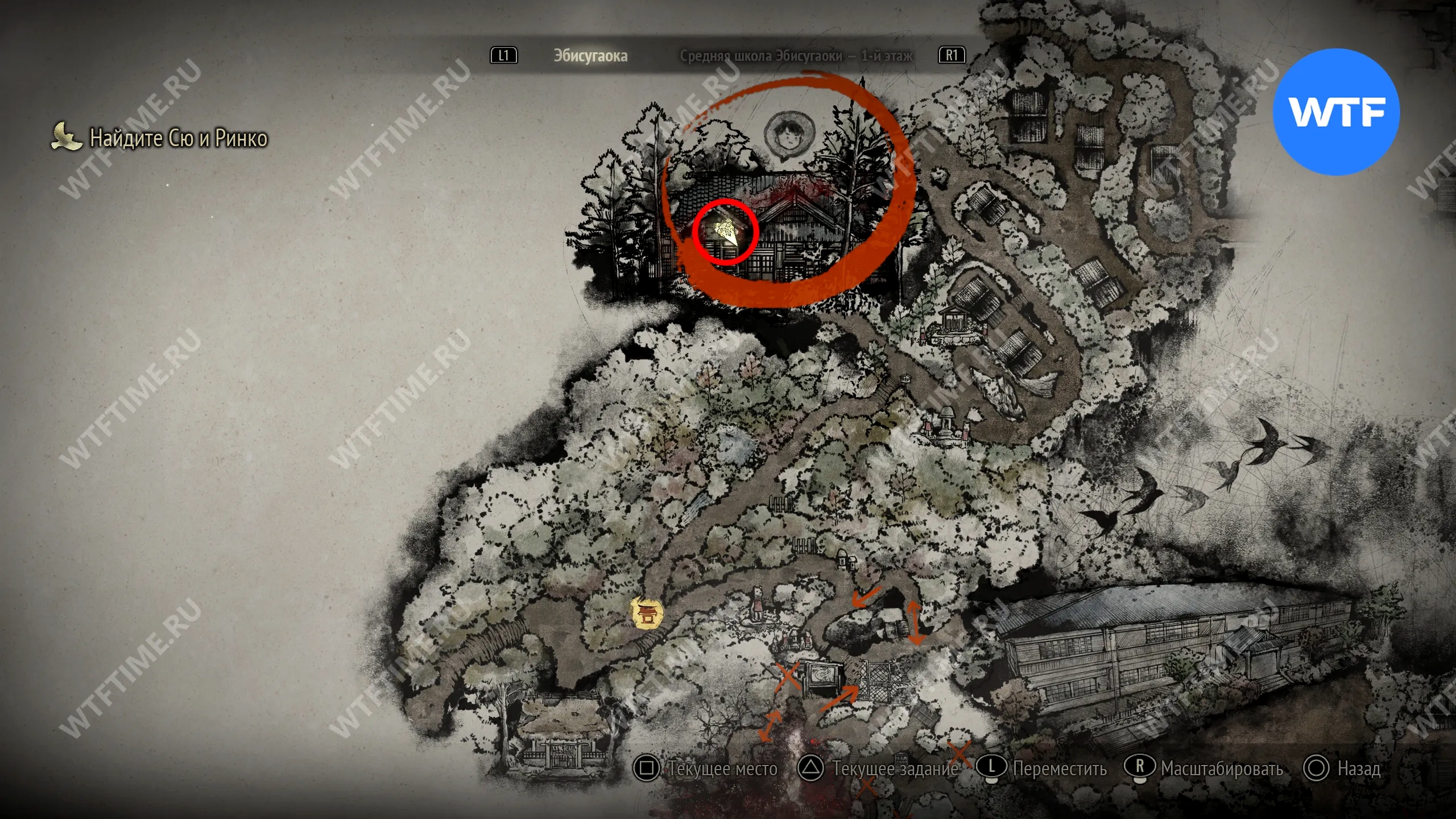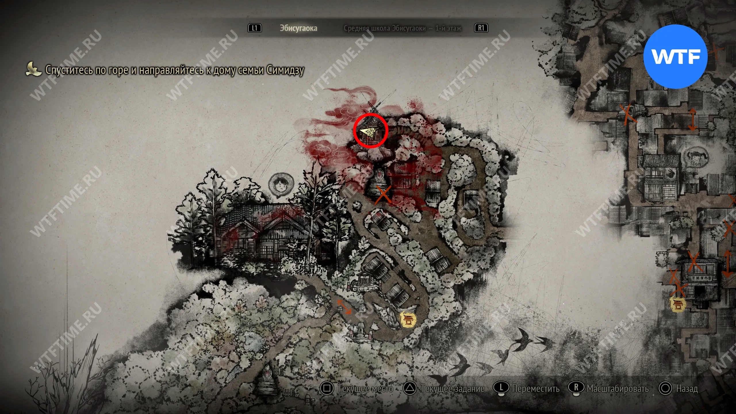 Чтобы очистить Священный меч, во время своего пятого визита в Эбисугаоку идите к святилищу, отмеченному на карте ниже. Если в Главном зале вы решили загадку «Багряная жидкость», здесь появится ванна, наполненная кровью.