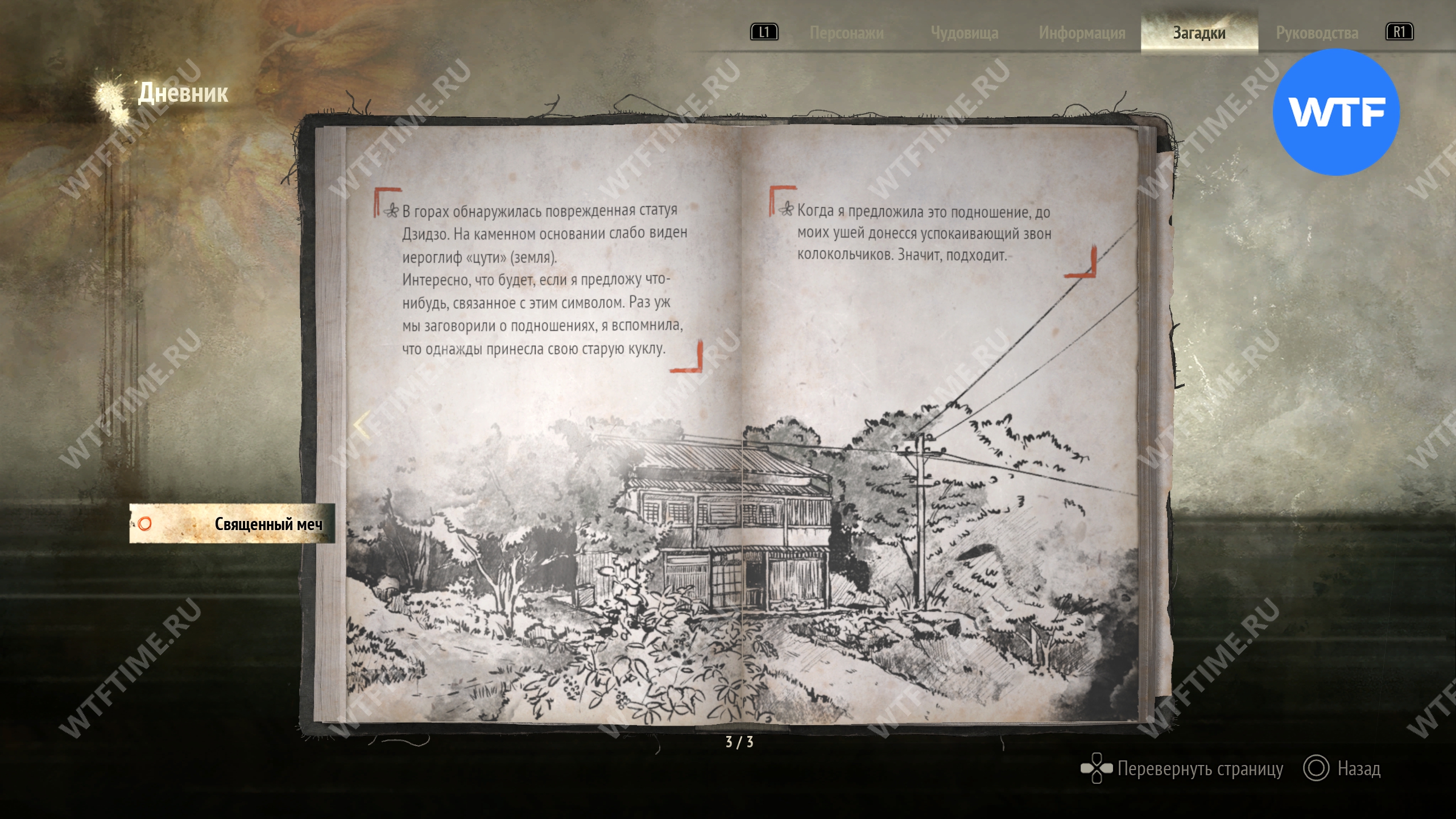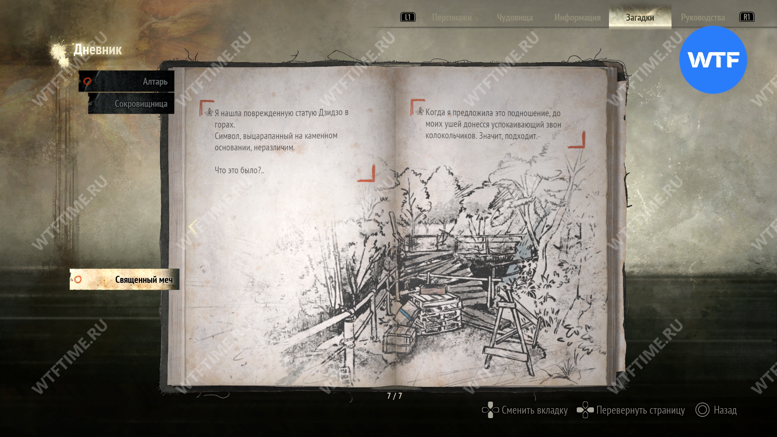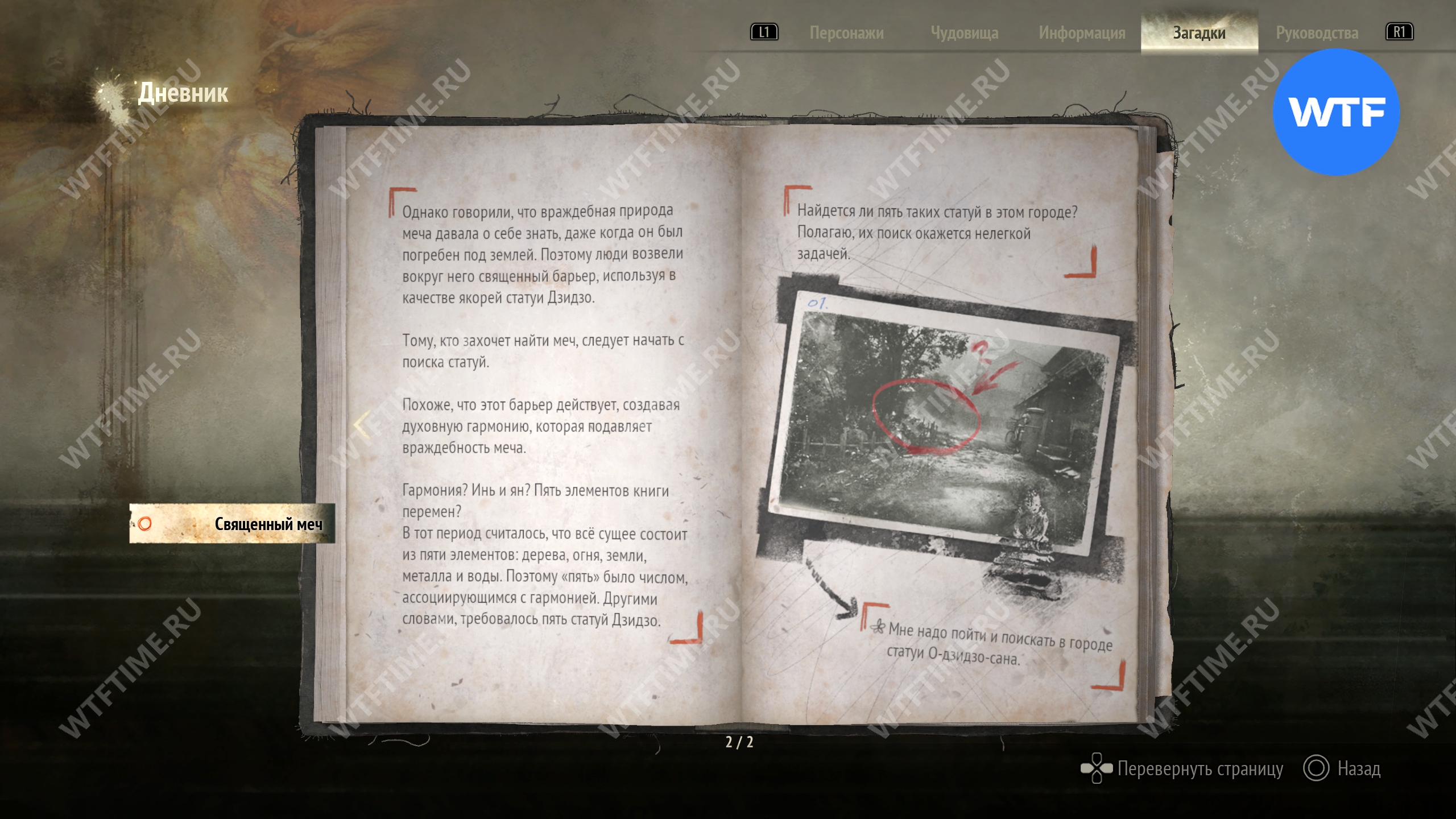 Загадка «Священный меч» будет добавлена в ваш журнал, как только вы найдете первое фото из дневника исследователя и прилагающиеся к нему записи. Она проходит через всю Новую игру+ и является обязательной для получения новых концовок.