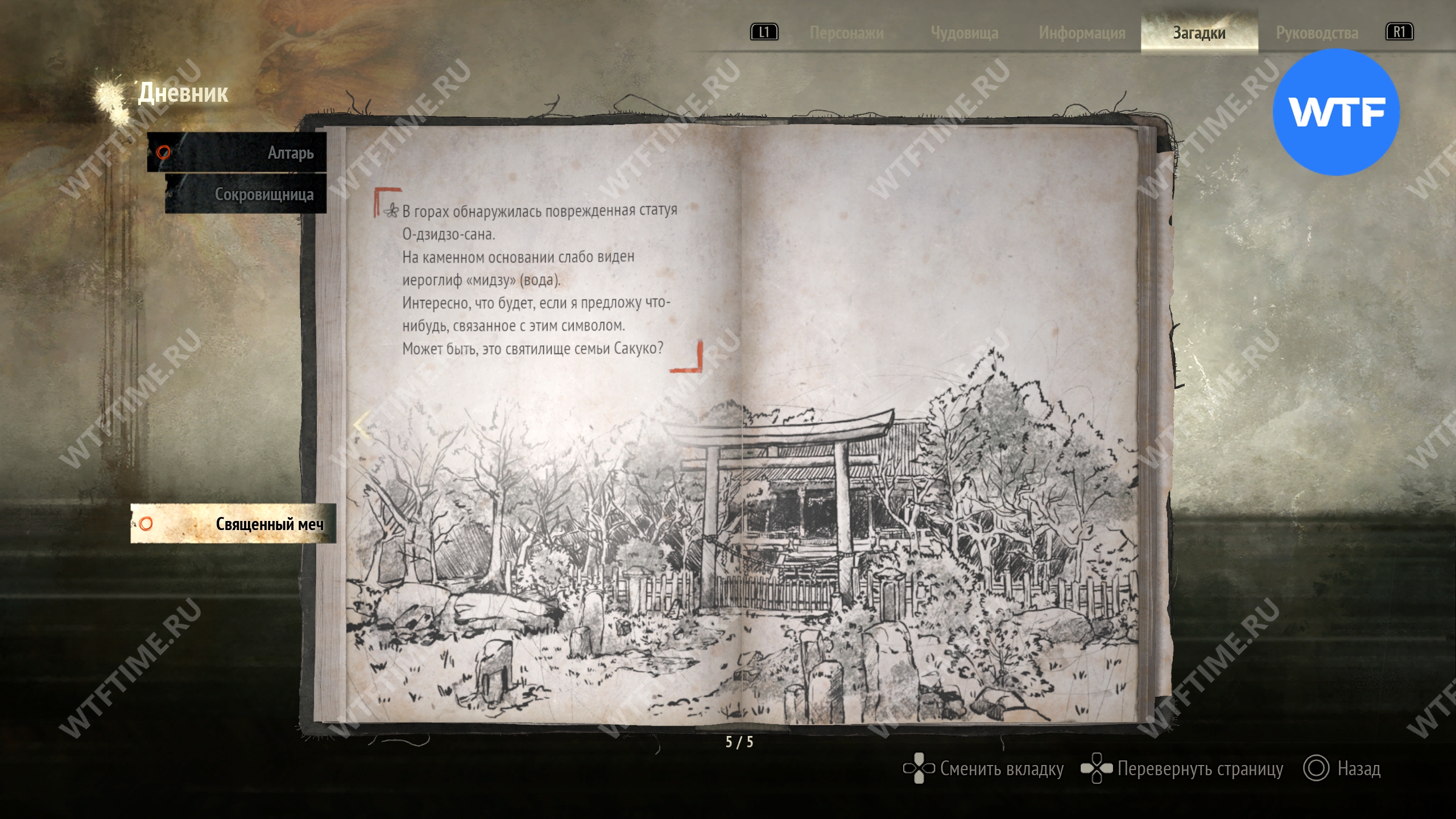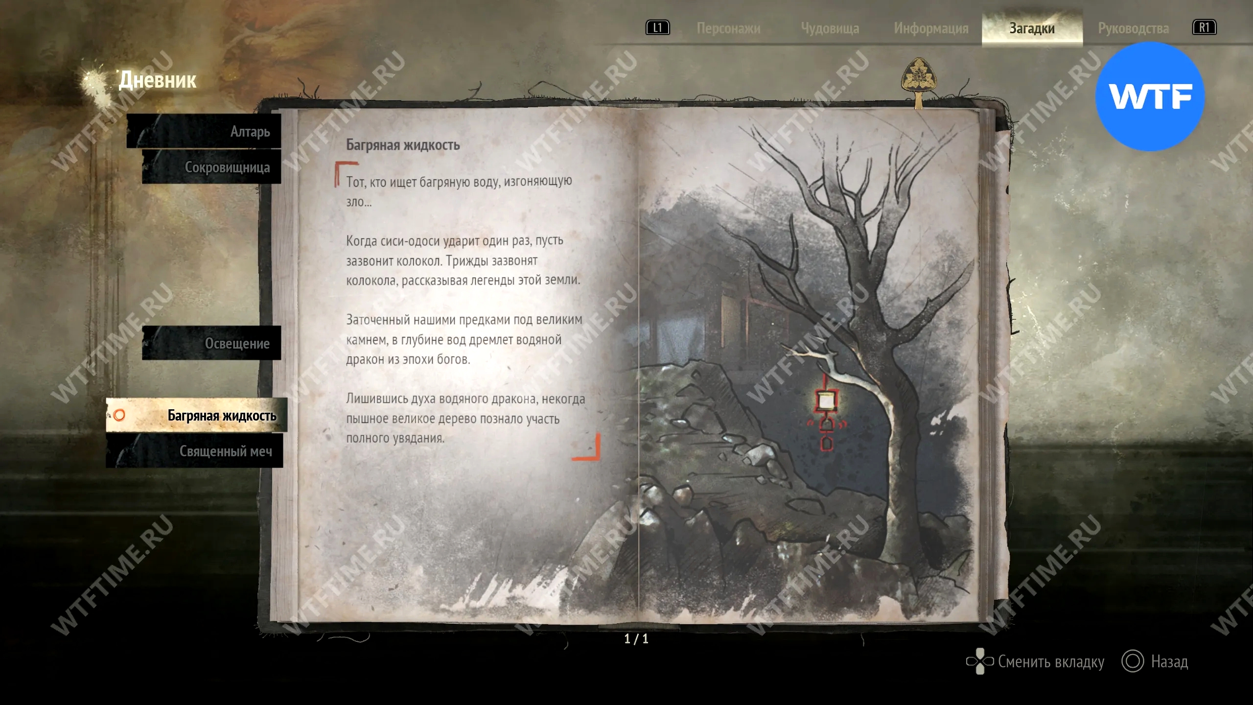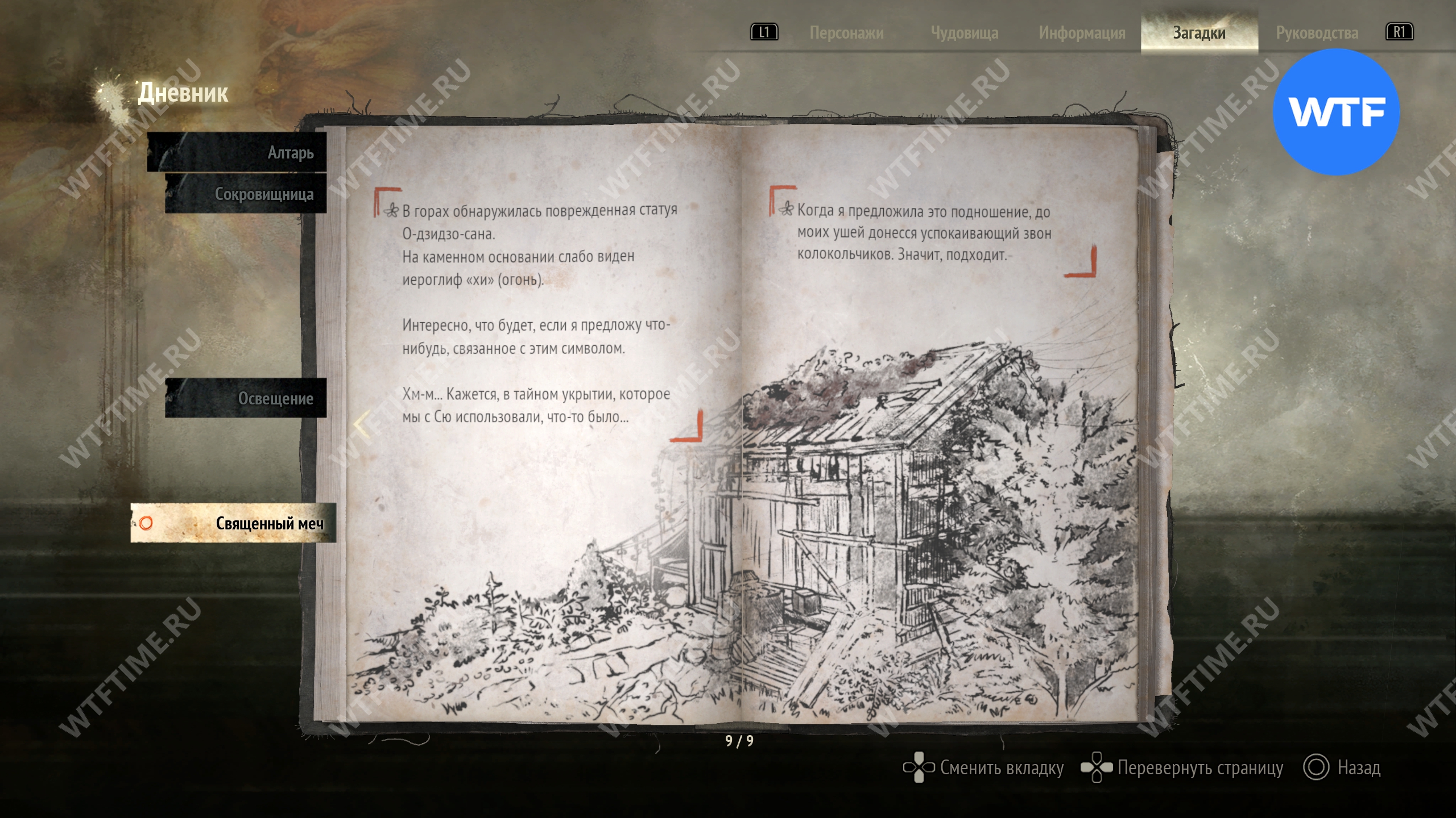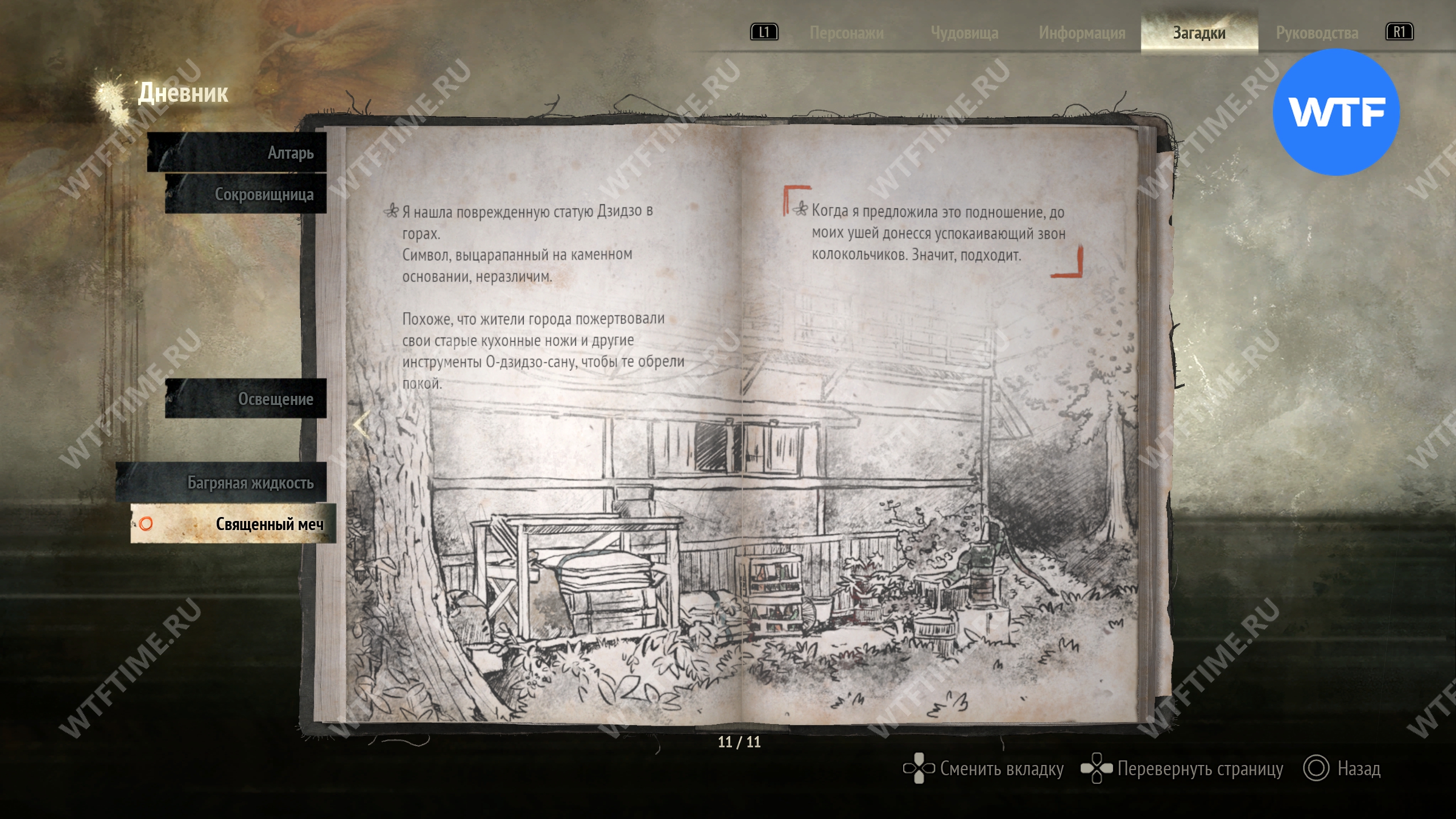 Загадка «Священный меч» будет добавлена в ваш журнал, как только вы найдете первое фото из дневника исследователя и прилагающиеся к нему записи. Она проходит через всю Новую игру+ и является обязательной для получения новых концовок.