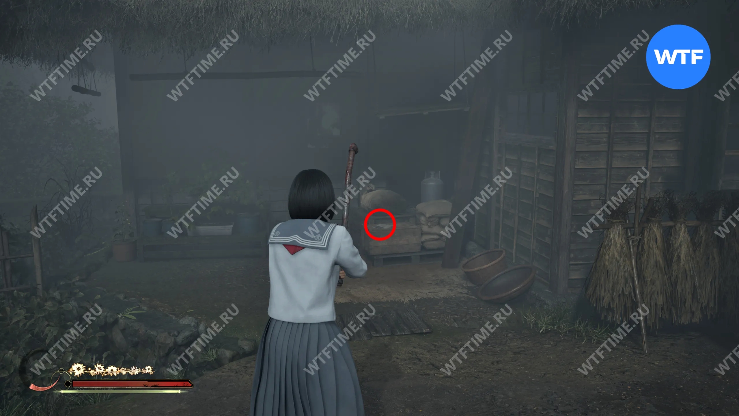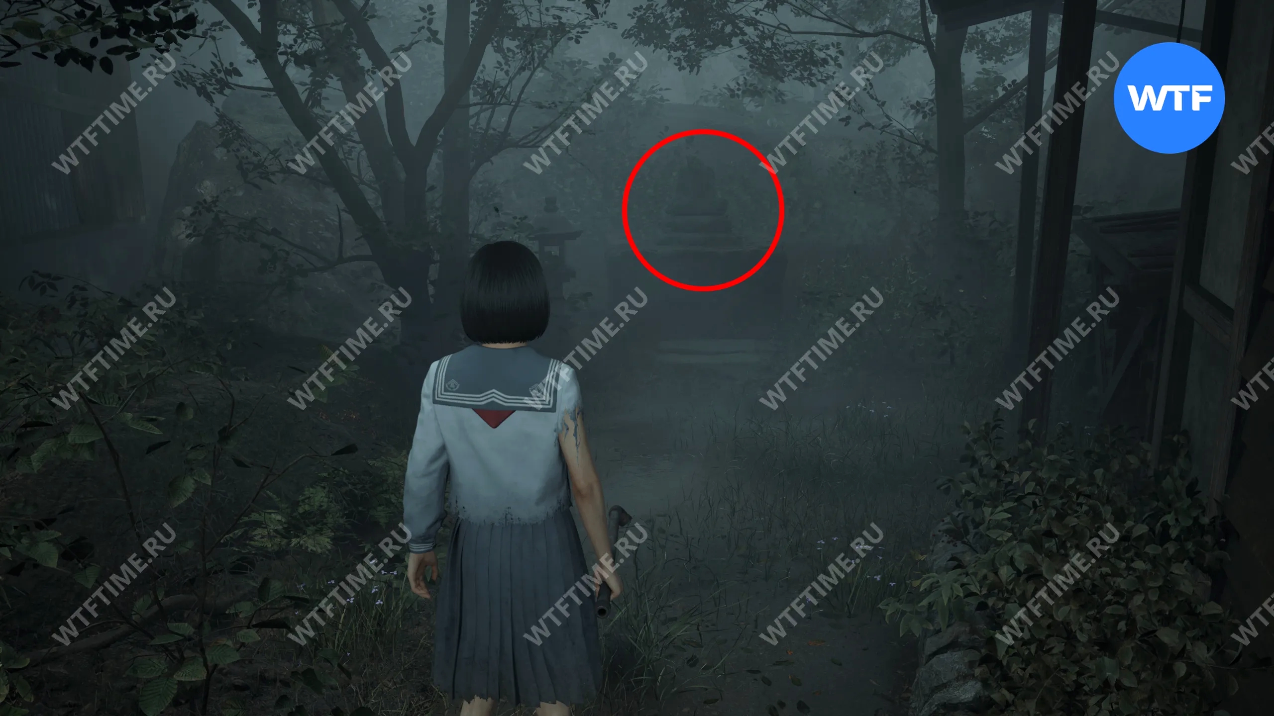 После того как вы сбежите от Туманного чудовища во время четвертого визита в Эбисугаоку, поднимитесь по лестнице слева от точки сохранения на один пролет и заберите документ «Фото из дневника исследователя 4» из заброшенного святилища.