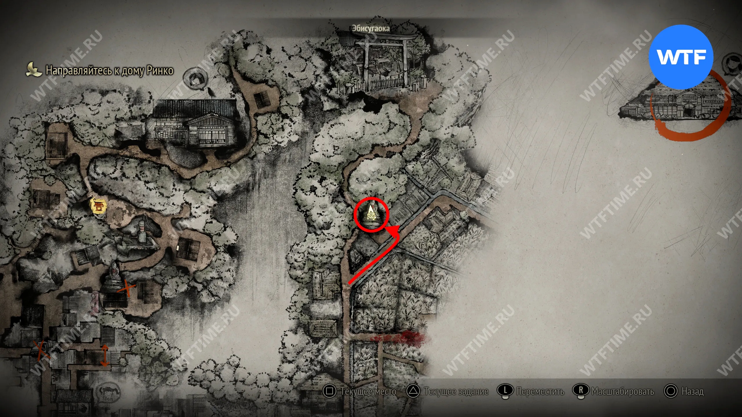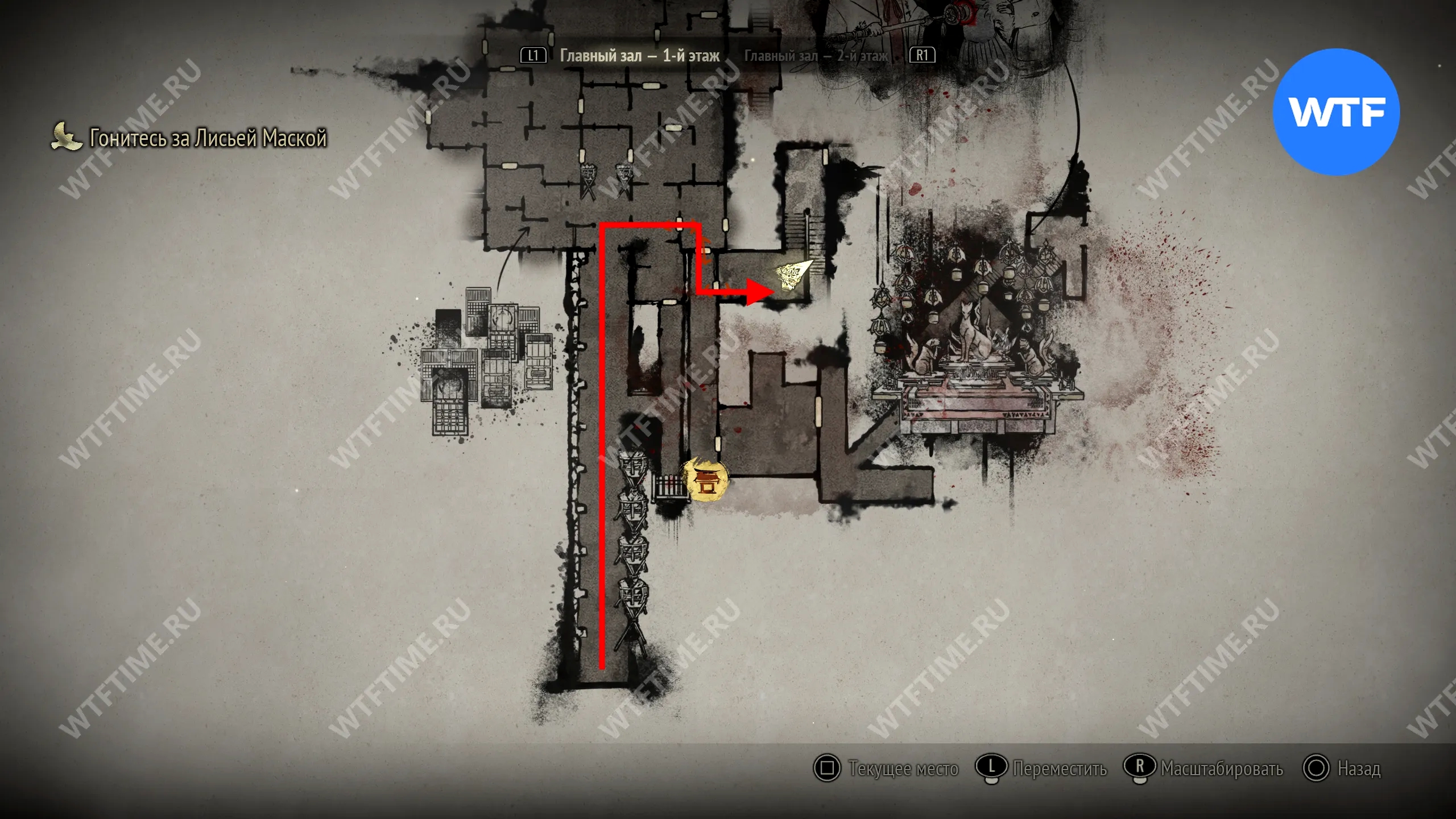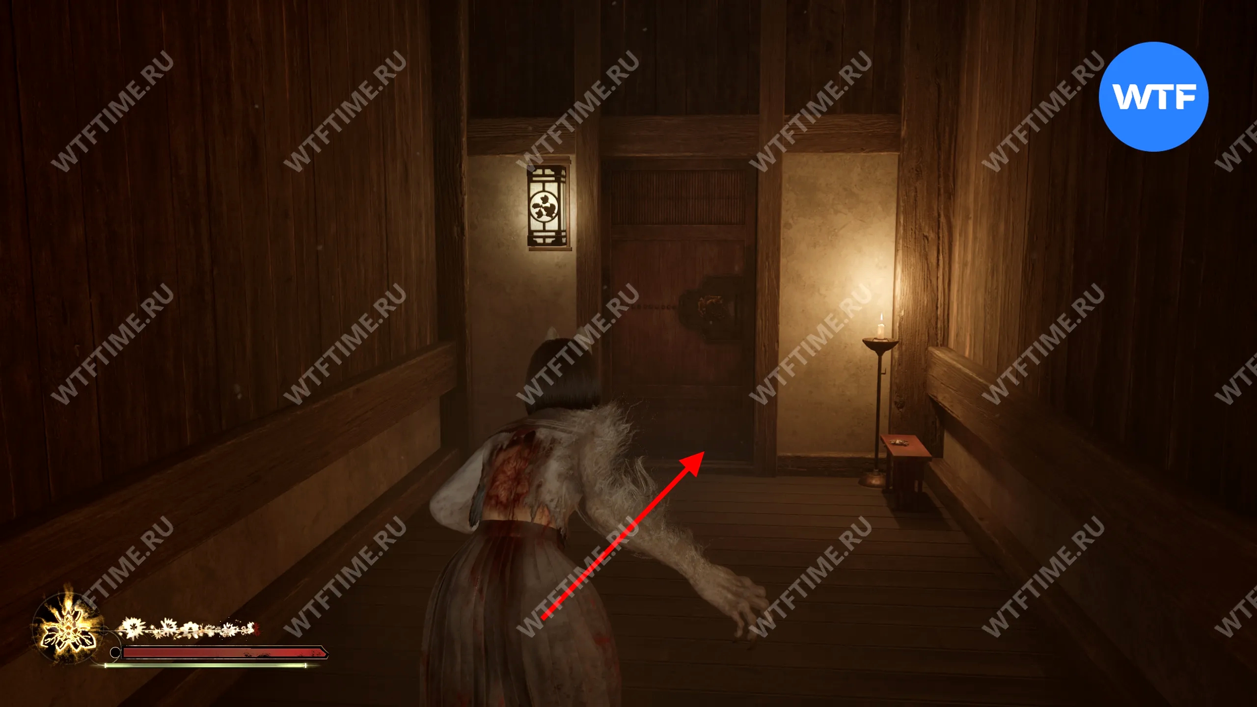 Это приведет вас в узкий коридор, упирающийся в дверь с эмблемой Инари-сама. Отрыв её, вы окажетесь в Обители багряной воды. Чтобы решить загадку, нужно позвонить в три колокольчика здесь в правильном порядке. Подробнее об этом мы писали в отдельном гайде: