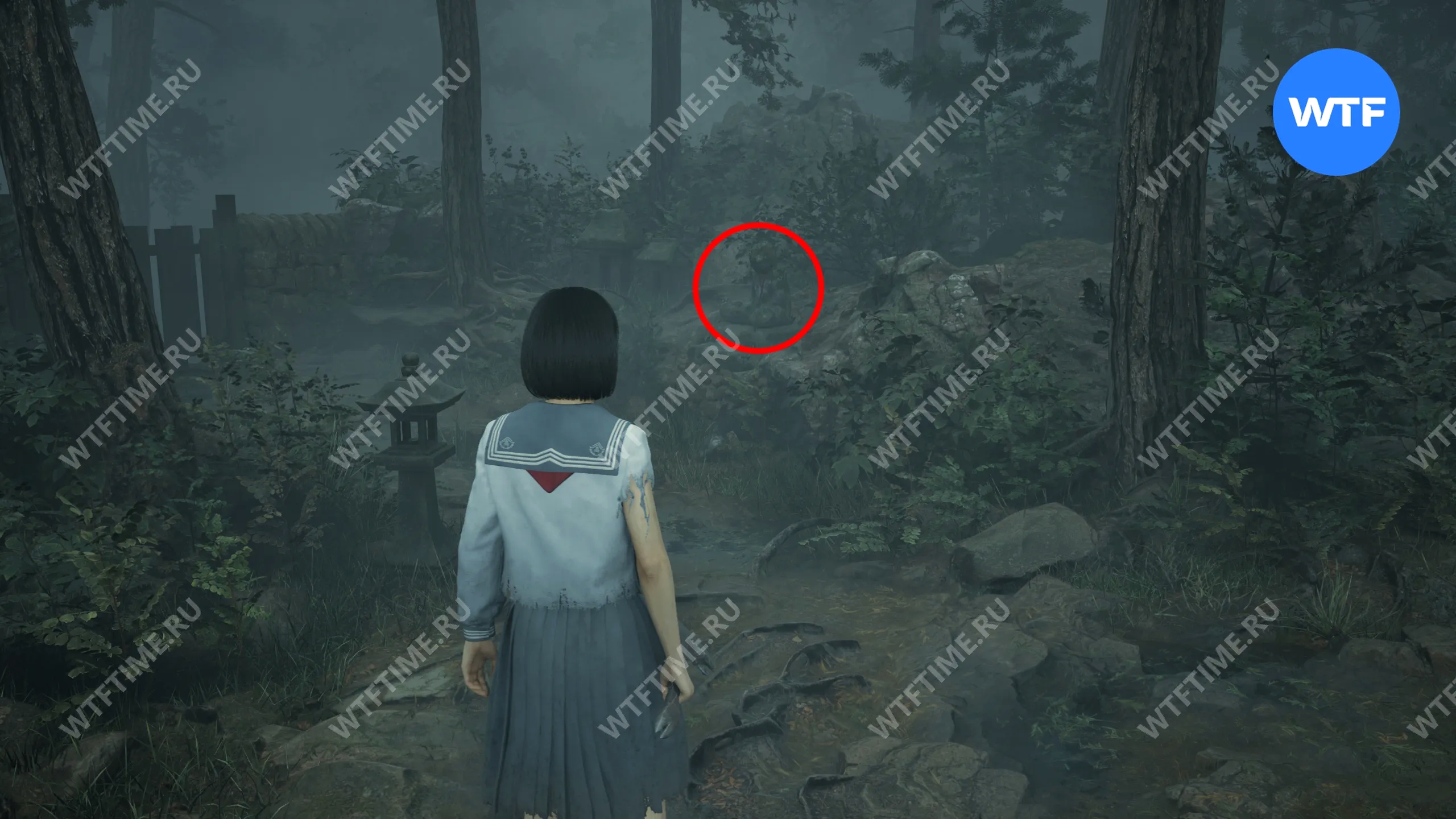 Чтобы найти статую Дзидзо, от святилища хокора идите по дороге, ведущей к дому Сю. Вы увидите её примерно на середине пути справа от вас. На этот раз подсказка будет следующей:
