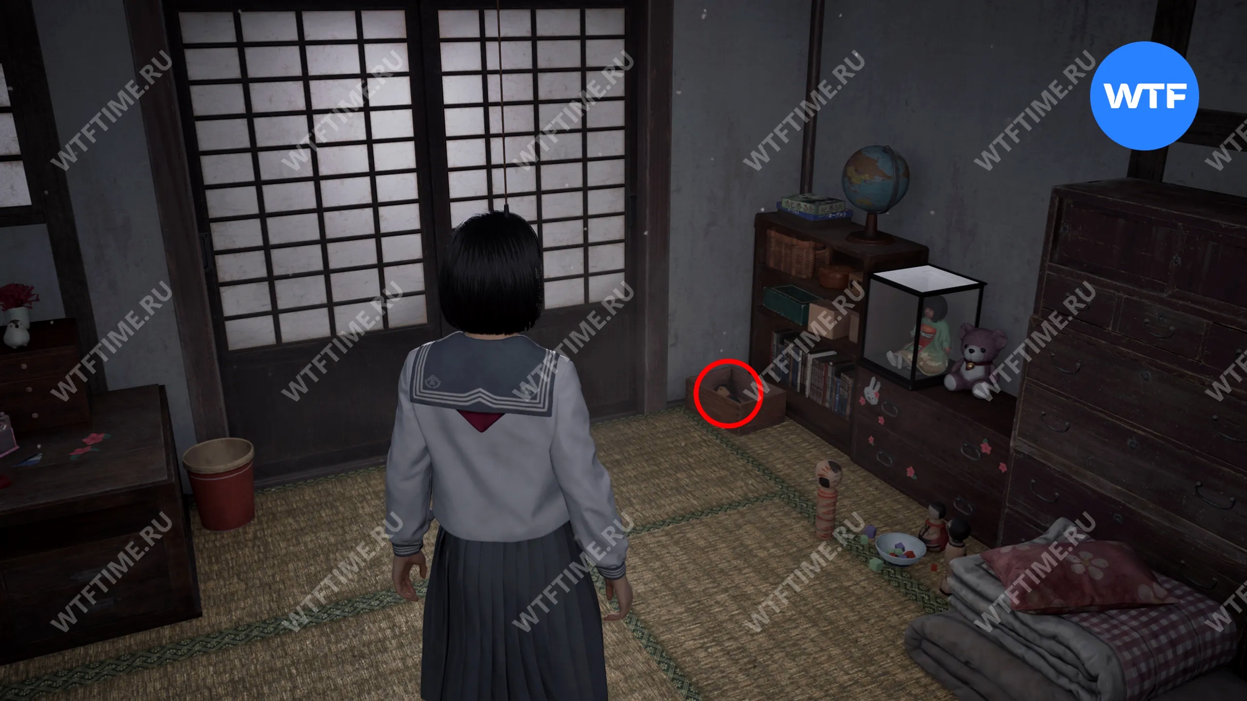 Чтобы найти это подношение, вернитесь в дом, где вы нашли фото, поднимитесь на 2 этаж и войдите в дальнюю комнату возле лестницы. В углу у шкафа с глобусом здесь есть коробка с куклой, к которой прикреплен ключ от балкона.
