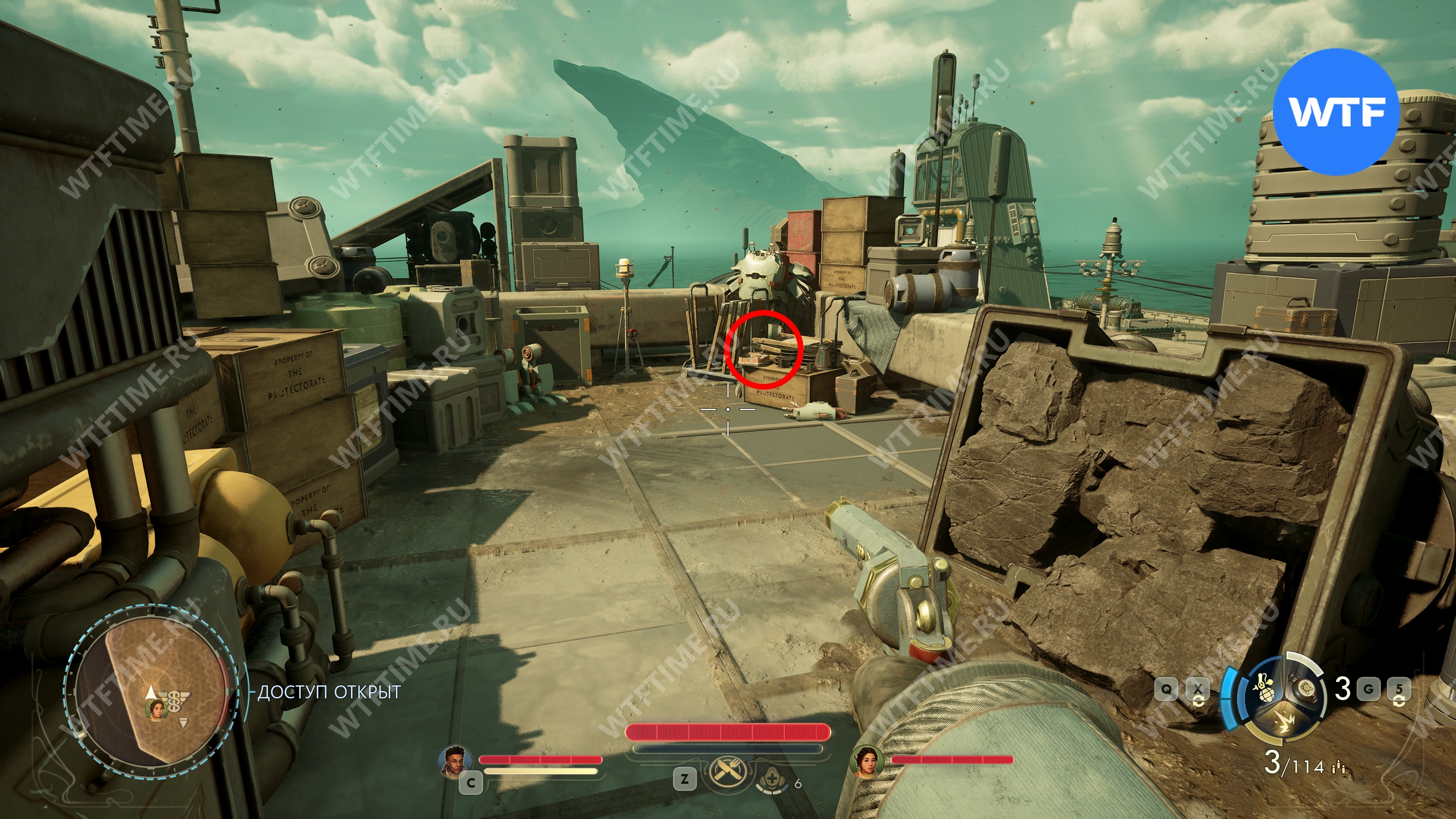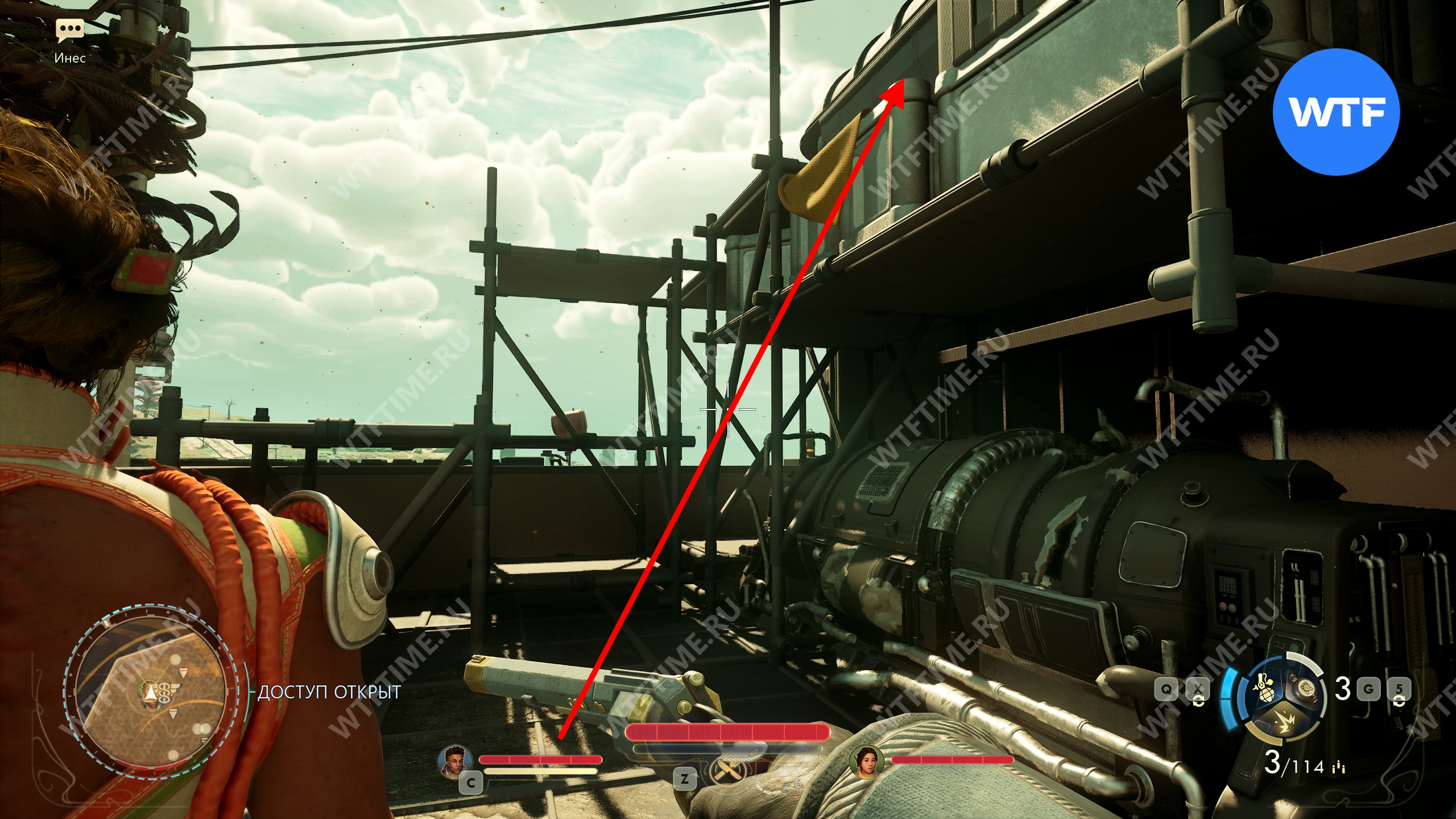 От входа в здание с Дельфинией сверните налево и увидите оранжевые ящики, с которых можно запрыгнуть на крышу. Поднявшись еще выше по строительным лесам, вы найдете запчасти для автоматонов.