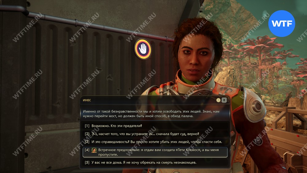Если в момент разговора с вами будет Инес, вы так же сможете сделать смотрительнице встречное предложение: сдать её в обмен на право прохода. В этом случае Инес навсегда покинет вашу группу и будет подвешена в позорной капсуле на мосту.