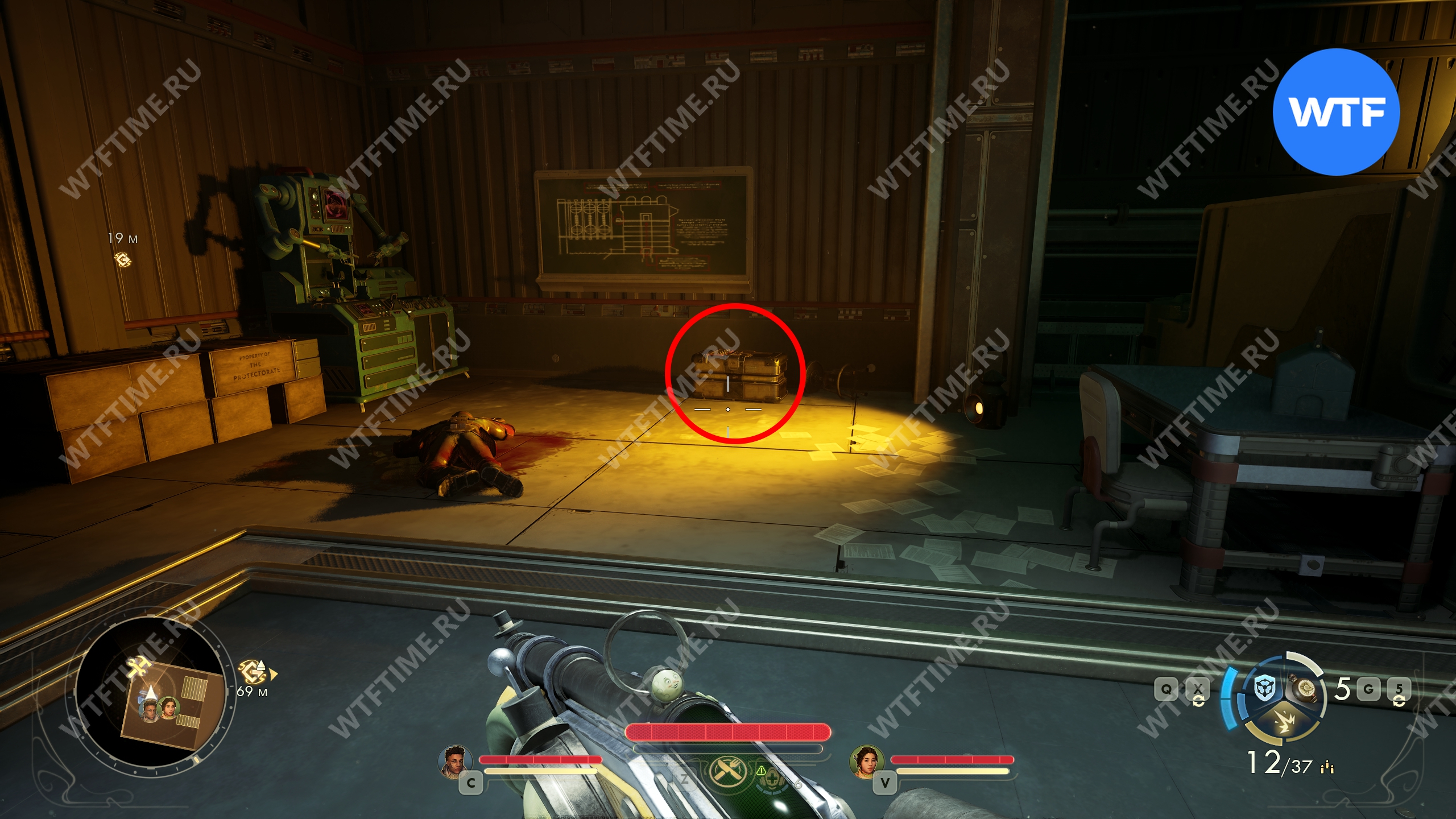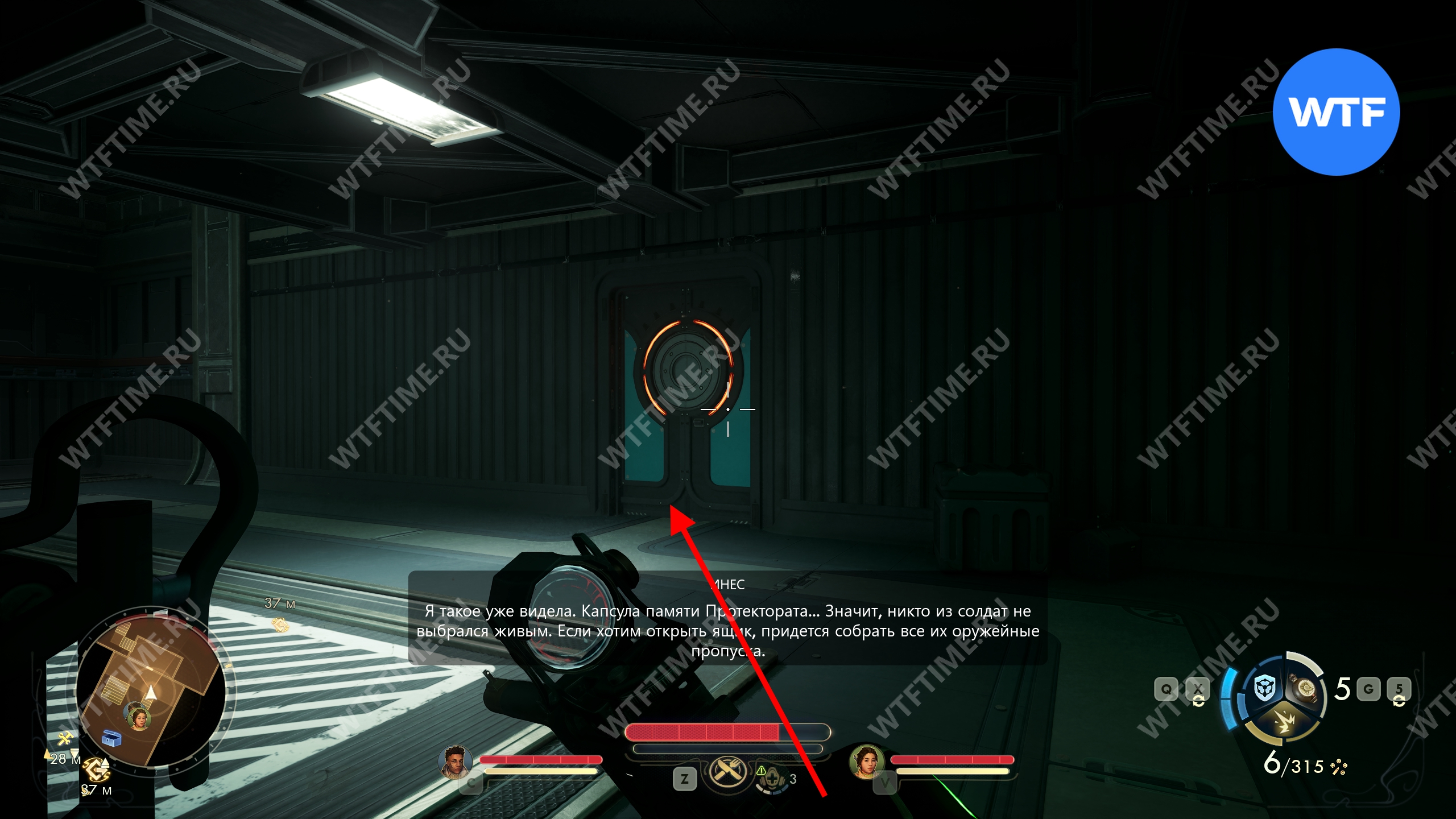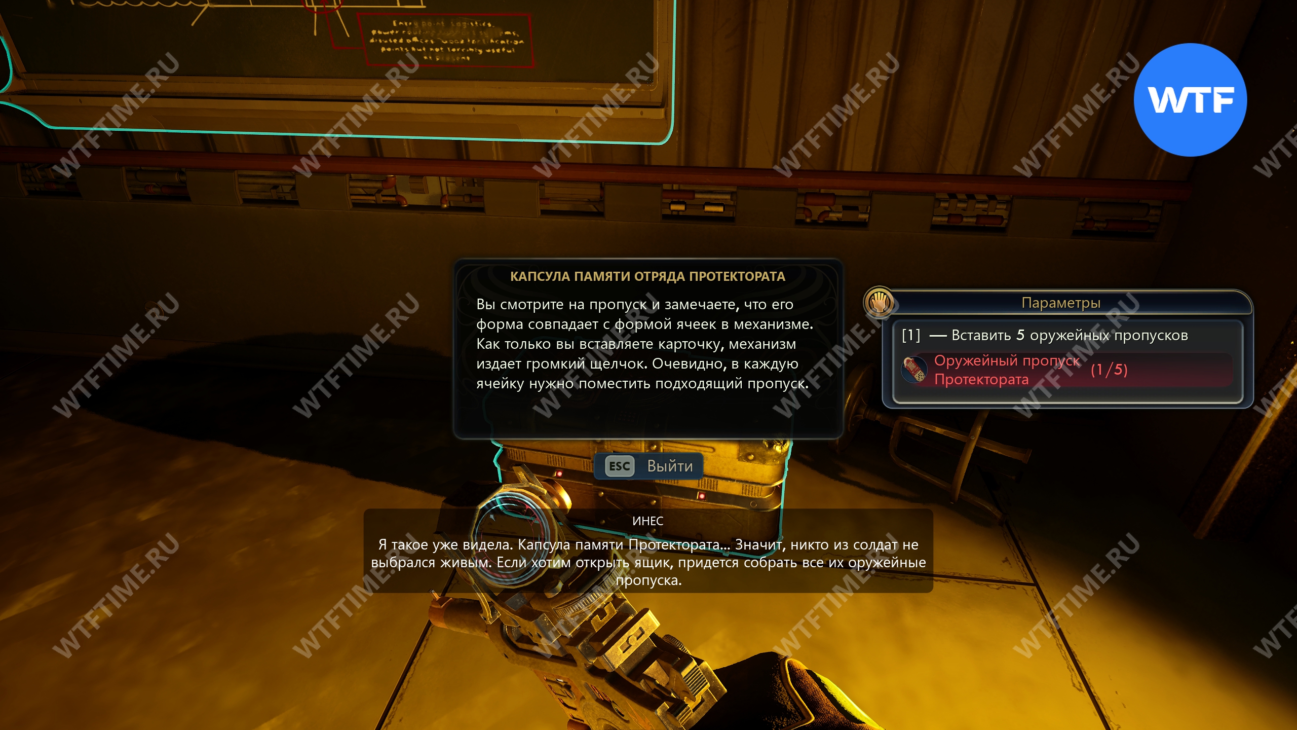Осмотрев контейнер, вы выясните, что это не что иное, как капсула памяти отряда Протектората, и для её открытия вам потребуется найти 5 оружейных пропусков, хранящихся на телах солдат по всей станции.