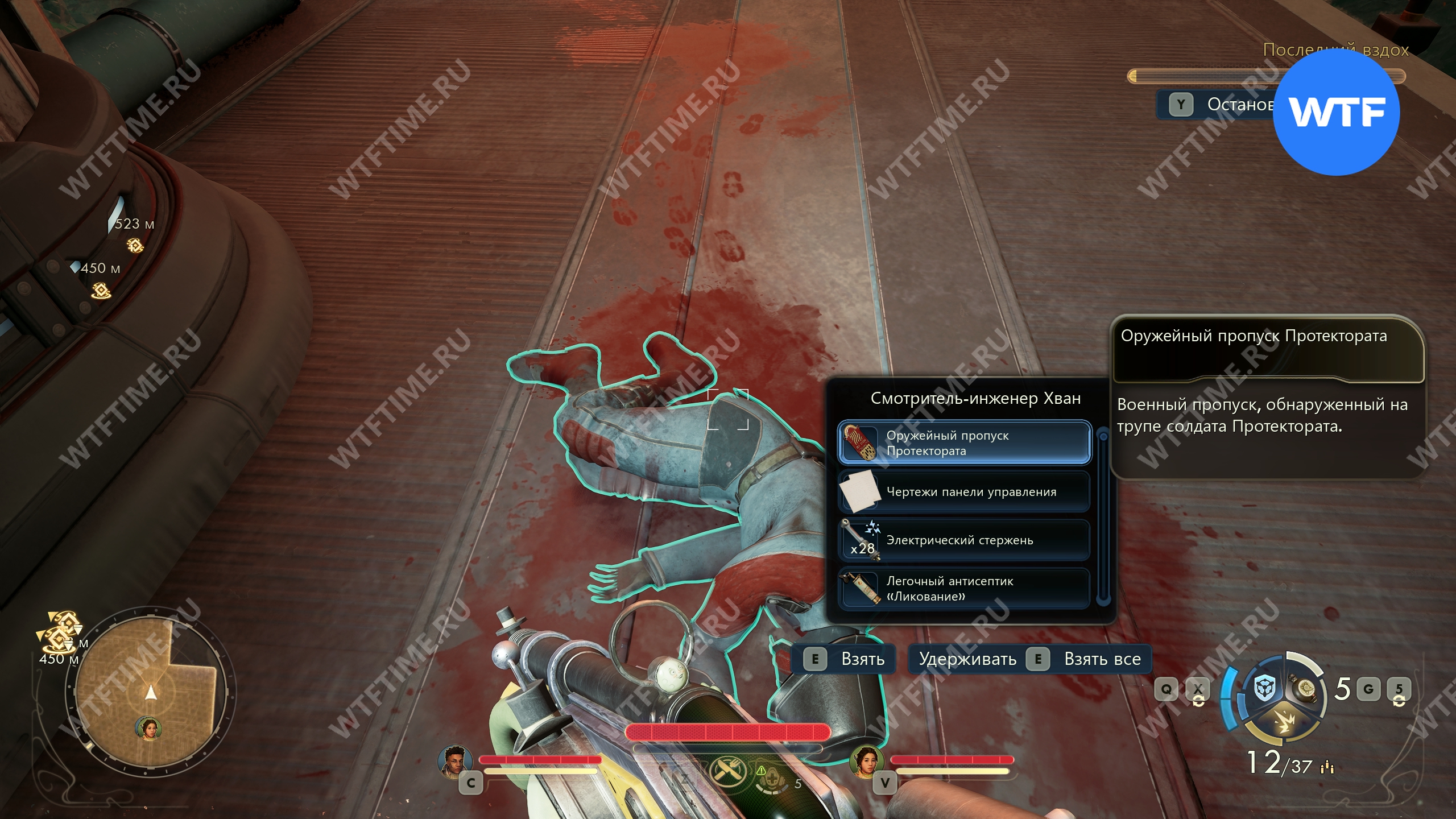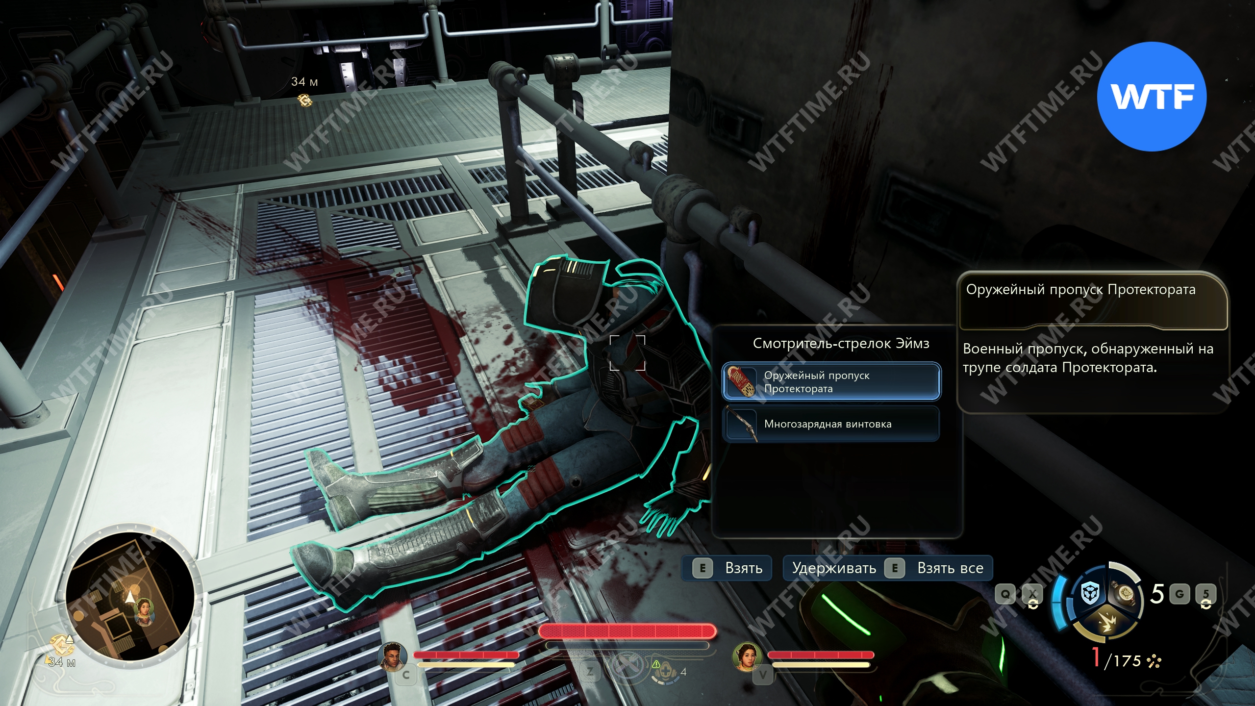 Затем идите к двери перед вами и выходите на улицу. Из стены слева будет торчать уникальное оружие «Громовержец», а с тела спереди можно забрать последний оружейный пропуск.