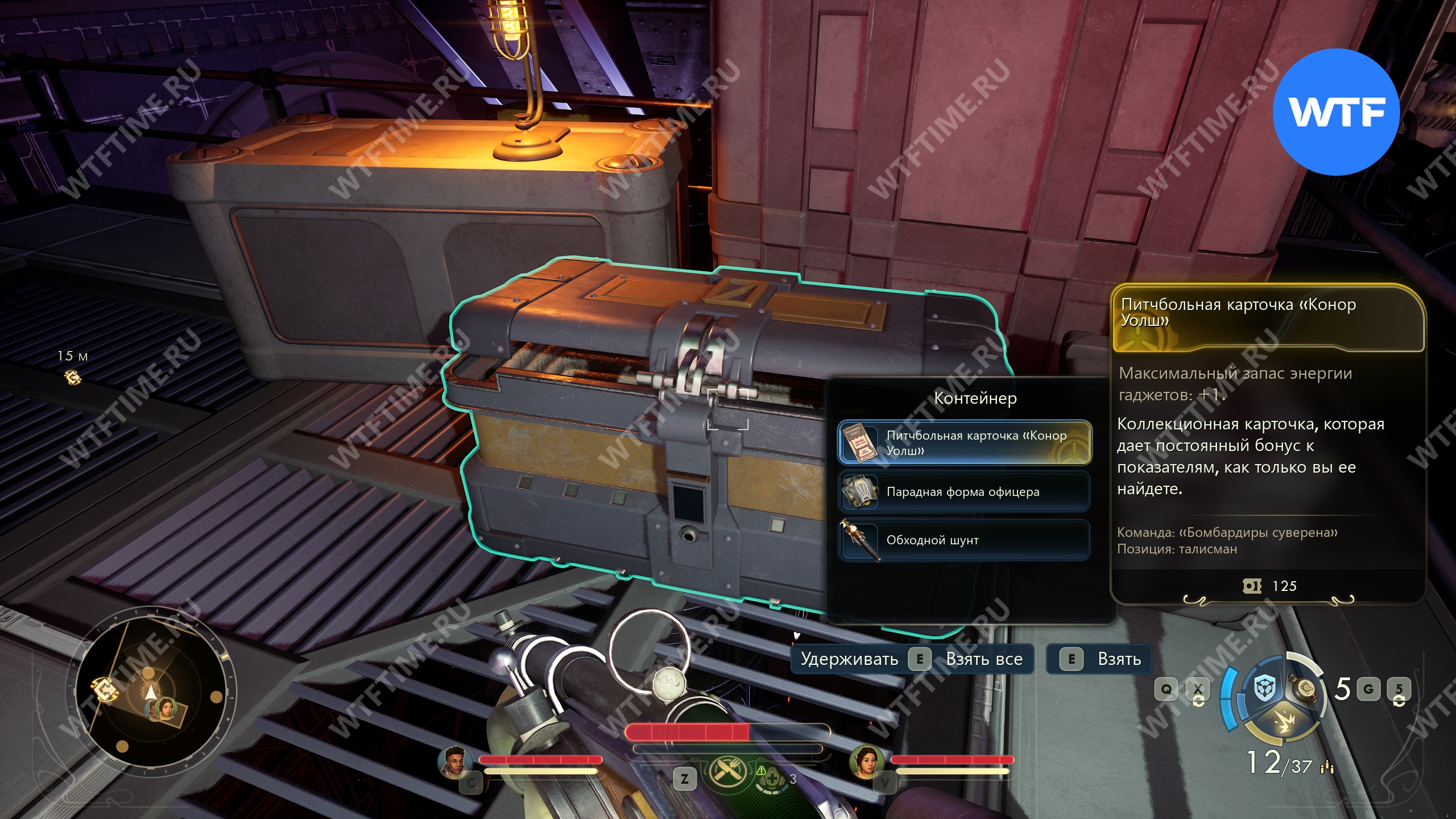 Первым делом подойдите к большому сундуку справа от вас и заберите из него питчбольную карточку «Конор Уолш», дающую +1 к максимальному запасу энергии гаджетов.