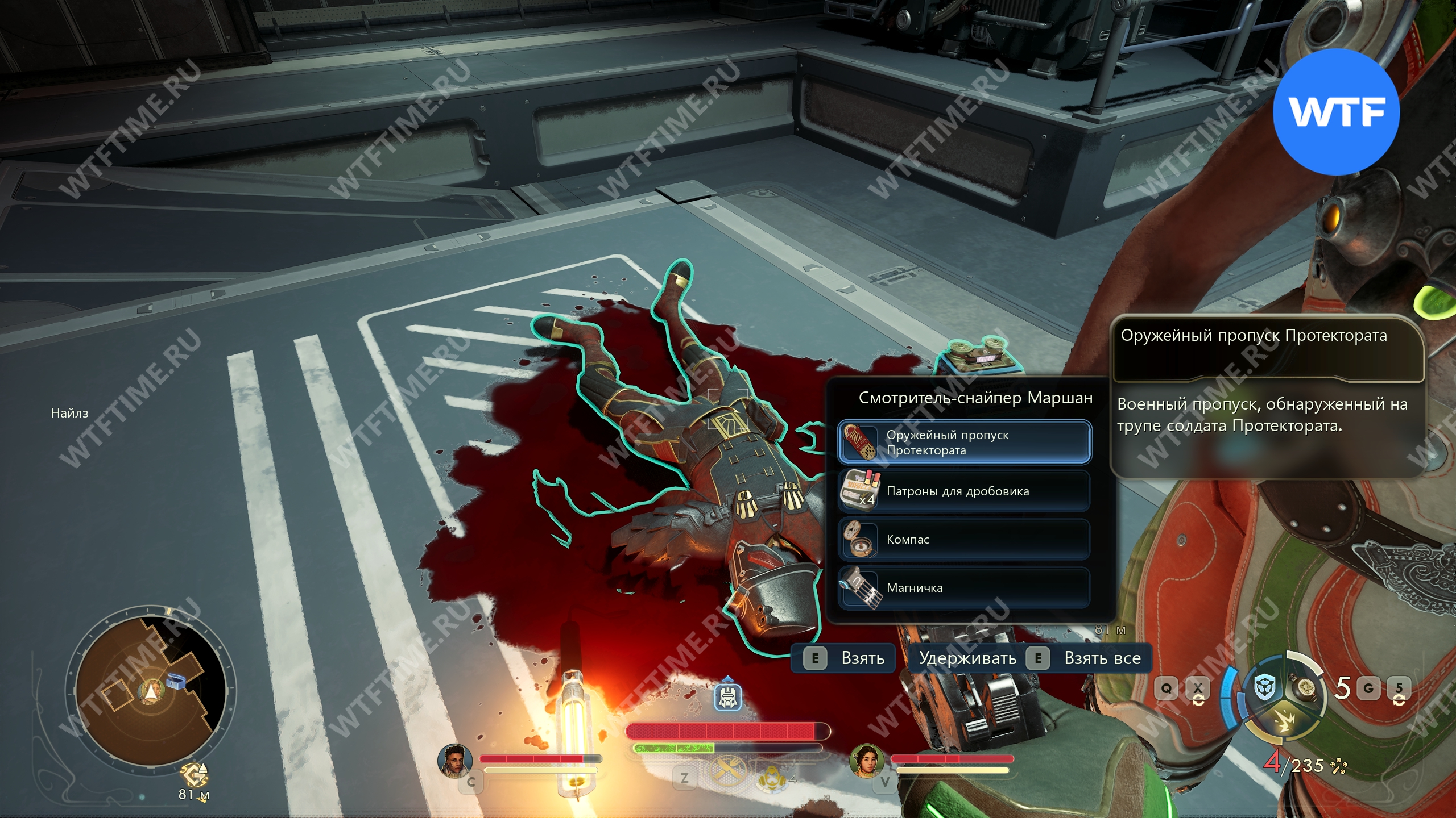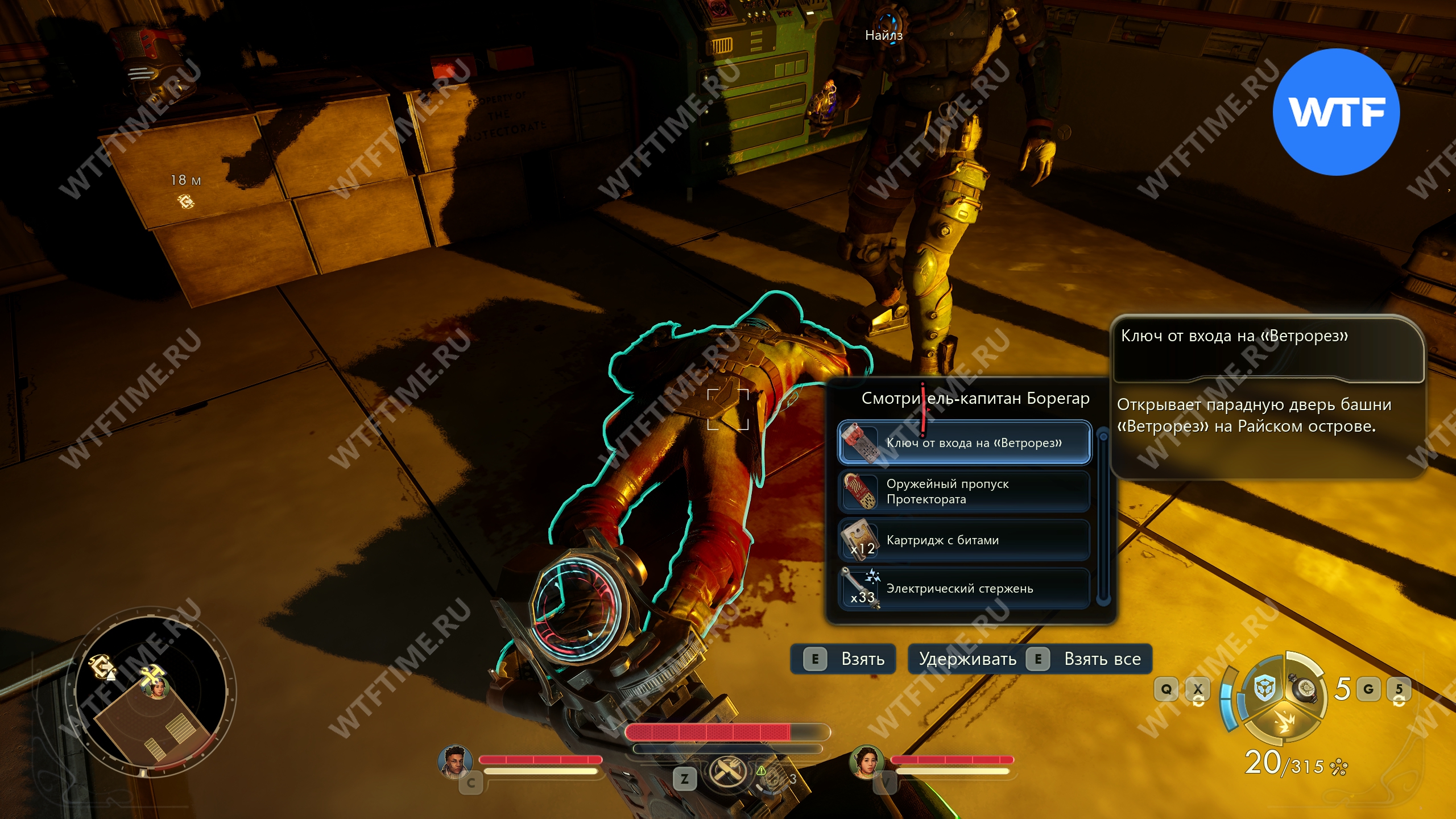 Чтобы найти первый оружейный пропуск, далеко ходить не придется. Осмотрите тело, лежащее рядом с сундуком. В кармане смотрителя-капитана Борегара вы также найдете ключ от входа на «Ветрорез», дающий доступ в другую часть станции.