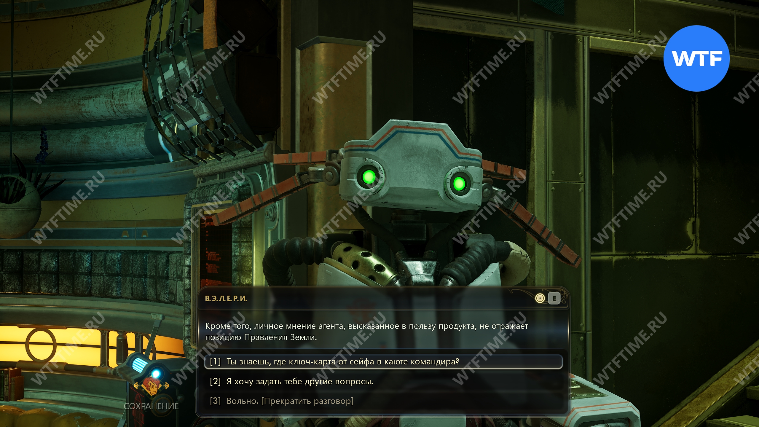 Если сразу же отправиться к роботу, то скорее всего нужный вариант диалога просто не появится. Нам удалось поговорить с ВЭЛ только после того, как мы нашли 4 улучшенных дешифровальных ключа для выполнения её персонального квеста «Здоровье и долголетие».