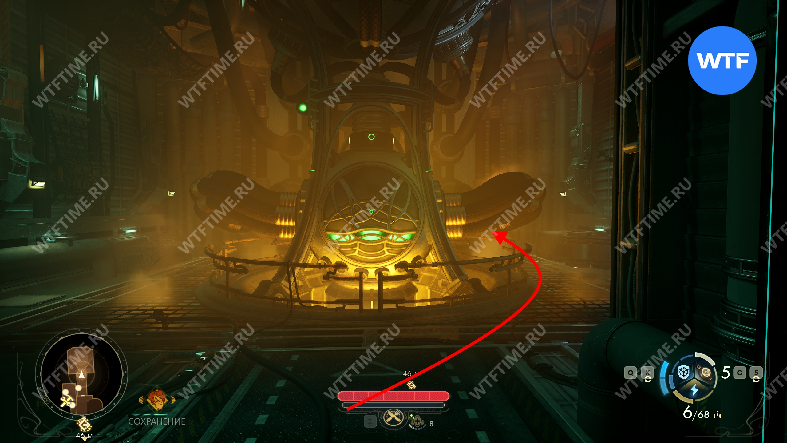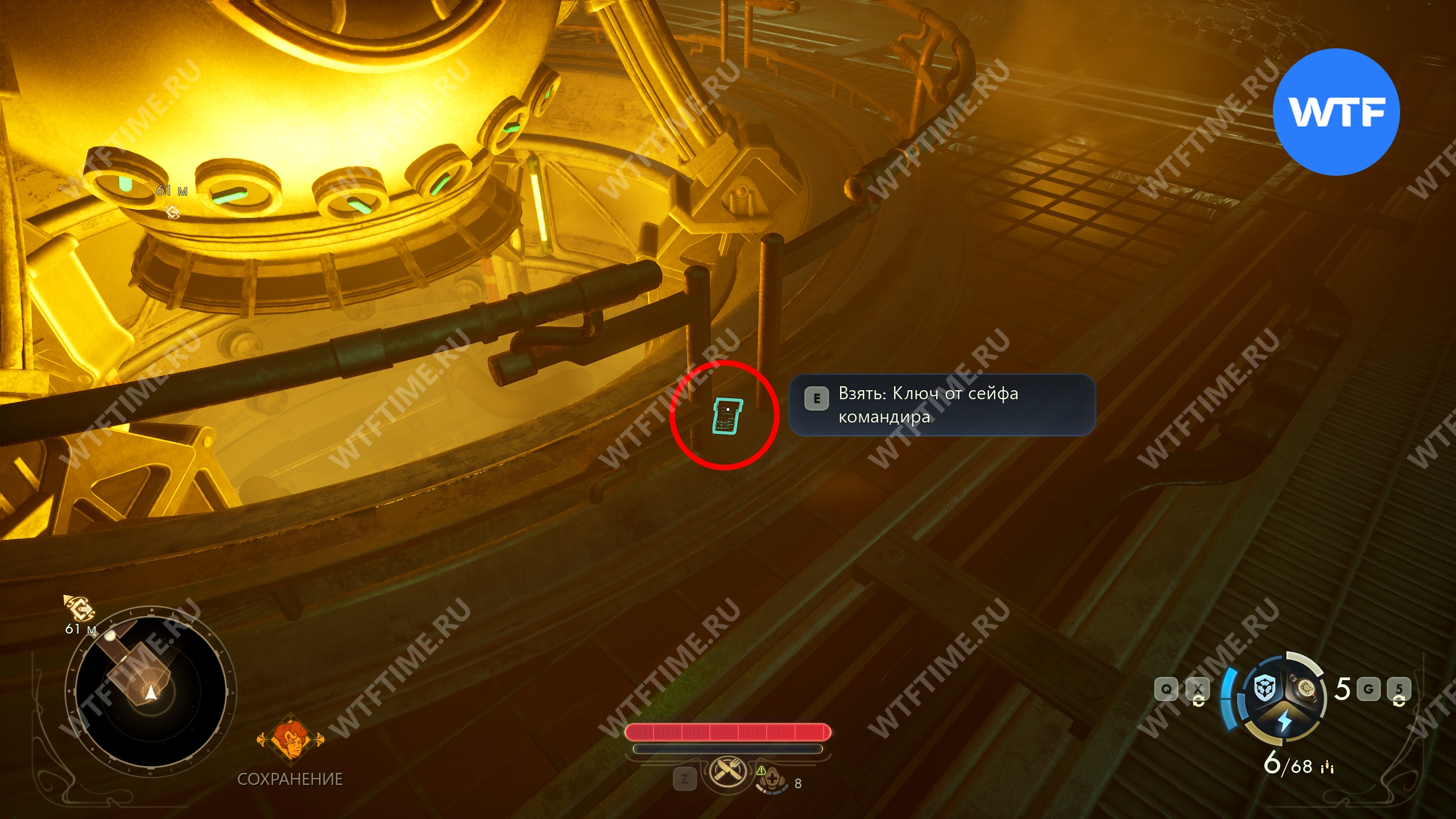 Машинное отделение находится в южной части корабля. Вам нужно присесть и пролезть под трубами, чтобы добраться до ключа от сейфа командира, лежащего на бортике в дальней части комнаты.