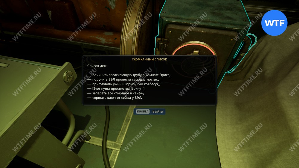 Чтобы получить подсказку к поискам ключа, подберите Скомканный листок, лежащий рядом с сейфом. В нем говорится, что нужный вам ключ Найлз спрятал где-то у ВЭЛ.