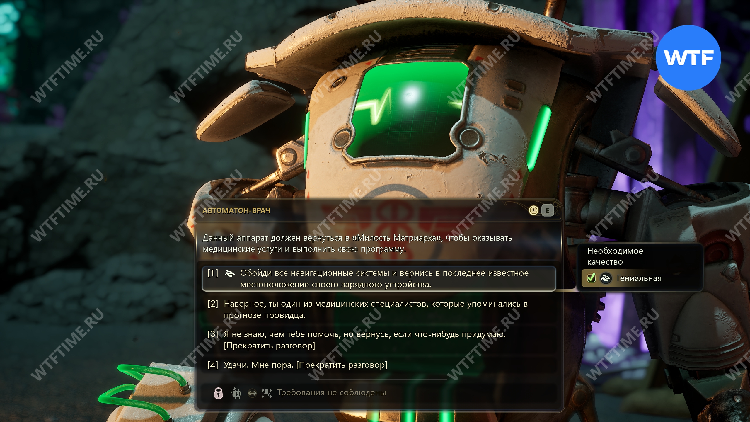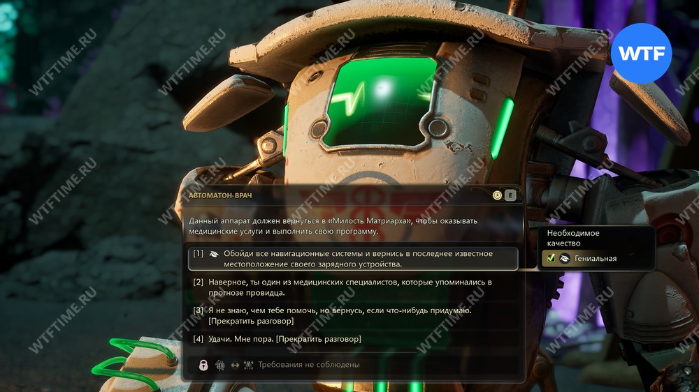 Поговорите с автоматоном и он попросит вас о помощи. Однако сделать это можно только при наличии качества [Гениальный], либо связки из навыка [Взлом 8] и способности [Анатомия автоматонов].