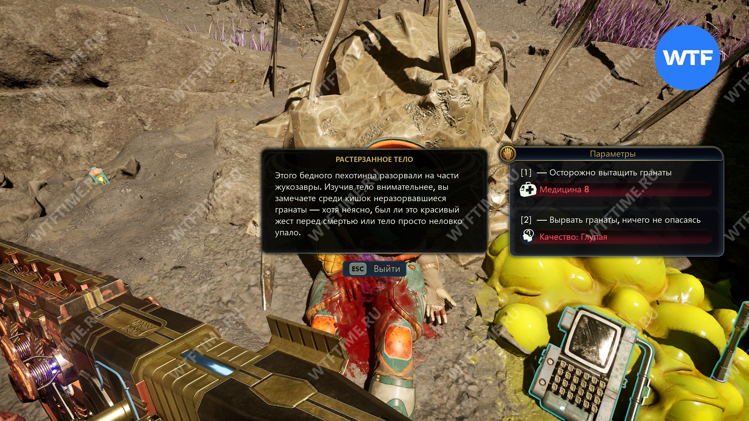 При наличии навыка [Медицина 8] или качества [Глупый] вы также сможете вытащить гранаты из его тела.