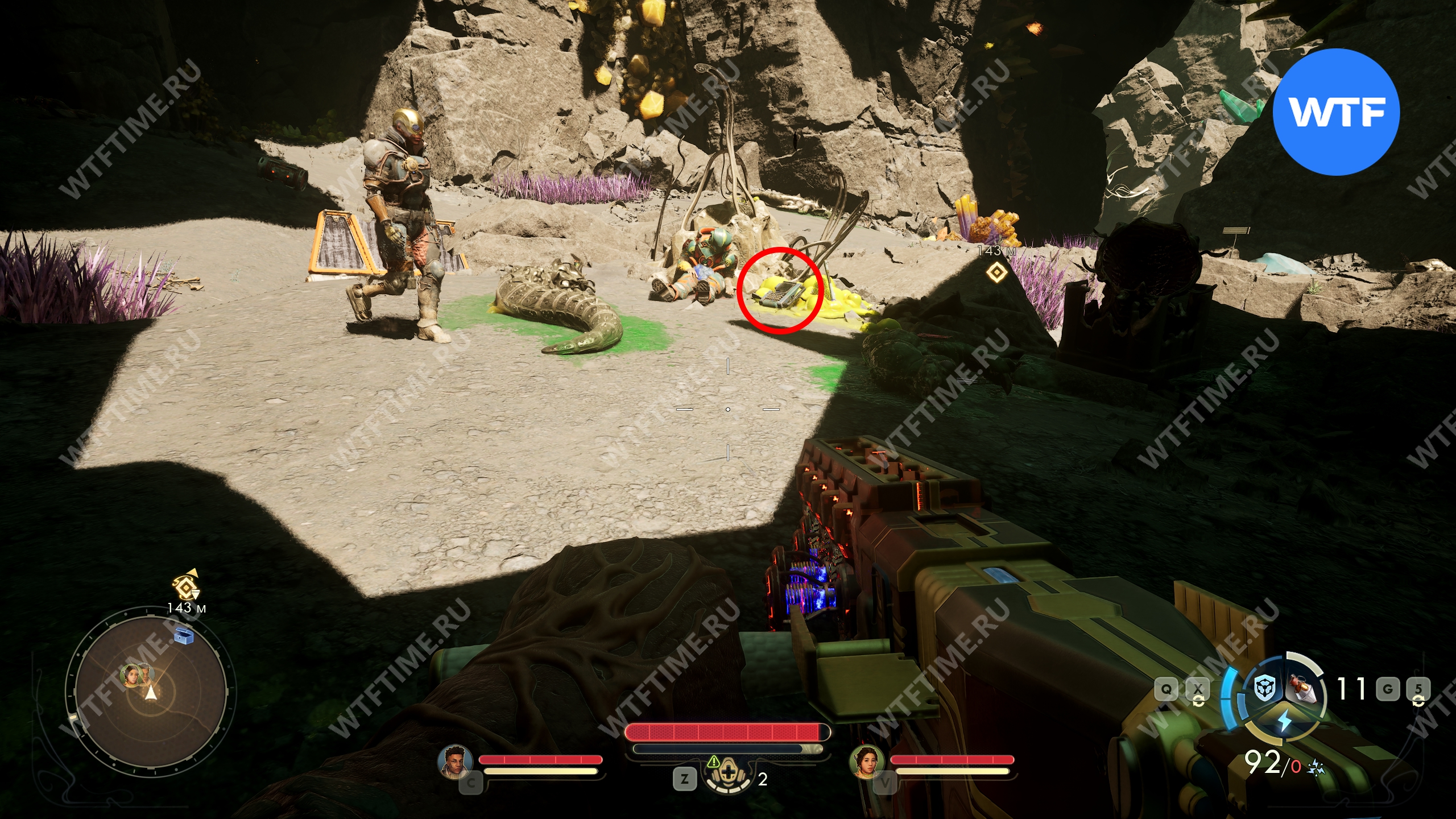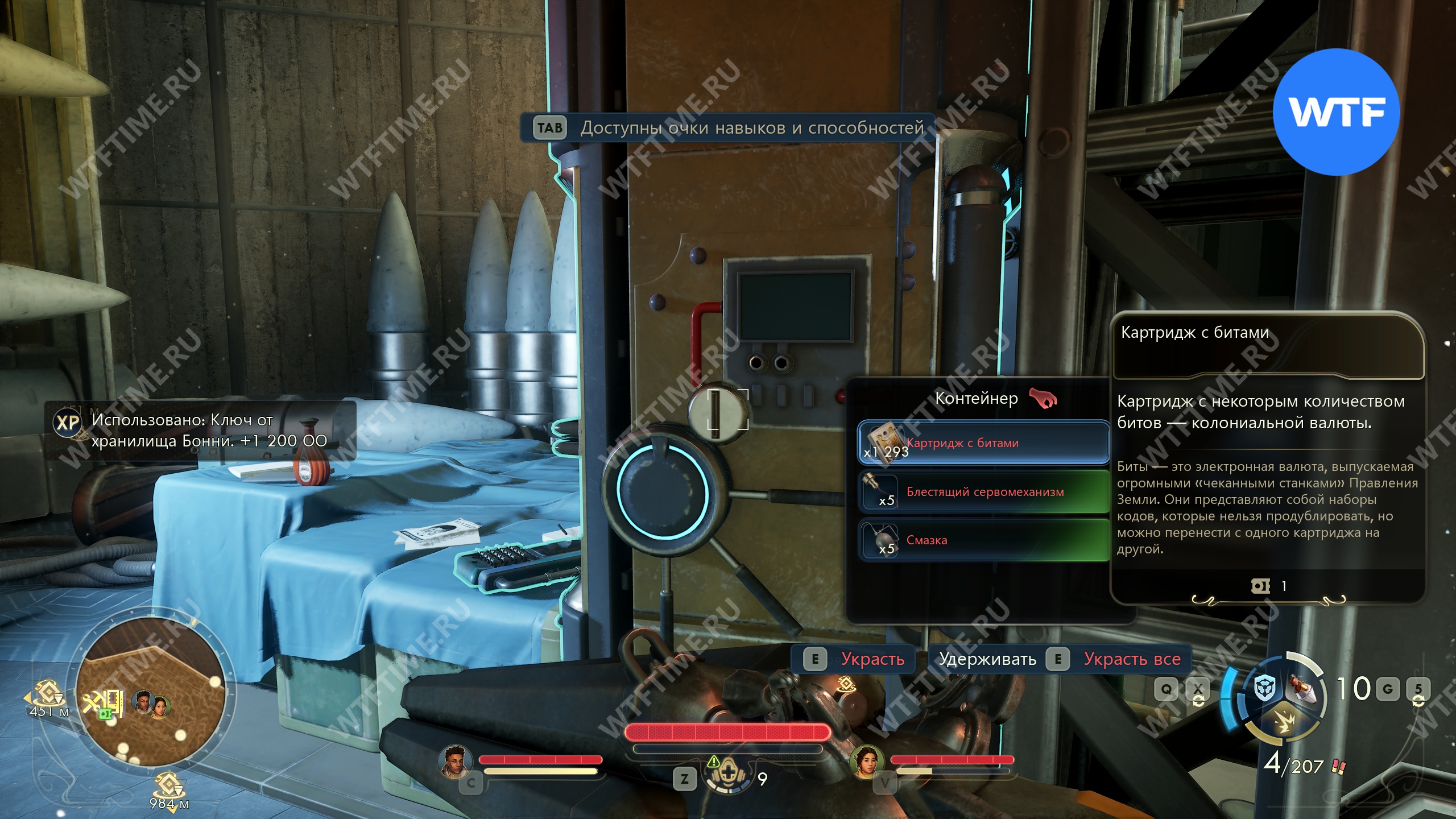 Он открывает запертый ящик слева от её магазина, внутри которого лежит картридж с 1293 битами, 5 блестящих сервомеханизмов и 5 смазки. Заберите их в качестве дополнительной награды за прохождение квеста «Добыча полезных личинок» в The Outer Worlds 2.