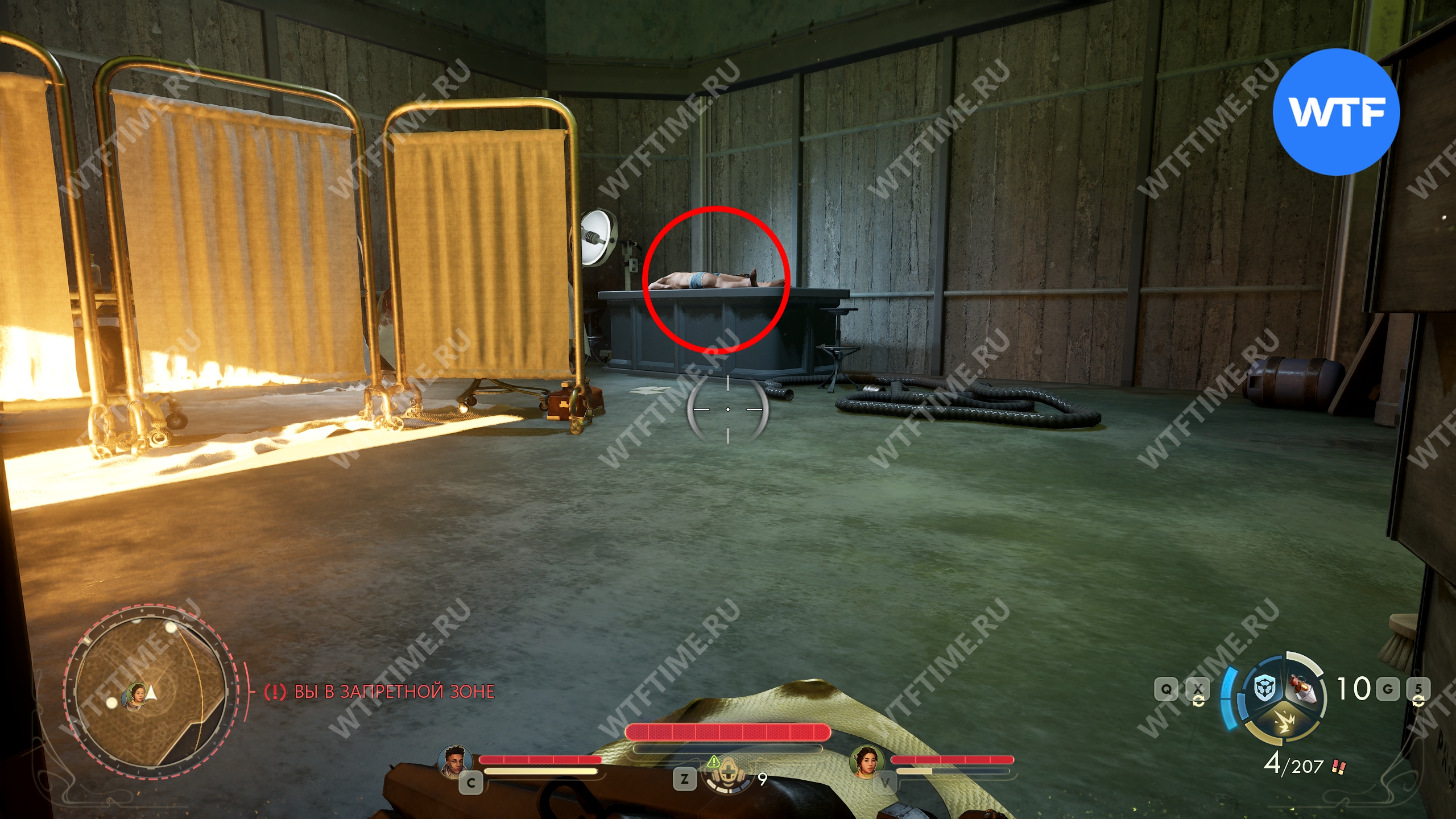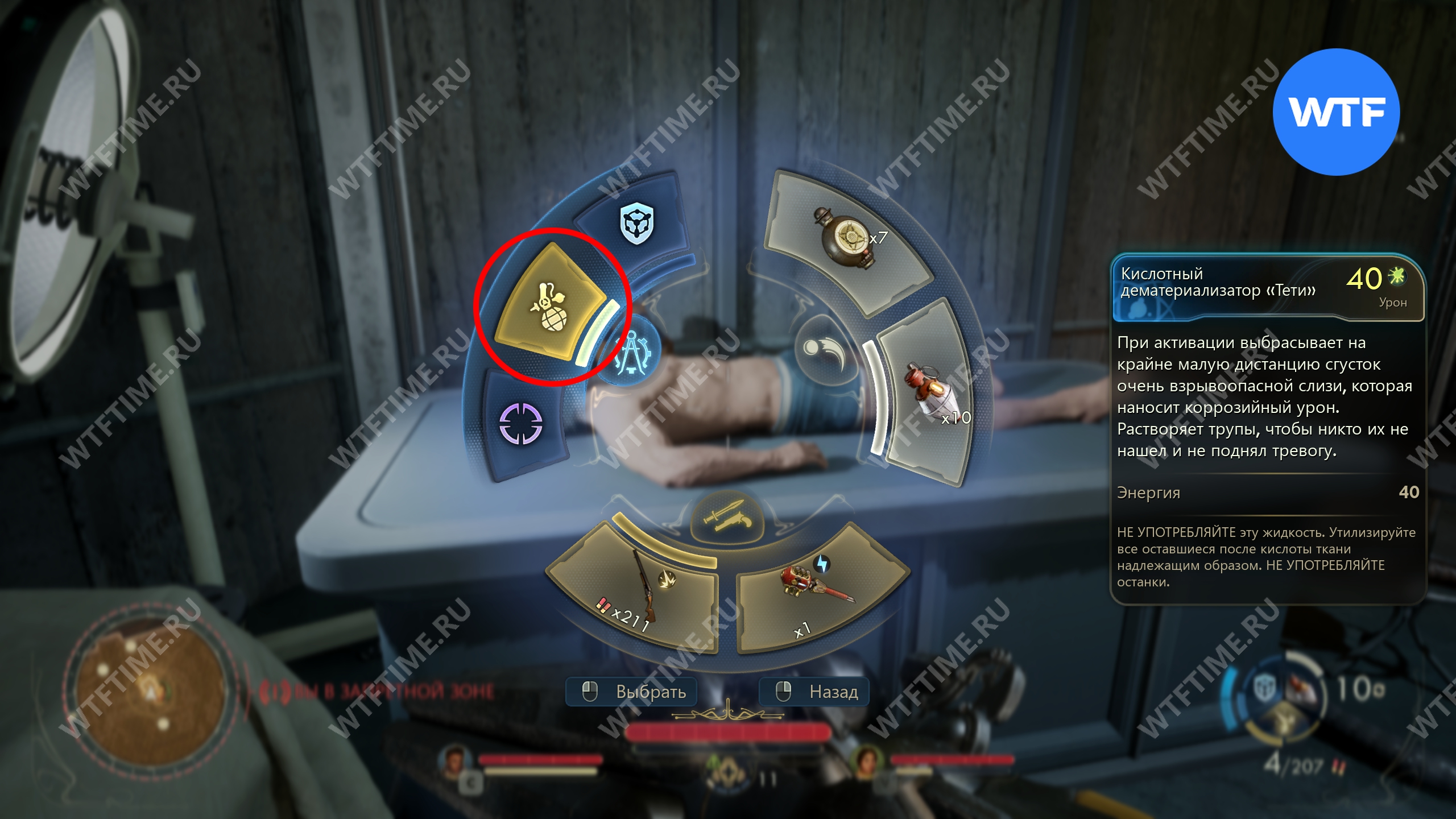 Нужное вам тело будет лежать на столе за ширмой в углу. Чтобы выполнить задание, откройте колесо выбора оружия и переключитесь на нужный гаджет (см. скриншот 2). Затем используйте его на теле начальника Кадди, чтобы вместо него осталась зеленая лужица.