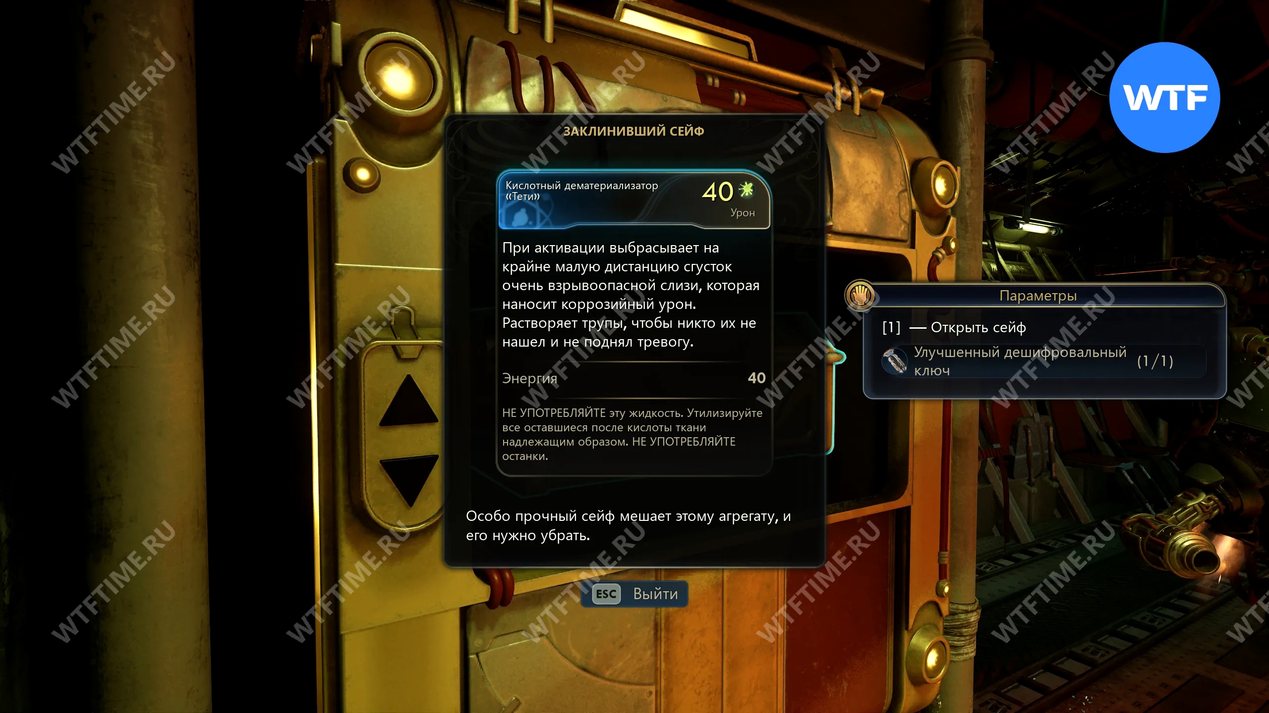 Кислотный дематериализатор — это особый гаджет, который позволяет расщеплять тела. Скорее всего, вы уже получили такой из заклинившего сейфа на корабле «Инкогнито», который показала вам ВЭЛ.