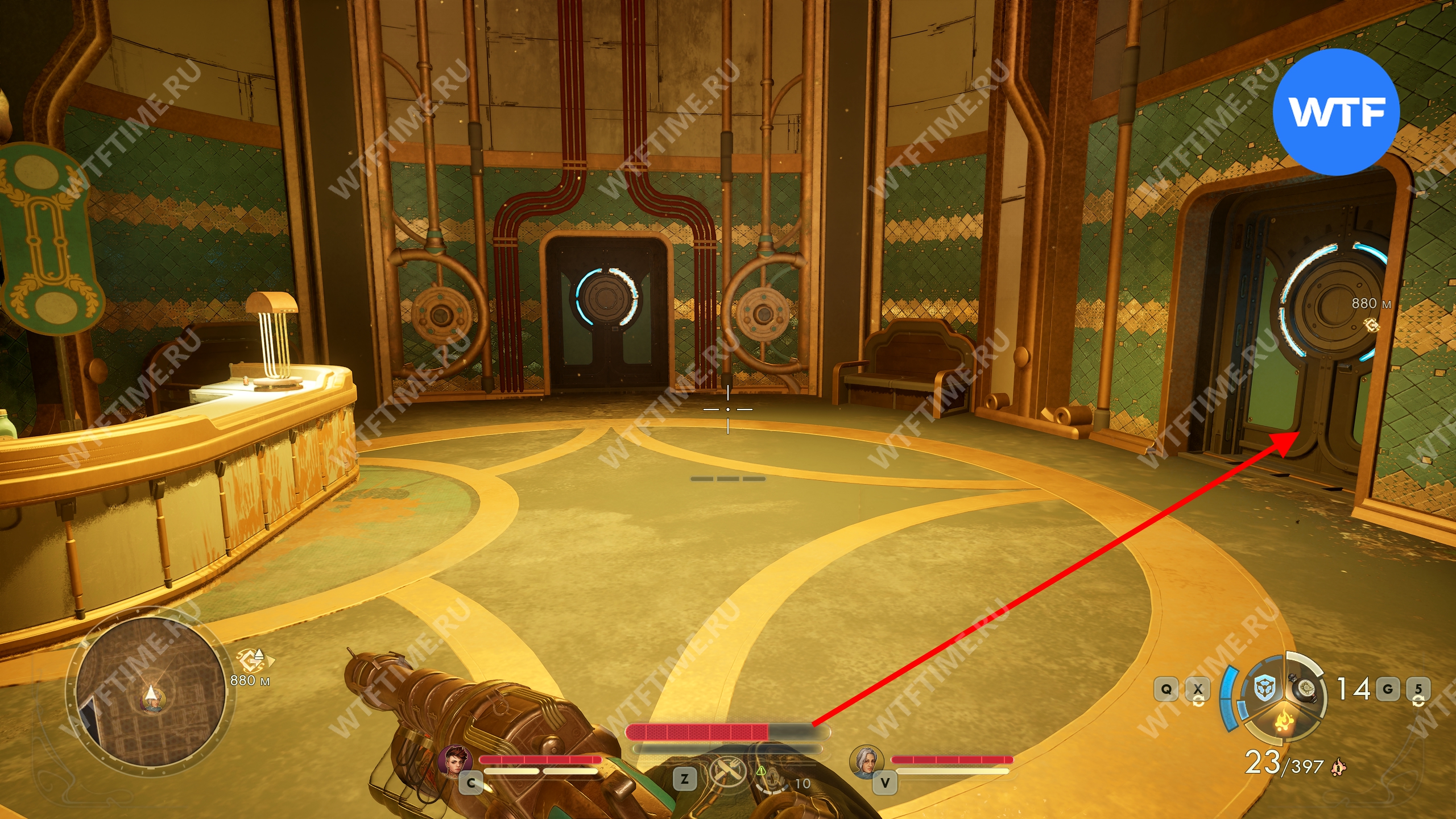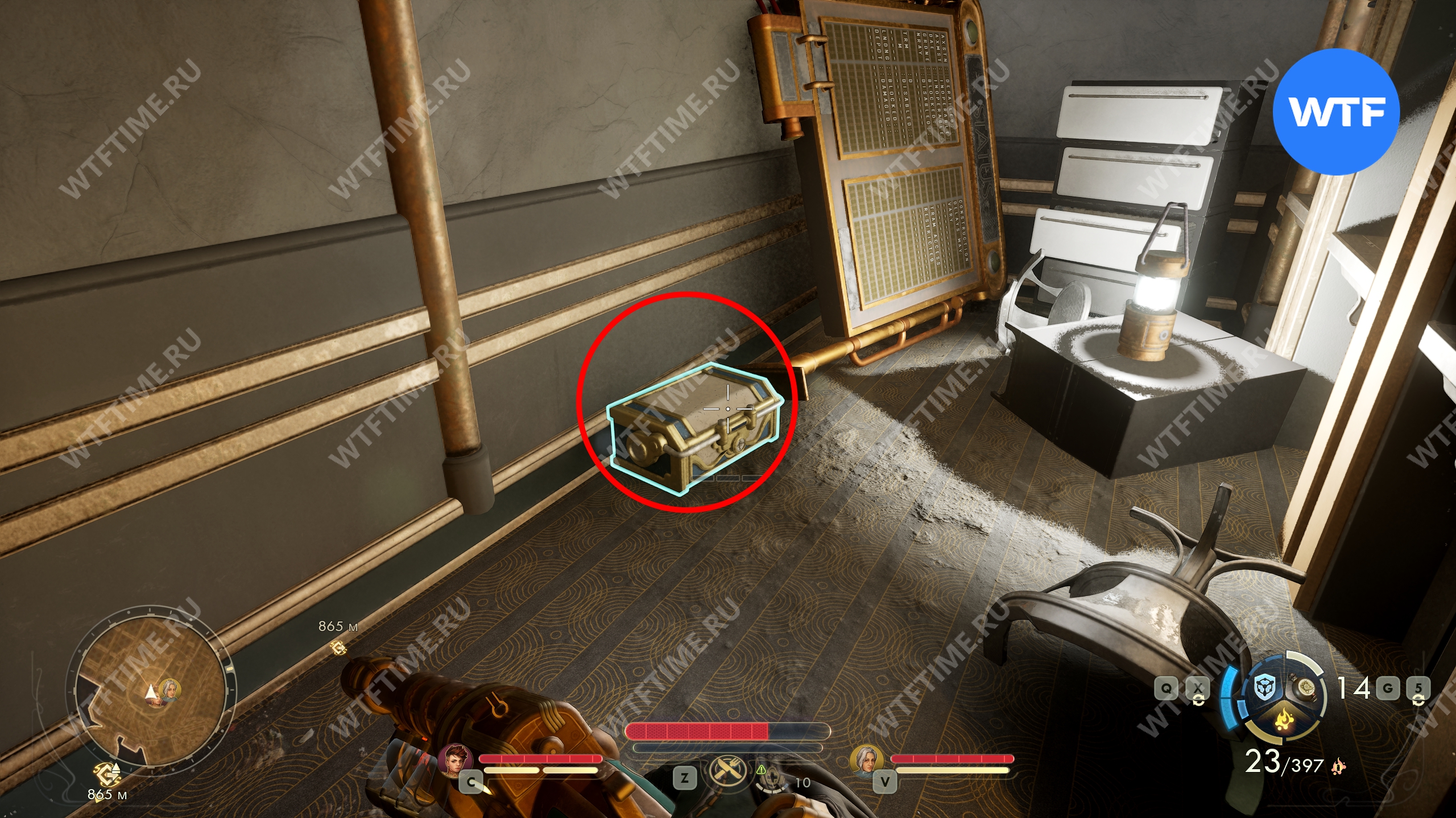 Поднявшись на лифте, сначала пройдите через двери справа и заберите со стены фрагмент панно для побочного квеста «Посегментные поиски пентаптиха». Затем загляните в билетные кассы напротив панно и заберите оттуда особо прочный сейф с окуляром исследователя.
