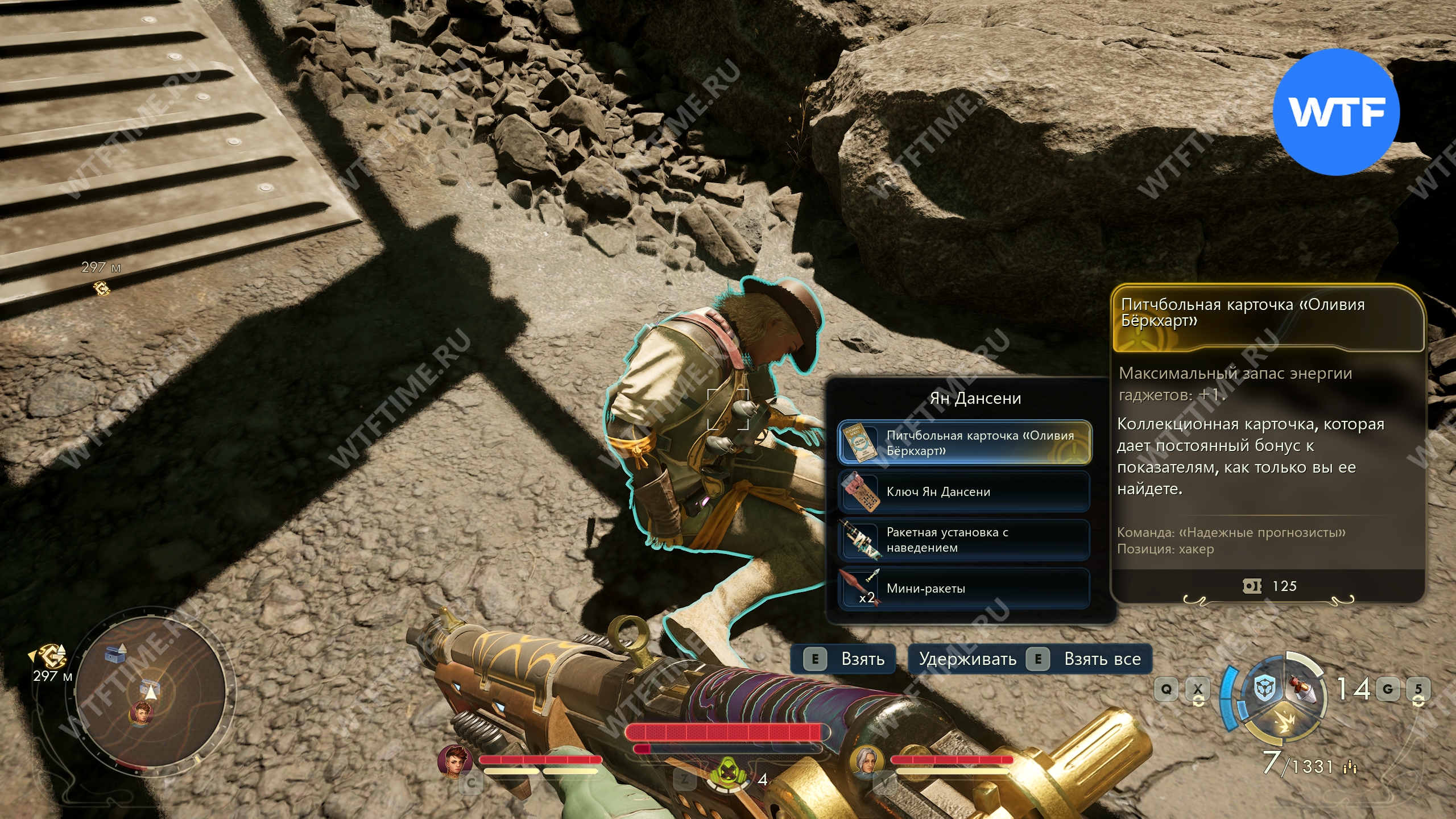 Разобравшись с вашей целью, заберите с её тела питчбольную карточку «Оливия Бёркхарт», ключ Ян Дансени, а также ракетную установку с наведением и парочку мини-ракет.