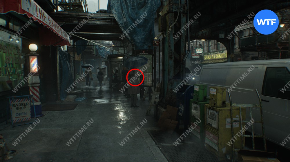 Идите вперед по улице, пока не увидите справа от вас карту города. Подойдите к ней, чтобы забрать путеводитель по Рэнвуду — это второй документ, который вы должны найти.