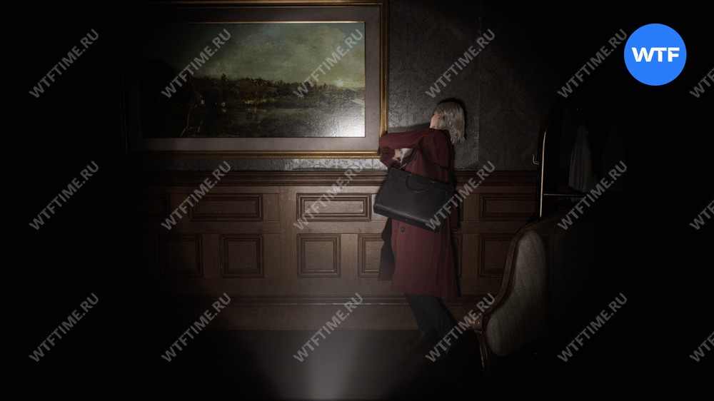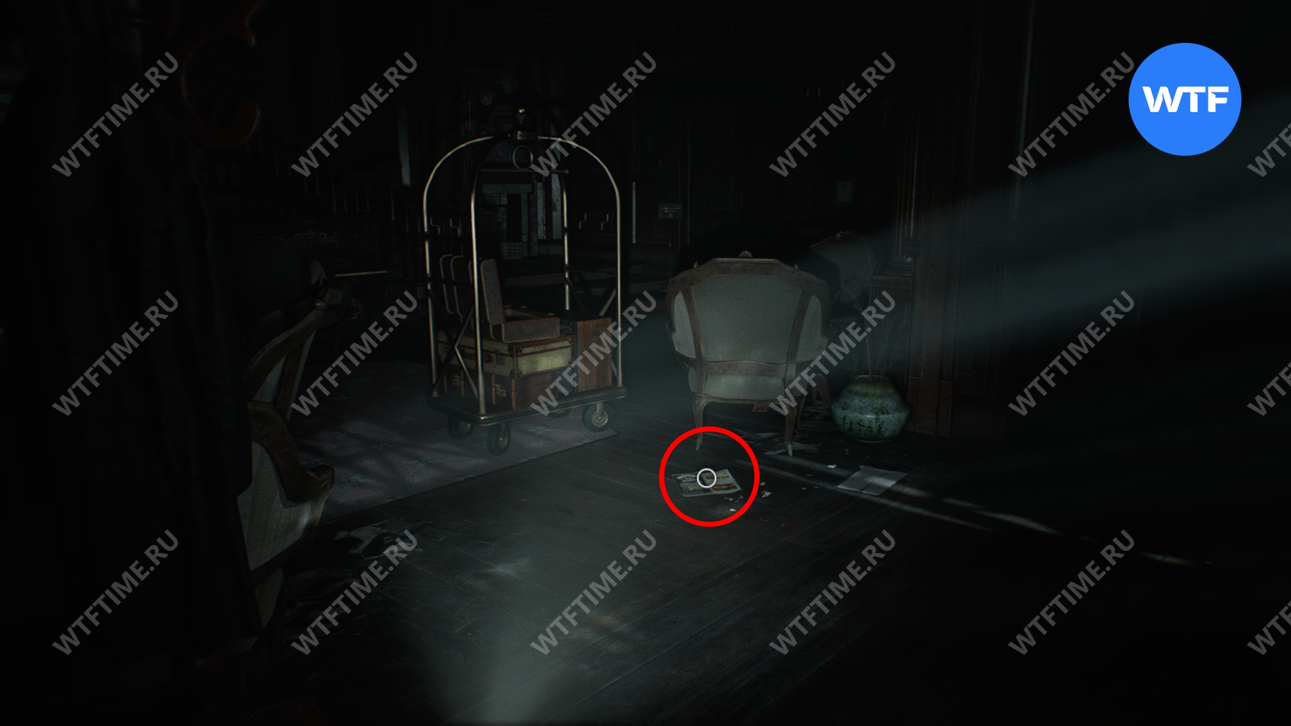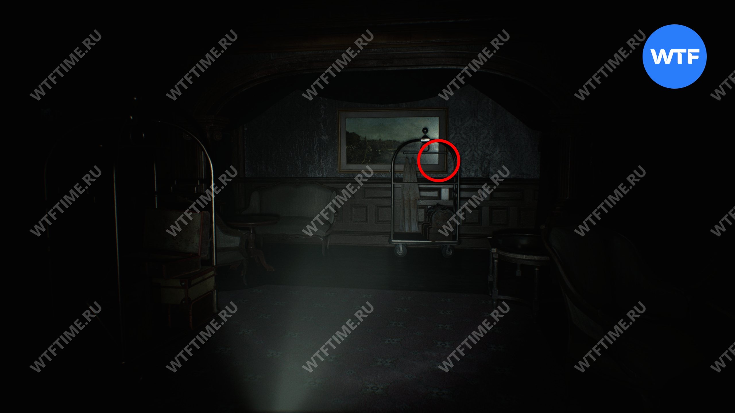 Вернувшись в настоящее время, спуститесь обратно в вестибюль и отодвиньте тележку с вещами, стоящую у западной стены. Затем загляните за картину, чтобы найти нужный вам предмет.
