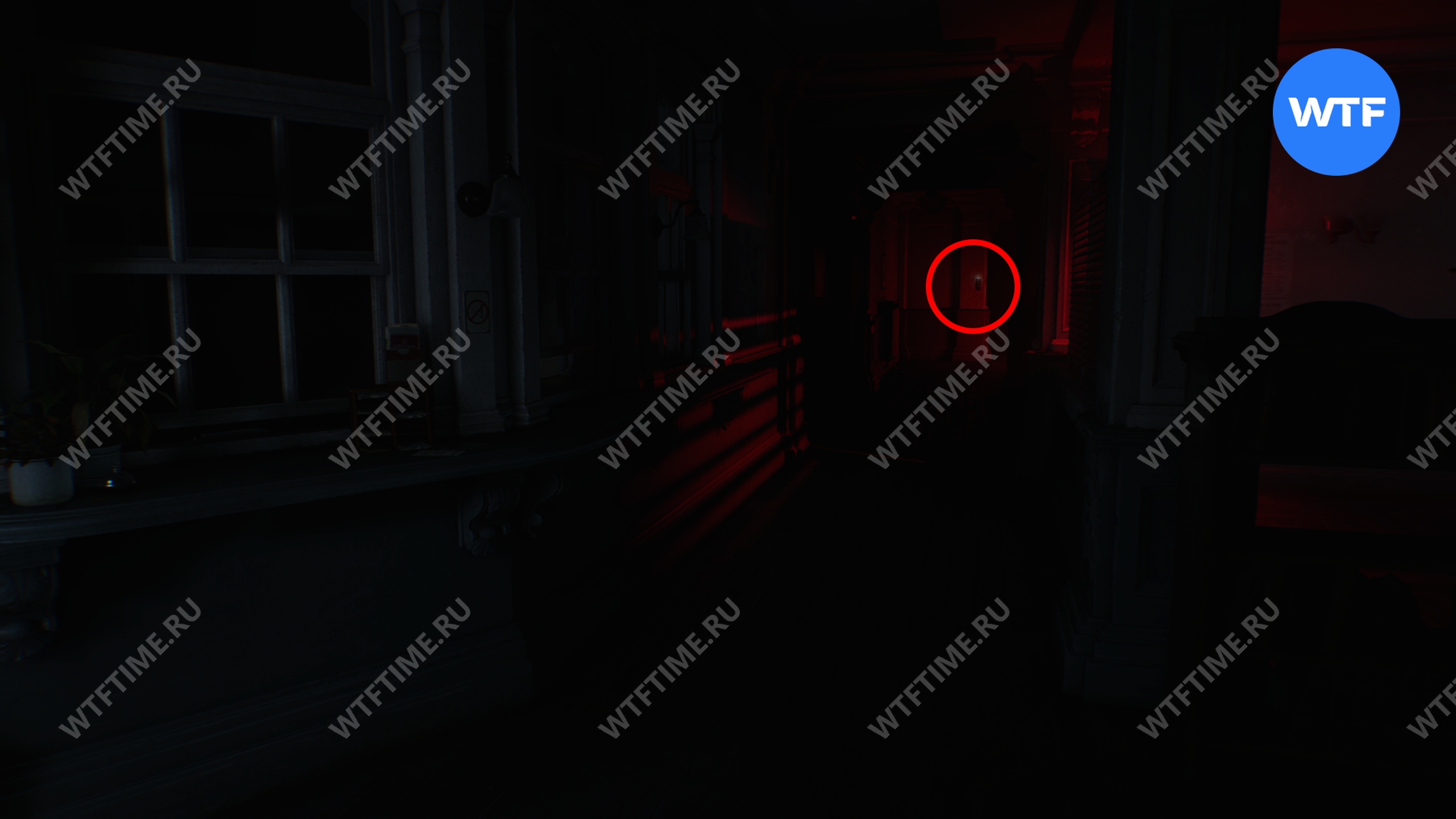 Покиньте палату 203, затем идите по коридору вперед и поверните направо, в сторону красного свечения. Ваша цель — выключатель у дальней стены, который включит освещение впереди.