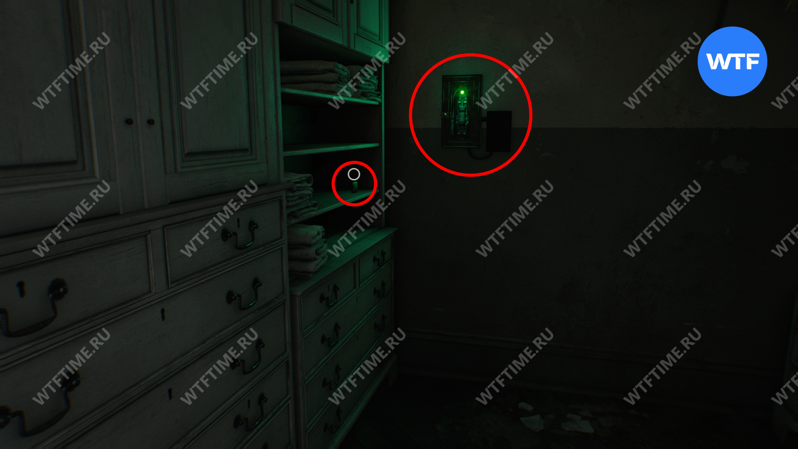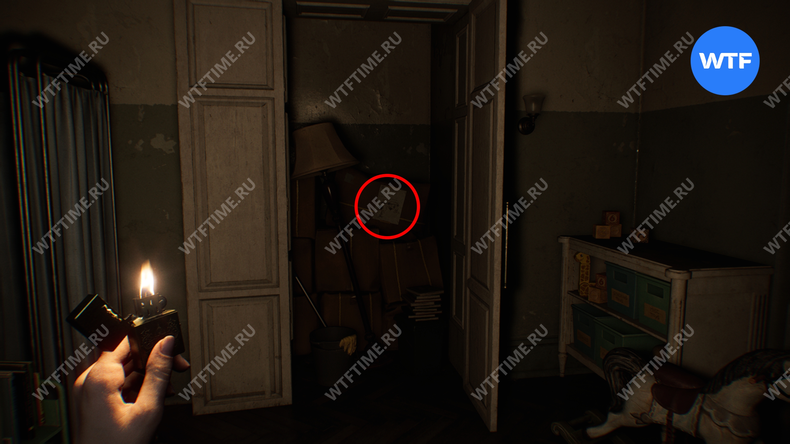 Загляните в шкаф и прихватите оттуда пустую бутылку, а затем идите в гардеробную. На стене вы увидите закрытый щиток с предохранителем, а на полке слева — зажигалку, которая позволит вам осмотреть все темные помещения.